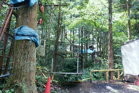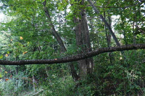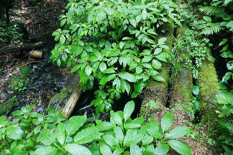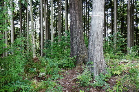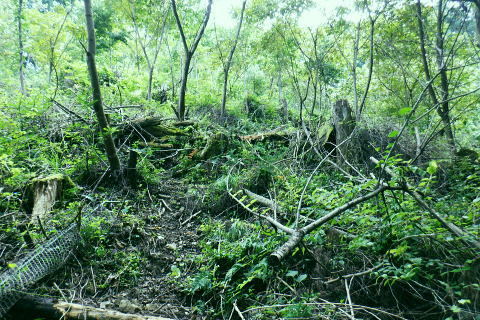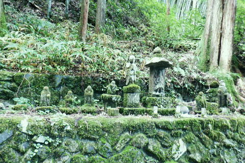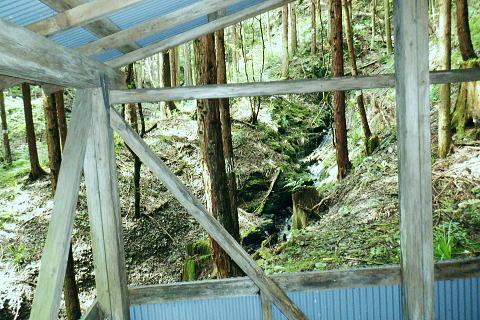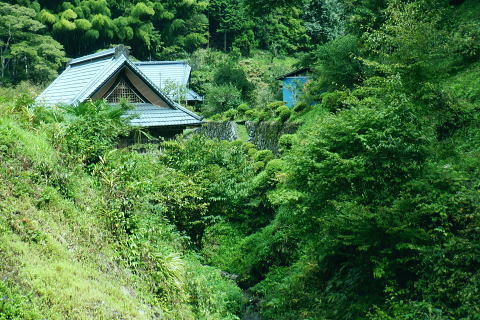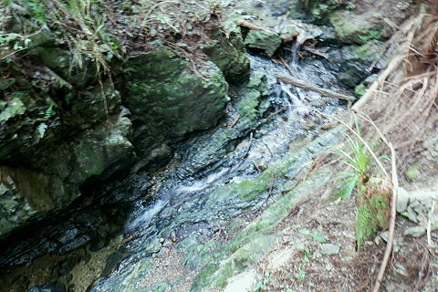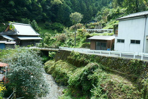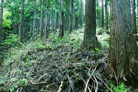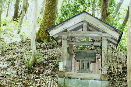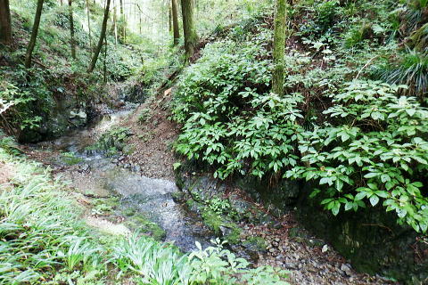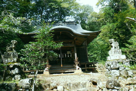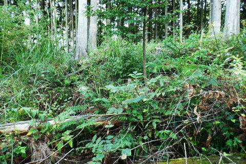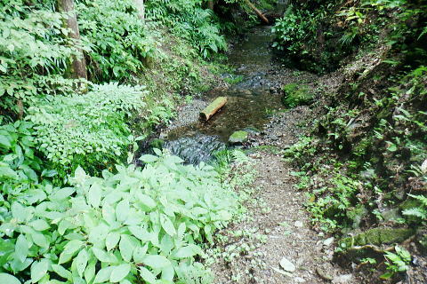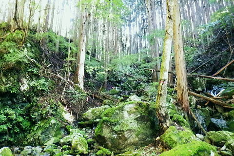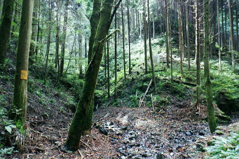 | 中谷山.醍醐周辺・・要倉峠越えで要倉へ下り.中谷山の510m圏コブ(堂所?)へ登り返す 醍醐の古道と真峯嶺からの参詣古道を綴る。 要倉沢二俣から要倉にで醍醐大橋から龍蔵神社. 真峯嶺峠から490m圏コブ.熊野神社.参詣古道を綴り中谷山へ。510m圏コブ. 下案下から要倉峠越え要倉沢二俣 二俣を下り真峯嶺峠を経て再び背稜の中谷山・堂所 蛇ノ沢右岸尾根から古道.鉄塔巡視路を経て醍醐道.関場 要倉沢二俣 右俣脇に二俣小屋が建つ.10:11正面は左俣の要倉沢.右俣の右岸に確りした作業道が付けられていた。左俣の作業道を真っ直ぐ進むとそのまま右俣の右岸道に入る。 左俣のバチザク出合からの中間尾根を詰めると御堂窪山(本郷山)に至る。劇尾根. 朽れた二俣小屋・・室内を囲む長椅子は崩れ落ちている 壊れた側壁越えの右俣の流れ左岸道は左俣と分かれる高みから綴られている。そして真を開けず.立派な沢沿いに変わっている。 それに比べ両沢のも出合は何と貧弱な平凡過ぎる小沢の出合に思えた。 部分的な雍壁・・本流左岸道より要倉山北尾根の末端 左側が要倉山北尾根で正面が側枝尾根.10:20薄日が差し素敵の思えた小沢との出合広場。龍蔵神社の裏から詰める藪尾根よりすっきり登れそうだ。 直ぐ下流の後側・・以前右岸に渡る橋が左脇にあった.10:21橋桁の抗は既に失われている 確りした苔る桟橋ここが以前高度があり怖かったという桟橋か? 右岸から渡渉し振り返る.10:27 里に見えた要倉「くまだんご」 民家の玄関前を通らして頂く 醍醐大橋より下流を眺める.10:32左が「くまだんご」で.右上の民家から石段で里道に降りている。大橋を渡り醍醐道に入る。 左に折れ醍醐林道を400mほど進めば.支線のニニク沢林道との分岐にでる。古道「醍醐の道しるべ」が分岐中央にある。 「道しるべ」に従い古道をニニク沢沿いに入れば嫁取り坂から檜原へ。左に醍醐林道伝いに進めば和田から佐野川に至る。 私は「道しるべ」のポイントまでを割愛し.右に折れ龍蔵神社から熊野神社.参詣古道へと出向く。 今も活用されている2つある醍醐川の荷渡し場 醍醐道から龍蔵神社の参道登り詰めると中央脇に神木の大杉が聳える。 参道に通じる街道の両脇の草刈りをしていた老輩.柄を長く延ばし上部も刈っていた。する人がいないので自主的に行っているとのこと。 「綺麗になりますね!」と堪えると笑顔が素敵だった。龍蔵神社に参拝し.広い境内の片隅でで早い昼食を摂る。二度に分けサンドイッチを。 龍蔵神社 10:40昼食11:15北尾根 神社裏の尾根が要倉山北尾根.北西尾根は? コブを左に巻き.右下に作業小屋が見える。 細い尾根は激坂.巨樹のモミの根元.角度を直登.3本. 要倉山北尾根に乗る。要倉山を下った時は左のクヌギの樹が目印.二又折れ. 快適だが急坂の北尾根を上がる。頂には黄色いプラ杭あり。 549m地点から功刀沢林道の下降点.竹林は行き過ぎ.白帯は南南西側に下る。踏み跡はほとんど消えているので尾根を外さぬこと。 左から林道が延び.更に道なき道を下って.先程の林道の下部へ下りる。 前回訪れた時から既に6年目を迎えていた。師走で寒かった覚えがある。今回は給水吸タオルを首に巻き付けていた。 社殿奥から北尾根を詰めれば要倉山にでられる。繋げればコースは幾らでも取ることができるだろう。ここでお会いしたのが 山越先で農業を営む方. 写真が趣味でコロナで遠方に行けず.久し振りに訪れたとか。カメラを4つも首に.肩にかけていた。 六地蔵 真峯領峠(まみね)への山道より.11:20軽く昼食を摂り.醍醐道を下って大丸,左岸からナロシ沢が入り込む。向かいから小橋を渡って旧道から真峯嶺峠へ至る。 確りした旧道で.左後方から六地蔵ノ沢が接すると右手に六地蔵が祀られていた。6年目の対面で苔が更に増しているような気がした。 真峯嶺峠 山神宮より真峯嶺峠340mと鳥居を見下ろす六地蔵ノ沢を木橋で渡り.過ってのガレ場を過ぎると直ぐ真峯嶺峠にでる。懐かしい質素な境内. 峠に素朴な鳥居があり.その奥に木祠が祀られている。杉林の透し上流側(左)に振宿の集落が樹間絡みに見下ろされた。 真峯嶺の住吉神社 立派な囲い小屋の中にある木祠.11:30明治5年10月.龍蔵神社に合社されましたが.昭和5年頃には非公式に元の真峰嶺に戻されている。 そのためでしょうか.龍蔵神社には両社の祭神が祀られていることになっているとか。醍醐川に沿った森久保・振宿.醍醐と 三集落の鎮守として.永享12年庚申(1439)の創建と言い伝えられている。・・「nobikitのブログ」氏より. 山神宮 明るい向かいの小尾根脇の台地で.11:33峠路を挟んだ向かいの尾根筋の右脇から,住吉神社を見下ろ所に「山神宮」の小さな祠が祀られている。前回気になっていた小さな祠と尾根. 囲む小屋が普通の祠サイズ.その中に小さな祠が祀られ.東方を向き.紙垂は尾根を横切り.潜って登るようなる。祭神は大山祇命. 山神宮が祀られていた小尾根に乗る 441m圏.小さなオレンジ頭の素板杭・・藪絡みに突き当たる.11:47小尾根は以外と切り開かれていた。この
