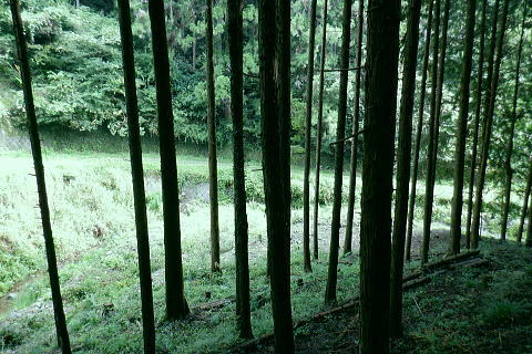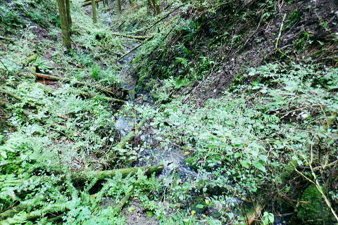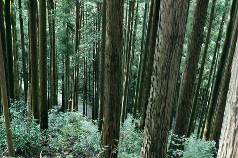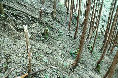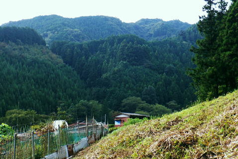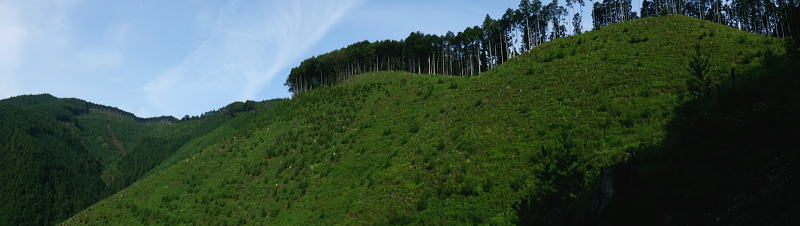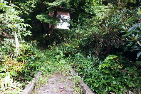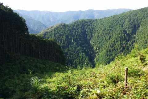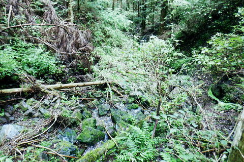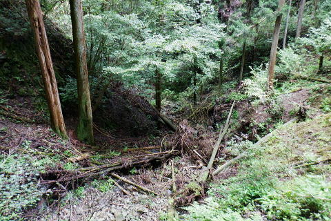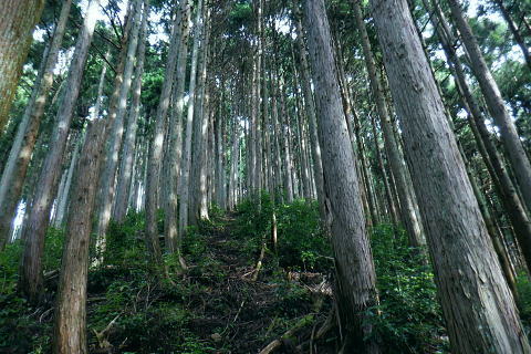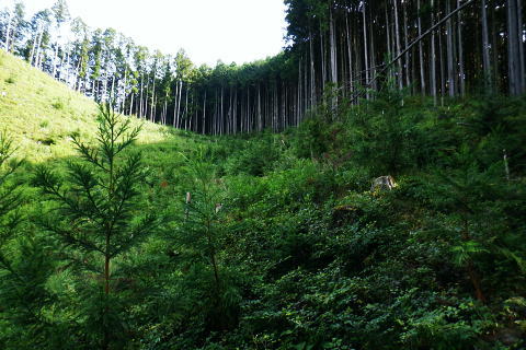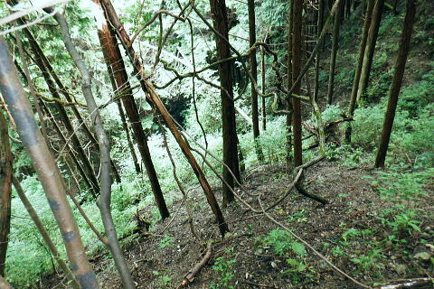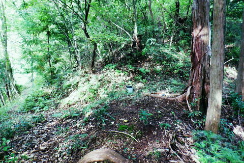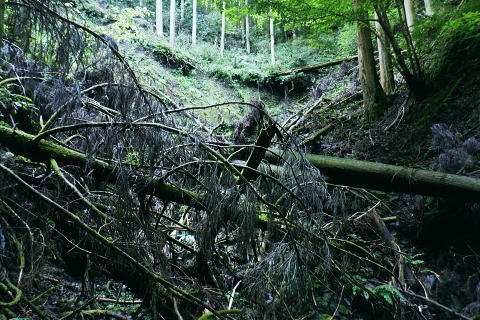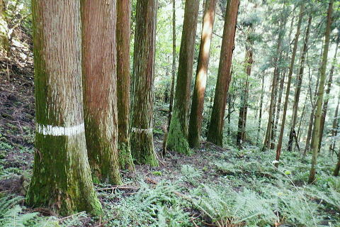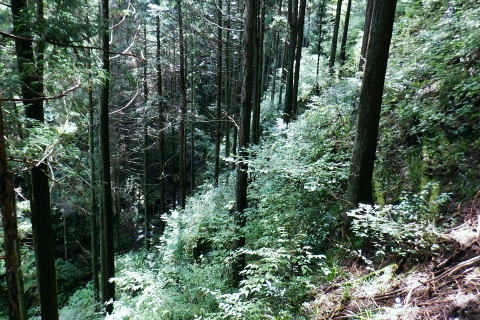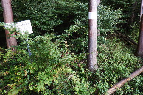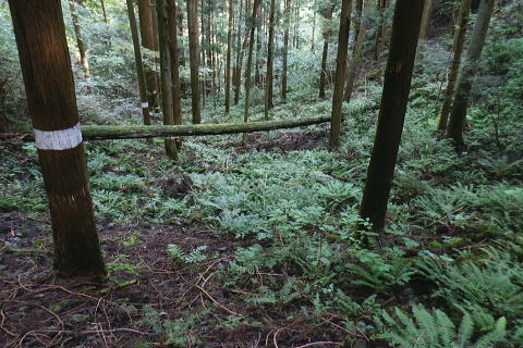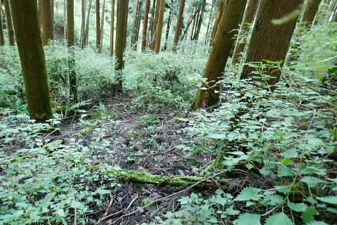| ・・陣馬.高尾山と戸倉三山T温泉Top 5弾.上浅川.醍醐道周辺. 下案下から要倉峠越えの醍醐の古道.経路から中谷山周辺の参詣古道と79号の鉄塔巡視路を歩む 下案下の石しるべから椚沢林道を横切り.要倉の峠路越をし.醍醐の石しるべから中谷山の古道.経路を綴る。 醍醐倉から真峯嶺峠の小尾根を越え熊野神社の参詣古道と中谷山古道から鉄塔巡視路を綴る 2021年09月13日.松村 下案下から要倉峠越えで要倉沢二俣・・難所を見逃す 要倉に下り真峯嶺峠を経て.再び中谷山・堂所へ 蛇ノ沢右岸尾根から古道.79号巡視路を経て醍醐道.関場 古道は作業道.林道.巡視路を兼ねている処が多い。出来るだけ古道を通り.下案下から要倉峠を越え醍醐に下りている。 春先3月には下案下から椚沢を遡り.高茶山を越え醍醐の「道しるべ」にでている。今回はその繋ぎの「石しるべ」へと綴る。 醍醐道にでてからは龍蔵神社を参拝し.中谷山尾根へ登り返し熊野神社参詣古道へ。真峯嶺峠を繋ぎ中谷山.堂所?に立つ。 後半は尾根伝いに東方に進み鉄塔巡視路を含む参詣古道から醍醐道.月見橋に下り関場で締めくくる。 案下の道しるべ 下案下バス停前.7:36今年はチベット高気圧と太平洋高気圧が重なり猛暑の上.線上降水帯が頻拍に発生した。8月の中半には太平洋高気圧が弱まり 大陸の気団に挟まれ.秋霖前線は九州・本州の真上に居座り動かず。関東地方は異常に極端な寒冷日が連続した。 下旬には低温注意報が発令され.可笑しな陽気が続いている。 予報官に云わせると当日は高気圧に覆われるも.気圧の谷や湿った空気で曇時々晴。 又コロナの緊急事態宣言は少し落ち着くも最悪の自体はまだ継続されていた。緊急事態宣言は三度継続されている。 7月,8月の山行は諦め75日振りの山。山行はトレーイングもせず.如何なることやら。天候も不安定な中.近場の慣れだした山域に入る。 9月13日(月).晴 jr御徒町5:11=5:15神田.快速.¥935:19=6:23高尾.バス:55=7:29下案下bs.310m 何時もの路線バスに乗る小学生達は緊急事態宣言の影響で休校。それに替わり高校生が座席を占拠している。ハイカーは私を含め往復5人.釣人1名 下案下の道しるべ 下案下バス停に独り下車.バス停前の細道に入る右角に.古い四角柱の石標「道しるべ」が立てられている。今年に入り. ここから案下道や椚沢を遡っている。石柱には右.「八王子」.左は「和田」と刻まれ.後ろの山側には「醍醐・檜原」と刻字されていた。 今回は先ず下案下から要倉峠を越え「醍醐・檜原」への古道を抜ける。 細道から古道で椚沢林道を横切り.要倉山南尾根から要倉峠を越え.要倉沢を下り醍醐に至る。前々回の林道までは.古道の取付まで殆ど同じルート。 醍醐の「道しるべ」は醍醐林道と支線のニニク沢林道の起点に立てられている。 要倉山と中谷山 下案下の集落上部からの中谷山尾根(猪通り尾根・要倉尾根)要倉山南尾根を詰め左鞍部の要倉峠から裏の醍醐に下り.真峯嶺峠から中谷山尾根へ登り返し.右手の幾らか起伏の高い.堂所510m圏コブに立つ。 北高尾山稜の2つの北尾根 便楼沢左岸尾根から鞍骨沢左岸尾根集落沿いに案下川が流れ.案下道は川井野へ。陣馬街道は和田峠へ延びている。 下案下2本目の北側の枝沢.7:40下案下の集落を上方へ横切り.集落は端の橋を渡った物置小屋にでる。前回は左脇から左岸沿いの堰堤へ歩み. 498m点尾根の末端から鞍部にでている。今回は物置小屋を右から裏に回り込み古道を歩む。 498m点尾根の南側山腹道少し藪絡みの山道から道は広く確りし始めるとケーブル・電柱が点々と並ぶ。 そして右下に椚沢沿いの地形図に記されている廃老人ホームを見下し.498m点尾根の鞍部を越えている。 小鞍部の十文字路 古道は498m点尾根を十字に横断し鞍部を越える.7:48前回は498m点尾根に少し登り.下った鞍部で古道を合わさり.左に折れていた。今回は直進し.尾根を乗り越えている。 直進し498m点尾根の北側山腹道に回り込む小尾根は498m点尾根の末端に当たり.その北側山腹を綴り椚沢林道にでる。 今年3月に訪れた時は林道が見えぬほど下枝が茂っていた。枝打ちされたようだ。すっきりた凛々しい立木林に変わっている。 椚沢を左岸に渡り椚沢林道へ.7:51 林道に入り最初の小沢出合・古道の取付き.7:55古道は堰堤から取付く。この小沢の出合で左上の南尾根に取付く 橋を渡り林道に入ると直ぐ現れる確りコンクリートで固められた林道の支線分岐を右後方に分けている。 4月に東峰南尾根を詰め要倉山を越え.三ノ沢中間尾根からメシモリ岩山にでたルート。古道は林道に入り. その先の谷間が取付きになっている。要倉峠への古道は地形的には要倉山南尾根を詰め西肩から峠路にでている。 尾根に乗り林道の取付きを見下ろす。左端に堰堤あり. 脇道の作業道は多い.まずは尾根筋を一直線に直登した。 492m圏・・作業道が横切る.立木に2本のテープと赤帽黒杭「130」直進し登り続けると尾根を横切る確りした作業道に突き当る。左に折れると作業道は直ぐ伐採地に突き当たった。 広い天空と椚沢の