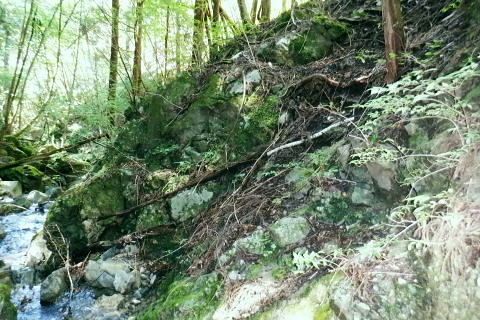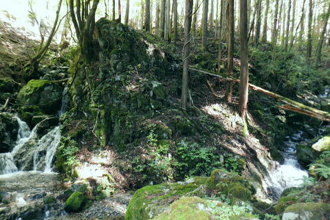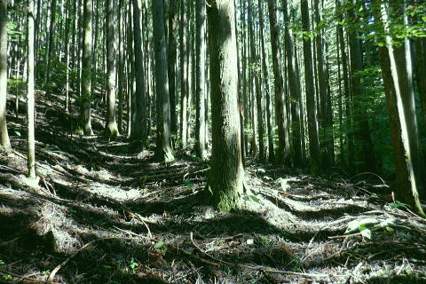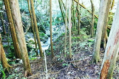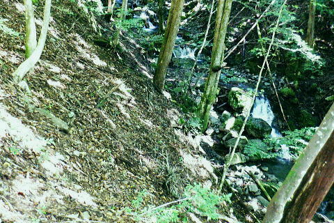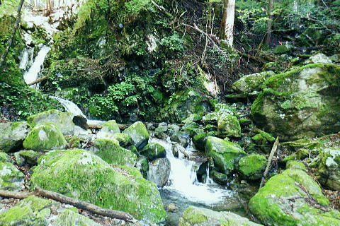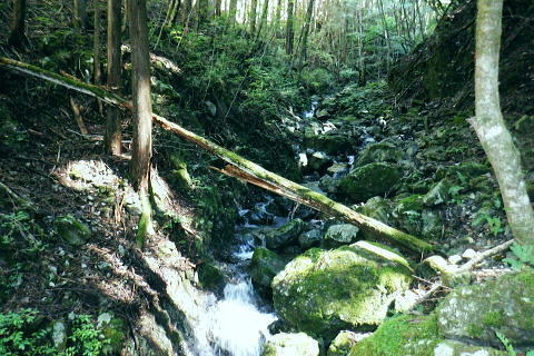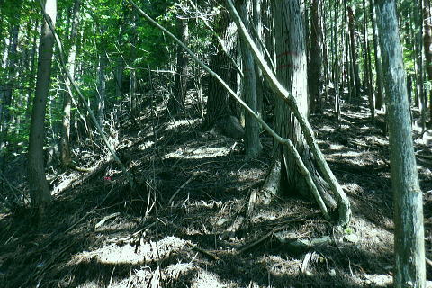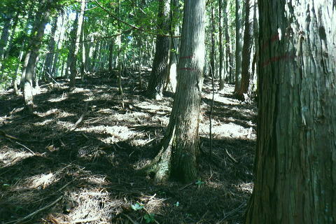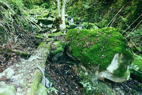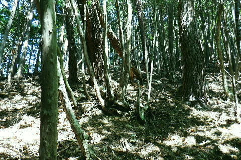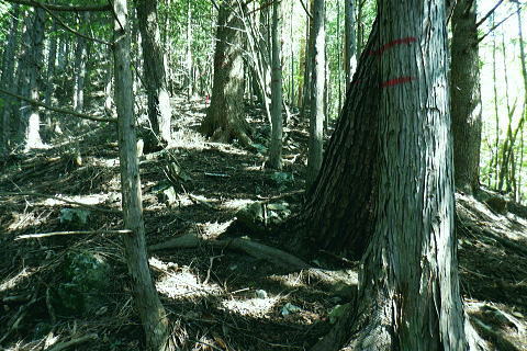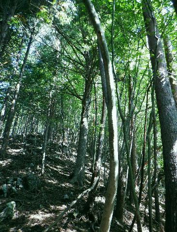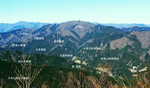 | 10月の2つの山行を利用して.三頭山西尾根の南面に残された長作尾根と神楽入尾根と2つの南支尾根を登る。・・三頭山笹尾根Top 前半の上旬には鶴川上流の宮沢橋から大長作沢に入渓し.左俣のノコドチ沢と右俣の立岩沢の中間尾根(長作尾根)を詰め三頭山西峰に立つ。 三頭山笹尾根に乗ってからは大沢ノ頭大茅尾根を右に分け.槙寄山西隣りの笹尾根1155m点からの大星沢左岸尾根を下り.原の集会所に降りる。 10月の半ばにはは神楽入尾根を詰め.三頭山西側の北経路から奥多摩湖に没するムロクボ尾根を下り.旧「みとうくち」へ降りる積りでいる。 2021年10月03日.松村 大長作沢二俣から長作尾根に乗る・・山レコT 1251m点から三頭山西峰に立ち.笹尾根1155mコブ 大星沢左岸尾根からは南西尾根を下る 原地区にでる・・原会館 三頭山南面の尾根群 権現山北尾根より望む・・2011.01/12:30左奥は雲取山. 足元の谷間は鶴川と沿いに県道.上野原丹波山線が綴られている。 三頭山から西方へ延びる三頭(西)尾根は南面に長作尾根・牛飼尾根・神楽入尾根と3つの支尾根を南側に並行するよう鶴川へ落している。 又三頭山西峰からは笹尾根が南東側に延び南面の支尾根群は大茅尾根.大星沢左岸尾根.槙寄山南西尾根と鶴川の下流側へ各々の出合がある 長作尾根の取付きは小菅村の南東側の端に位置し.上野原市との境界尾根をなすのが大長作沢の中間尾根で.三頭山では更に 奥多摩町・檜原村)とも分けている。鶴川左岸の長作沢(大長作沢)を二俣(ノコドチ沢と立岩沢)まで遡り.長作尾根を詰め三頭山西峰に立つことにした。 下山は笹尾根(都県界尾根)の槙寄山.1つ手前の小コブから大星沢左岸尾根を下り.上野原市北北端の原地区に下る。 又大星沢の出合の街道の高みには一宮神社が建立されていた。又.10月半ばからの山行は三頭山西峰から南北に支尾根に分け.神楽入尾根から ヌカザスの分岐からムロクボ尾根を末端へと下り..旧「みとうさんくち」駅から旧ロープェーの里に奥多摩湖周遊道路にでる。 jr上野原駅南口に開設された新バスターミナル.7:51北口広場は主に団体用らしい. 前道志の500m峰と鶴島と頭に隠れる栃穴御前山10月03日(日).快晴 jr御徒町6:01=6:05東京.快速:08=7:22高尾.河口湖行:24=7:40上野原.¥1060. 8:09=9:10宮沢橋690m 季節バス鶴峠行で途中下車.料金は鶴峠と同一料金. 日の出と共に家をでる。昨夜の雷雨は既に路面を殆ど乾かせ.清々しい朝を迎えている。 コロナの緊急事態宣言は10月1日に全国的に解除された。列車の車内は久し振りにざわめき立つも.高尾駅で乗り換えてからはガラガラに。 10月から運行された上野原発の季節バスに.今日はハイカー15人ほどが乗車した。 飯尾から自由乗降区間に入り.途中の宮沢橋で降ろして頂いた。運転手から飯尾を過ぎてから下車ボタンを押す云う促された。 押すと車掌は「途中で降りる人がいますが終点の鶴峠はまだ先です。下りる準備はしないよう!」と他の乗客にマイクを向けている。 ここで「よいかと念を押され.」バスは宮沢橋に停車. 降りたのは私独り.礼を述べてバスは立ち去った。 長作の集落と宮沢橋.9:14鶴川と並行する上野原丹波山線. 左脇に大長作沢出合を見て.宮川橋を右岸に渡り.県道と分かれ大長作沢沿いに折れている。 殿平と大羽根山に挟まれた分岐を過ぎると県道の周りは広がりを見せ.右前方に白い家屋を脇に見ると隣り脇が宮沢橋だった。 澄み切った蒼空が仰がれる。今回初めて「山レコ」を使用する。出発点のバス停で.何処を押せばよいのか要領が分らず. 昨夜確認したボタンを探すことを繰り返している。もう20分も立ち止まり.探るが分からず.使用を一時諦めていた。 宮沢橋を渡り県道を右に折れ.広い里道を分け.直ぐ左に折れる.9:32ここは牛界尾根の下端東側で.最初の家屋脇から左の小道に入る 左に折れた突き当り突き当たった民家を右に折れ.玄関前を通らして頂き.大長作沢右岸の畑道を歩む。 934m点峰・・右奥が奈良倉山だろう 畑の高みにでて県道を振り返る.9:34奈良倉山から南に延びる葛野川右岸尾根の1238m点峰東尾根に乗る934m点峰。 尾根末端に丁度.白い建物の脇に宮沢橋が見下ろされた。 最初に見る古い森林開発公団のマーク.9:38 道なりに木橋で小沢を左岸に渡る.9:42雨雲レーダーを見ると東京の昨夜の雷雨はここ奥多摩から東京まで回ってきた。 昨日は地元では早めに雨は治まっようだ。それでも朝方の日陰は樹葉に雨露を乗せていた。 蕎麦畑の中央を横切る赤帽黒杭「R2・・」が埋められ.先にも付けられている。右奥は大茅尾根. 畑の北側端で道は2つに分かれ右坂を取る.9:45 一軒の廃屋を左に見て.更の畑跡地を抜ける三頭山西峰と長作尾根 畑跡から三頭山と笹尾根の大沢ノ頭が見上げられた.9:52 2度目の公団のマークで右に折れ長作沢沿いに入る.9:57左の道を進んでも最終的には長作沢にでている模様. 大長作沢右岸の道なり.10:01 840m圏.以前は左岸から高巻く下降地点踏み跡はカラタキ沢出合に下りている。 850m圏.左.長作沢と右.カラタキ沢との出合に直接降りる.10:0