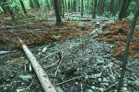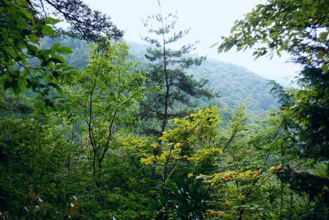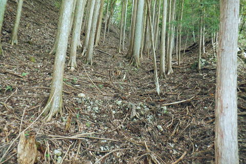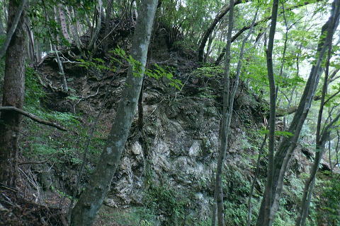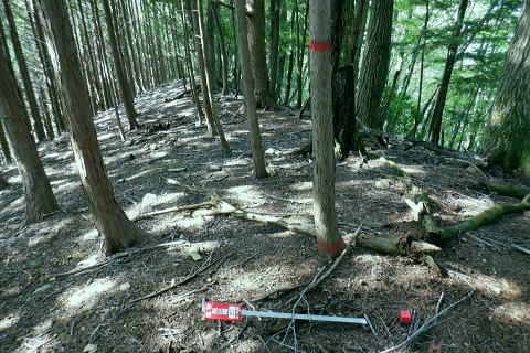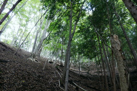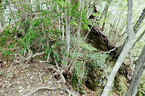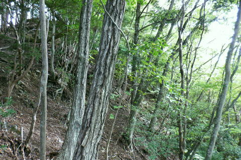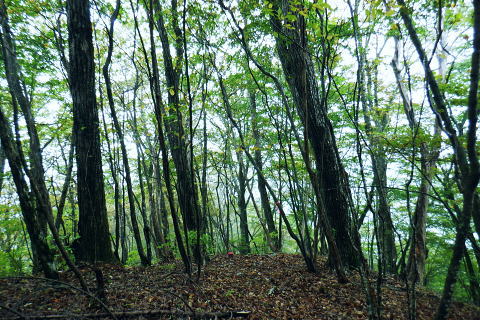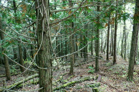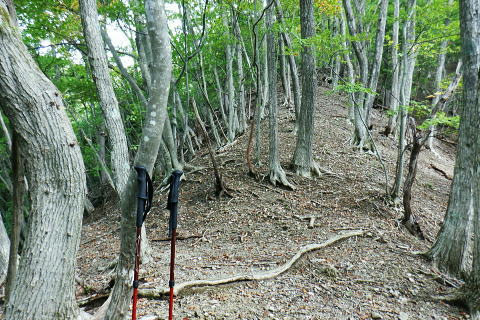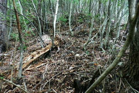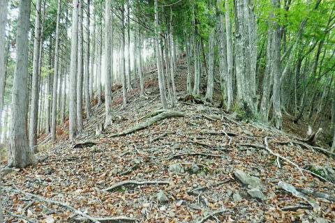 | ・・三頭山笹尾根Top 前回に続き三頭山西尾根の南面方面に残された最後が神楽入ノ峰南尾根. 頂に立ち背陵の北側経路に回り込み.ムロクボ尾根末端から奥多摩湖々畔にでる。 神楽入尾根を詰めてからは三頭山北側水平歩道に回り込み.ヌカザス尾根の分岐から奥多摩湖に没するムロクボ尾根.丸山尾根に乗り変える。 藪絡む旧ロープェーの「みとうくち駅」に寄り.三頭橋.深山橋を渡り深山橋バス停にでている。 2021年10月16日.松村 県道前原.神楽入沢から神楽入尾根・・牛飼尾根側から入山ロープウエィ 西尾根にでて北側の山腹水平歩道からヌカザス尾根 ムロクボ尾根.丸山尾根から旧「みとうくち駅」 長作観音入口バス停より.9:13右手は上野原丹波山線. 左奥には長作観音が祭られている。その背が奈良倉山東尾根末端になる。 10月16日(土) jr御徒町6:01=6:05東京快速:08=7:22高尾.河口湖行:24=7:40上野原.¥1060. 8:09=9:13長作観音入口bs 季節バス.鶴峠行で自由乗降区間の長作観音入口bsに下車.料金は鶴峠と同一料金. 前回の長作尾根.大星沢左岸尾根山行と同じ交通機関を利用する。2週間との違いは更に日は短くなし朝方は日の出前に出掛けるようなる。 路線バスの乗客は座席が埋まる程度で前回と変わらず.今回の路線バスと同じく自由乗降区間.長作観音口バス停で停めて頂いた。 バス停とはちょっと不思議な感じを受けるも.季節バス直行便のため.改めて停めて頂いた。 朝方の明るさも山越えをして路線バスから降りる頃には次第に重たい雲に覆われ.何となく雨雫が落ちる雨雲の中に入っている。 周りは霞み展望も望めぬ雰囲気.如何にか持ち堪えることを願い.集落を抜けて尾根に取り付いた。 バス停から来た街道を振り返る県道の奥に聳えるのが坪山で.向い左上が三頭山牛飼尾根の末端。牛飼尾根は以前.新玉川橋から入小沢ノ峰シンナシ尾根を経て 三頭山を逆に南北に横断して牛飼尾根へ下りている。その下降口が左手前の家屋のある左裏の廃屋に降りていた。 今から10年前の2月で当時は北側の小沢ノ峰シンナシ尾根を朝方に登り.午後に西尾根を越え.日を浴びた暖かさに感謝した覚えがあった。 中央のガードレールは神楽入沢に架かる県道の短い橋. 橋手前の左岸の里道から集落を抜け.神楽入尾根に取付いく。 又県道右側の家屋の裏側に回り込んでから鶴川の流れから神楽入沢の出合へとルートを取り.尾根に取り付いている。 背は既に神楽入尾根 橋手前の里道.9:14神楽入沢の右岸に入った所が神楽入尾根と牛飼尾根の取付き。10年程前に北側の玉川から入小沢ノ峰シンナシ尾根を経て糖指尾根を詰め. 三頭山から牛飼尾根を下り.右手の廃屋の裏に下りている。その時は晩冬の明るい陽射しを浴びながら阿寺沢入口まで街道む。 今回は新ためて入山する形で三頭山西尾根から派生する神楽入尾根に乗る。 幾つかの入山ルートがあるものの.集落の上部にお地蔵さま・石仏がある作業用木道から家屋脇の尾根末端に繋がるのがメーンのようだ。 私は民家を避け上流側のもっとも奥に建つ一軒屋跡から繋がる作業道を使い入山している。 9:18最初に神楽入沢に架かる鉄橋で左岸に渡り.牛飼尾根側へ回り込む. 直ぐ上流側,第2のポール状橋で右岸に渡り返す.9:21小広い平地にでて右奥に最奥の家屋を見付けている。2つ並ぶ奥の橋から右岸の取付きへ。 踏み跡は山腹を南南西へ戻る感じで進む.9:32左上の茂みに隠された家屋脇から高みに繋がる薄い踏み跡を見付けている 720m圏.窪地の底中央の立木の枝に赤テープ.それがポイント.9:35山腹を横切る細い作業道で集落に抜けている。この窪地が取付き地点で.窪地状をを詰めるれば主尾根に乗る。 反対側の踏み跡は出合道標から集落の中を戻るルートだろう。この地点から上部のルートと合わさり. 深く枯葉の積もる激坂の窪地から尾根を目指した。 神楽入尾根を見上げる.9:44 枯枝の藪絡みもなく.すっきりした尾根に乗る.9:48871m点峰 このコブから踏み跡ははっきりしてきた.9:58越えた鞍部で右前方から薄い踏み跡が登り合わさる 900m圏.ここだけ各種の印が集まる.10:05尾根筋に赤テープ類は見当たらぬものの.時たま赤帽黒杭と立木に古い赤マークがある。 920m峰 尾根筋の右手が抉れ落ちる.10:11 更に左手が長めに落ち込む.10:22 950m圏.尾根筋が途切れる.10:30 振り返る劇斜面.10:32 1220m.尾根に確りした作業道が横切る.10:36 1000m圏.作業道の左は山腹道沿いに広く間伐されていた.10:42小焼沢側は尾根筋から広い範囲で間伐が行われ.倒木類はそのまま残されている。作業道の分岐点には長く石積のような. 又ここには炭焼き場のよう積み重ねられた石積を見ている。自然と割れた残骸のようにも思えた。 枝落ちされ枯れ焼けた檜の残骸が散乱する斜面を詰める.11:02小休止 1090m圏.尾根上にも伐採されている.11:09 伐採地の北側端.11:13 1040m圏.右手に今日初めての展望・・大茅尾根.11:21 平坦になるも藪絡みに突入,アセビが現れる.11:21 1200m.尾根筋は北東へ折れている.11:30 1315m付近の荒れた踏み跡.11:52 1350m付近の急登.12:00 先が