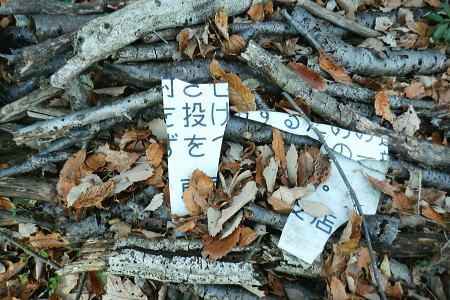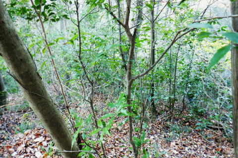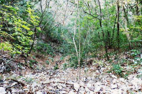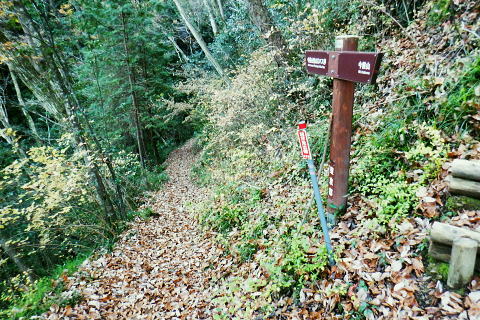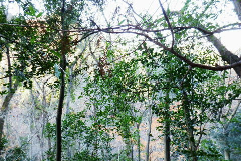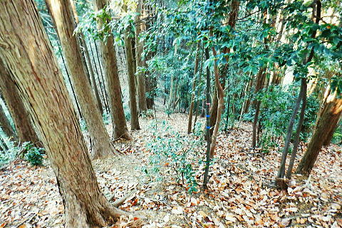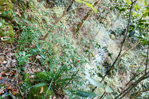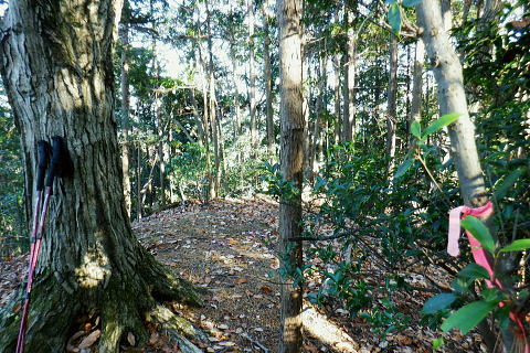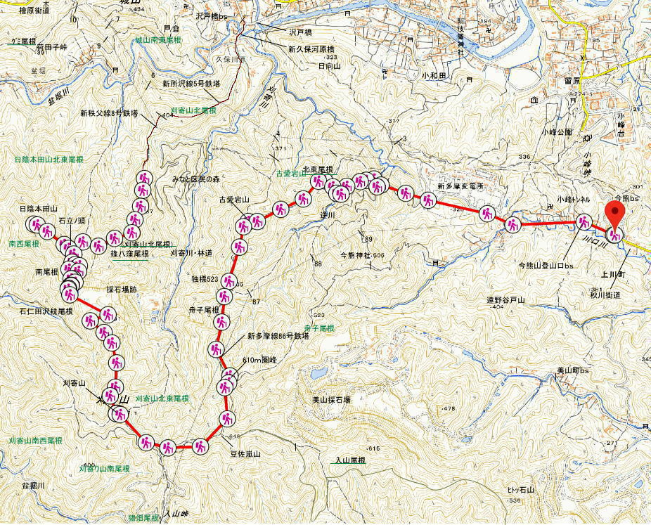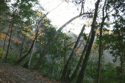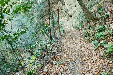 | 古愛宕山北東尾根から逆沢の沢底へ―ルートを変更し.対岸に渡渉。今熊道から新多摩変電所に回り込み秋川街道.八王子五日市線へ 舟子尾根の古愛宕山から北東尾根を綴り.逆沢の金剛ノ滝上流側を渡渉―今熊山の登山道に逃げ.今熊・新多摩変電所から秋川街道 沢戸橋から篠八窪尾根を詰め日陰本田山への分岐 ピストンし石立ノ頭南尾根と石田沢の枝沢から採石場跡 刈寄山から豆佐嵐山を経て舟子尾根 古愛宕山北東尾根と今熊神社裏参道道・・渡渉.新多摩変電所と秋川街道.日没の今熊山バス停 舟子尾根.古愛宕山 頂で右に折れ北東尾根に乗る.13:56古愛宕山の山頂で単独の男性に出会う。倒木にのんびり腰を降ろし迎えられた。これから今熊山へ登るとのこと。 この山域には詳しく.殆ど歩き回ったようだ。北東尾根を尋ねると篠八窪尾根から来たのなら大丈夫と念を押してくださった。 直ぐ小広い台地にでる.14:06尾根筋は2つに分かれ.ほぼ直進とやや左に尾根が延び.右に直進している。 古愛宕山北東尾根 直ぐ先で.合わせてもパズルのよう 痩せ尾根に緩い起伏,雑木に植林と変化に富む.14:10 林相の境から小コブを越え下る.14:13416m圏 14:15 基本は尾根を外さぬこと? 14:17 左手に並ぶ新秩父線3号鉄塔.14:223号鉄塔と云うことはこの裏の谷.逆沢を渡った対岸の里口に.新多摩変電所があり.そこからの送電になる。 右下の新多摩変電所から青梅線の御嶽駅手前脇を抜け.真名井北稜から秩父へ仙元尾根を下りている。 藪絡みが見られる尾根筋へ.同380m圏の分岐 380m圏.尾根の二又分岐にでる.14:28 この先が問題に.14:37分岐から右に折れ直ぐ又左に折れて尾根筋を右に回り込む筈が.直進する踏み跡に惑わされ.頷くよう下りてしまっている。 途中で気が付き左斜面を下るも遅し。古愛宕山の頂で出会った単独行者に「右にはいるな!」と注意を受けるも.それすら忘れている。 如何にかなるという気持ちは逆川の河原に降りることになった。高度差としてそれぼどなかった。 逆川 逆川の谷底を見下ろす.14:46まずは何処を下るか?上流側へ. 272m圏.逆沢の沢底に降りての上流側.同左岸に古い作業道が綴られていた。見た目より確り残されている。もしかしたら使えるかもと.気持ちだけはワクワクしていた。 高みの桟橋から.14:47最初の桟橋はボロボロで足場に困り.交差する枝木の上をソロリと抜けている。 2本目の桟橋は確りしていた.14:51左岸の作業道は河原が広がると自然と沢底に導かれていた。暫くは右へ左へと渡渉を繰り返しては降りている。 それも突然.狭まった峡谷に変わり.落ちる谷底に踏み込めず。 直下は不可能.この下辺りに金剛ノ滝が落ちていると思われるが轟音は水量が少ないのか?聞き取れなかった。 右岸の枝沢の谷側のノッペラした斜面 280m圏.右岸枝沢の右岸から対岸に渡ろうと思ったが無理.15:03本流右岸に枝沢が入り込むのを見付け.沢沿いにを400m程歩き.右手の高巻きへ回り込む。それが又悪かった。 灌木類の樹林に乏しい斜面.如何にか対岸に渡り.トラバースできればよいのだが。沢底の標高250m圏から枝沢左岸に入る。 偵察して小沢の対岸を詰めうようと近づくも.ノッペラした斜面に変わっている。 対岸に諦めると同時.上流を見上げると人工的な土留めが見上げられた。確りした登山道が横切っていると確信し. 改めて枝沢の左岸尾根に乗り.枝尾根を詰めることにした。本流を左岸から下り.右岸の今熊神社裏参道に乗り変える。 枝沢右岸尾根の天辺から.15:15沢底から高度差600m程で登山道にでて.南東方面の上流側を眺める。 今熊登山道 310m圏.土留めが右脇にある今熊登山道にでる.15:15背の南側を辿れば今熊神社の505m峰を越え.523m点峰を経て.先程通過した舟子オネノ頭にでる。 前方は左岸沿いの山道を綴り.北面の3本の枝沢を横切り.新多摩変電所にでることにした。 登山道にでて登ってきた小起伏の斜面を見下ろす.同 登山道の土留めから谷間を見下ろす.15:18左手の枝尾根を詰めている。右の枝尾根を越せば.登山道直ぐ先の道標「金剛ノ滝下」の道にでられた模様。 頭上のまだ青葉.同今熊の裏参道にでて右に折れれば直接.今熊神社が祭られた今熊山505mに立つ。左は直ぐ.金剛ノ滝への分岐にでた。. 人工的な土留めの左脇.「金剛ノ滝下」への分岐.15:19尾根末端の390m圏コブから北に延びる枝尾根の300m付近の道標。「金剛ノ滝下」は通行注意とあり.足元に下る山道が現れた。 日没まで間近.万が一のことを考え.早い日没を計算し寄ることを諦める。順調ならば長い木段を下ると下滝の雌滝(落差約4m)の小滝にででられる。 更に洞穴を抜け.金剛ノ滝(.雄滝.落差約18m)を見聞できた筈だった。欲を掻かず下山する。 水平道.小峰公園からの分岐.15:24木橋手前にあった右に登る作業道分岐と「安保林」の看板。脇の今熊山北側の地図の破線路から 逆沢右岸の枝沢を幾つも越え.迂回して新多摩変電所を経て秋川街道にでる。 水源かん養「保安林図」.15:25 .同.滝の下流に架かる木橋登山道が尾根末端を大きく右に回り込む。途中.枝尾根を分け