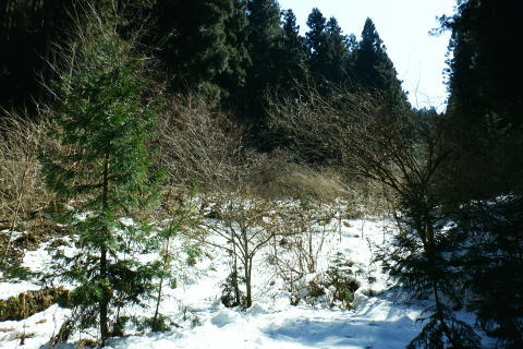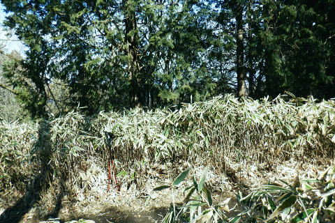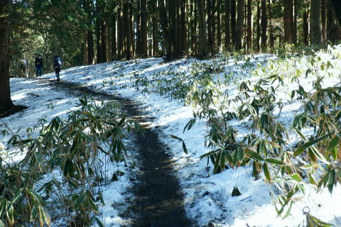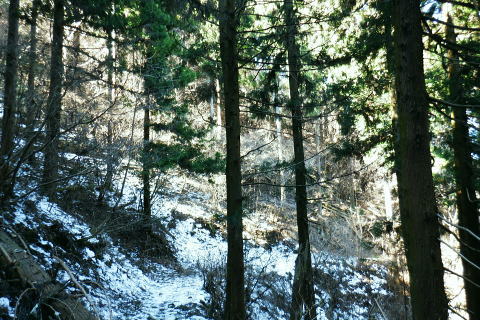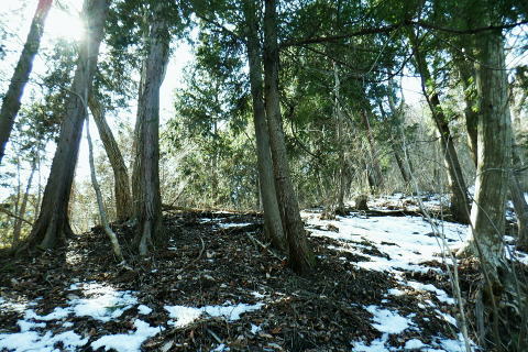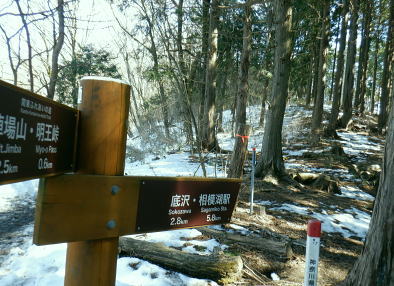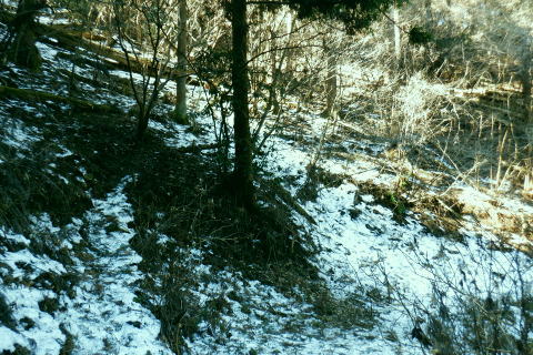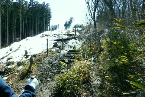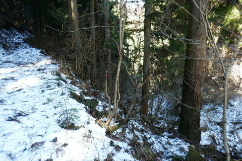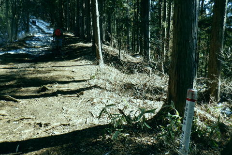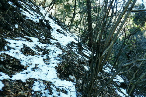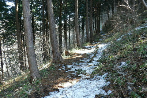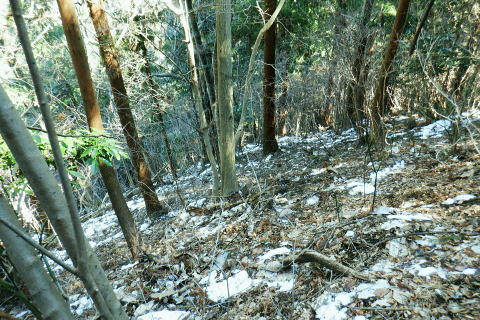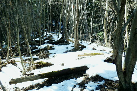 | 逆沢林道から逆沢を横切り.680m圏北東の小尾根を綴り.春雪に覆われた高尾陣馬縦走路にでる。 背稜は固められた硬雪が凍り付く山道で以外と難渋しながら底沢峠へでている。 ヤゴ沢二俣中間尾根から逆沢ノ頭東側の作業道 林道から680m圏北東尾根を詰め武相尾根に乗り.底沢峠へ・・凍り付く登山道 旧道・作業道から矢ノ音を経て貝沢川・林道 甲州古道.与瀬とjr相模湖 逆沢林道 逆沢ノ頭に登るには林道終点広場が取付きに.逆沢ノ頭東側の作業道から繋がる逆沢林道の終点にでて.振り返る林道の右斜面が逆沢ノ頭北東尾根。 逆沢の河原 525m圏・・林道がV字に横切る逆沢の広い河原を横切る.11:06 逆沢の左岸に移り逆沢林道を上流へ 表面は淡いが地床は凍り付いている武相国境尾根(陣馬高尾縦走路)680m圏の北東尾根の下部・・南山腹 林道515m付近の直進から林道が右に曲り込む辺り.11:10左の細木の根元に薄い踏み跡を前回見付けていた。それではと林道を分け今回は左の雪斜面にルートを取る。 680m圏小尾根の北ルート 立木の脇の残雪が薄く.何となく判る踏み跡が3.4歩見付けられていた。当然これだけで踏み跡が続いているとは思えない。 以前.林道を通った折.地形から何となく抜け道があるのではと.気を付けて見詰めつつ探し当てた場所である。 正面の山腹から尾根末端を詰める。末端は扇状に広がり緩やかなるも.直ぐ抉られる急斜面になり尾根らしくなる。 中段の緩やかな勾配のトラバースの帯を利用し北側に回り込む。北側から登り直すのがポイントのようだ。 左の窪地に向かい作業道らしき踏み跡が延びている。幾らか傾斜が緩みを持つと尾根末端の山腹をトラバース気味に斜上し北側に回り込む。 そして北側の斜面から左に回り込み.小さく斜上し尾根に乗る。地形図を見ながら綴ると分かりやすいだろう。 ただ今回は踏み跡が薄い上.残雪に覆われ.探すより自分で地形を読んだ方が分かり易かった。短いので意気揚々と登っている。 左下の小さな立木が取付き.11:22この小さな立木の左手に踏み跡らしきものがあった。この立木の裏側に回り込む. 又林道を挟んだ下流側の逆沢左岸尾根の薄い踏み跡は小下沢の小滝に下りている。積雪のせいか.厳しく感じられた。 北尾根の下端 雪面を斜上する踏み跡は直ぐ失われた。探し求めるより藪絡みは薄く.足場を求め這い上がる。途中で傾斜が緩むと南面の山腹にでて融雪が進み. 踏み跡らしきを見る。もう少し取付きの窪地を直上してから踏み跡はトラバースしているようだった。劇斜面も積雪のある方が楽かも。 トラバースの緩やかな斜面で踏み跡らしきは無視した.10:20 ただ左足を上げ前進し斜上するのみ.10:22 尾根を回り込む途中で振り返る.11:23北尾根北側の斜面 北西側の斜面をV字に回り込む.11:23今度は左に折れるよう南東側を斜上. 小尾根に乗り振り返る.11:29自分の踏む跡が点々と 緩やかになった尾根筋は融雪が進んでいる.11:29日当たりの融雪が進む 尾根筋は灌木.右手の谷斜面は中木林の植林帯 尾根伝いは常緑林で心を和ます.11:29 背稜手前で藪に絡まれる.11:40以外と藪の一番少ない時期で助かっている。直進するのみ. ここは無雪期より楽な雪面680m圏小コブ 最後の一歩で蒼空を仰ぐ南西尾根 逆沢林道から北尾根の短いながら680m圏の大らかな小コブにでると奥高尾の縦走路に立つ。 この縦走路向いの底沢側には景信山西水平歩道が山腹を横切っている。先は砥石沢流域の三俣にでると白沢第二林道にでる。 又ゲートの北側隣には69号鉄塔尾根の取付きを合わせていた。 高尾陣馬縦走路 越えて武相国境界尾根の笹薮帯を越え.11:44積雪の融雪した縦走路は凍結し厚いコールタールのような登山道に変わっている。暑いと云っても毎晩.マイナスの世界。 東京でもまだ冬日が続いている。ここでアイゼンを外してしまったが時期早々の感あり.滑ること滑る。 陣馬高尾縦走路に乗る 縦走路を右に折れ白沢峠へ.11:56雪面に土の黒さが目立つ縦走路. この下が曲者で凍り付いている。ツルツルの板状の道が付けられていた。 アイゼンを付けるハイカーは平然と歩き.無い者はオロオロしながらの不安定な姿勢が伺える。坂道になると尚更歩きずらく誰もが鈍くなる。 私も例外ではなかった。それも数分前まではアイゼンを履いていた。何故.こんな運命になるのだろうか? 背稜を横切る送電線新多摩線の72号鉄塔 縦走路から見る小下沢に落ちる短い鉄塔の北尾根.12:0573号鉄塔は短い北尾根の奥に並び.木下沢に没する鉄塔尾根でその天辺を横切る。. 景信山の東側の巻道と合わさると登山道の右脇の基部から72号鉄塔を仰ぐ。ここにからは北側に短い鉄塔尾根が延び. 巡視路は小下沢を下り返し.対岸の74号鉄塔に延びている。小下沢林道に降りれば逆沢林道の起点とも合わさる。 白沢峠 縦走路を振り返る.13:09右の赤帽白柱は景信山北方の西側山腹道の分岐. 水平歩道で先は小仏峠にでる。又過っては古道が途中まで通っていた。 堂所山の2つの分岐 ![]() 堂所山の巻道分岐.12:10 堂所山から北高
