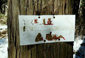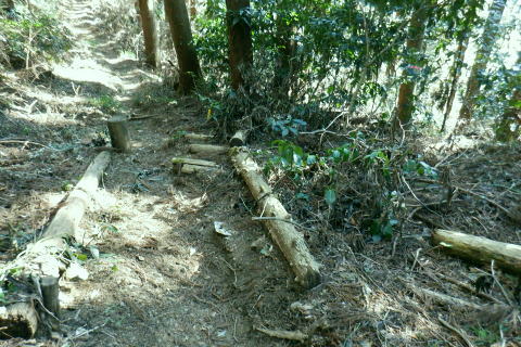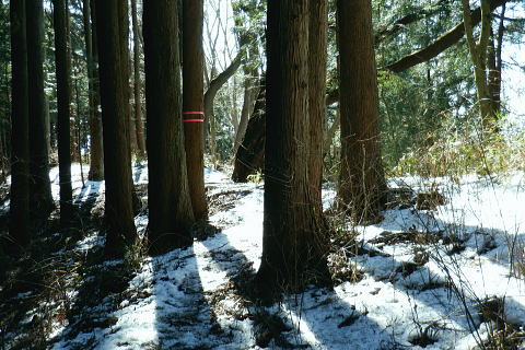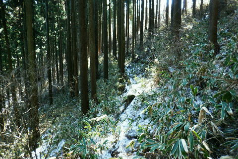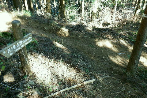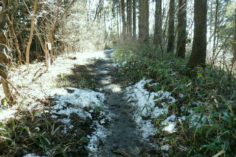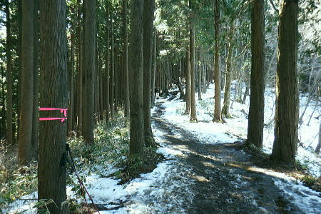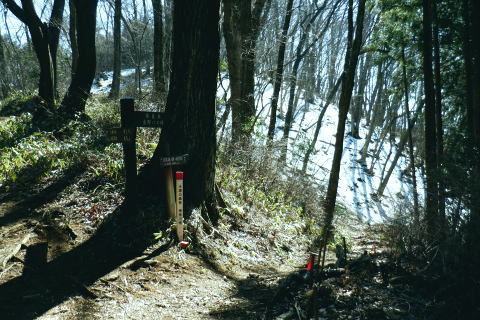 | 裏高尾から奥高尾へ. 底沢峠から再び縦走路を分け.明王峠南東面の作業道(古道)から南尾根へ ・・吉野矢ノ音TOP 途中で吉野矢ノ音に立ち.旧大平小屋からは貝沢の試験流域を抜け.貝沢林道から甲州古道の与瀬へ。 ヤゴ沢二俣中間尾根から逆沢ノ頭東面作業道 林道から680m圏北東尾根を経て武相尾根から底沢峠 旧道・作業道から矢ノ音に立ち.貝沢から林道・・南経路と貝沢の水文観測 林道から甲州古道.与瀬とにでてjr相模湖 左方は明王峠の東南作業道(旧古道) 左下の旧道の右上の陣馬高尾縦走路で.底沢峠分岐から明王峠へ.12:57底沢峠は相模湖.与瀬宿と案下川.下案下と繋がれた峠路。明王林道コースから福源寺にでて. 陣馬高原下バス停を過ぎると下案下に至る古道。下案下から先は要倉峠越えの古道へと続き.醍醐林道と結ばれている。 又川井野へは案下道がある。ここ数年.通い続けていた山域。この先は明王峠南西作業道から南尾根を下り. 途中で吉野矢ノ音に立つ。再び古道と合わせて.接点として甲州古道(尾根筋)と分かれた貝沢沿いへ下りる。 明王峠の東南作業道の分岐 ![]() 陣馬高尾縦走路を分け.立木の左脇の作業道.小道に入る 分かりずらい「相模湖駅」への道標. 左に赤テープで巻かれた立木が2本あり.その間に明王峠南尾根に至る明王峠南西作業道(旧古道)を綴る分岐点。 又その一方には「→相模湖駅」の「駅」だけが如何にか分かる道標が幹に打ち付けられていた。左下のスズタケ茂る小道に入る。 明王峠の南東山腹道熊笹で踏み跡が隠れる 谷間は底沢西入沢の源流の熊笹明王峠南尾根 13:04明王峠直下の作業道へ入る合流点。 明王峠南尾根に乗ると先の作業道入口には「近道.高尾山」と短い言葉の道標「近道・高尾山へ」がある。それも大分読みずらくなった。 吉野矢ノ音に立つのは今回で3度目. 最初は明王峠から南尾根を下り.2度目は孫山東尾根から大平小屋跡の南面から詰めている。 今回も南尾根を下り.日当たりのよい.風の避けられる所を探し昼食を摂る積もりでいる。 明王峠南尾根 明王峠南尾根の作業道を下り.更に杉の植林帯を綴る 石投地蔵嬢ケ塚を通過.13:10 尾根の鞍部.栃谷坂沢林道を横切る・・13:14昼食13::50栃谷坂沢林道に突き当り向い側に完成記念碑が立ち.与瀬への甲州古道側と繋ぐ。 遠方の樹間から乾いた日当たりのよい林道を見付け.林道に出てからは大休止するため.林道から少し底沢方面に下っている。 朝方は強い南風が吹き付けドンドン気温は上昇した。その上木洩れ日の中尾根に乗り.背に風を受けている。 だが高尾陣馬縦走路にでからは強い北風に変わっていた。 烈風に煽られるも底沢峠からは山陰に変わり遮られるも.鞍部の林道にでて再び煽られ.昼食を摂るのも考えさせられていた。 峠陰の風下の底沢側に少し林道を移動し風を避けている。無風の舗装された林道は暖かい。我慢せず移動して正解だった。 食後は鞍部から旧道を通り.確り踏み固められた山道を綴る.13:55 左は与瀬の古道と奈良本尾根の鞍部へ至る分岐点.13:57左.大平小屋からの登山道と合流. 右は矢ノ音の北側を巻く作業道の分岐にでる。西.鞍部から奈良本尾根に乗ればイタドリ沢ノ頭にでられる。 1年半ほど前に訪れ.その又1年ほど前にも訪れている。その1年ほどの間に驚くほど作業道は手が入り.道中の藪は消え.て全く異なる姿に変えられていた。 何もかもが登山道の如く整備された。道床も歩き易くなっている。その変貌振りには驚くばかりだった。 藪は奇麗に整地され.立派な山名標に道標・休憩場ができあがり.藪絡む作業道は新たにハイキングコースが造られていた。 直ぐ先の小さな分岐・・右上は雪積もるの矢ノ音へ手前の道標は左手が与瀬からの古道で.大平小屋からの登山道と合わさる。 矢ノ音へ 直進は大平小屋.右上の熊笹覆う山道に取付く.13:59吉野矢ノ音の山頂 藤野町十五名山.633m正面奥は藤野丘陵.右奥は小渕丘陵 雪原化し開かれた平頂. 戦国時代の戦場.吉野矢ノ音。貝沢の源頭に当たる頂には「2気象観測地として広く囲い設置され発信されている。 貝沢沿いには県による各種の自然保護に係わらる水木調査の機材が.二ノ沢出合付近まで点々と設けられていた。 西方は奈良本尾根.からのタドリ沢ノ頭と562m点コブ562m点コブは旧イタドリ沢ノ頭.その奥に広がるのが中里の大日野原越えの小渕丘陵。 熊沢岳南西尾根と笹尾根大ツイジ 北西方.矢ノ音の頂より陣馬山奈良子尾根と579m点コブ 矢ノ音の頂.南面縁 林相の境.立木のテープが南東尾根の入口.14:18山道沿いには観測用の電気ゲーブルが敷かれ.以前は大平小屋跡から登った短い尾根を直下した。 矢ノ音南尾根を下る 測量用の電気ケーブル沿いに下り.大平小屋の登山道を合わせる.。14:25左方は矢ノ音の東側を巻き道から明王峠へ。 右下は脇の大平小屋跡から与瀬神社に至る古道。尾根末端への取付きにある与瀬宿は甲州古道として再び里で合わさっている。 大平小屋 骨組みだけになった旧大平小屋の休み処.14:27右脇の道標は「←矢ノ音.明王峠・