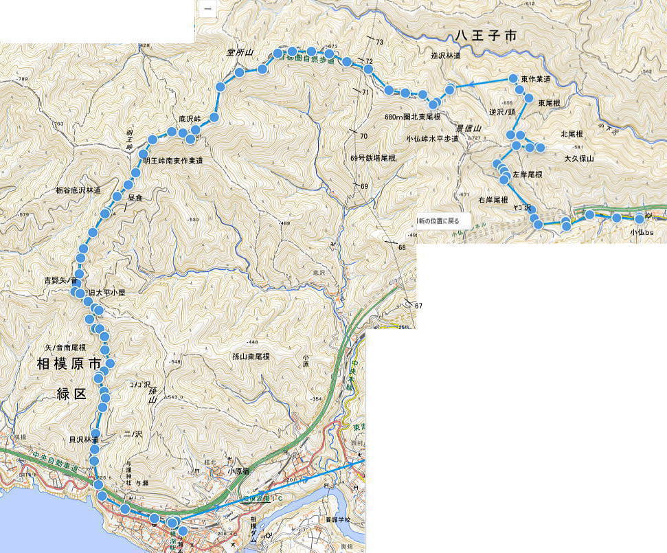 | 貝沢林道から甲州古道にでて与瀬地区と相模湖・・里道・旧道からjr相模湖駅 ヤゴ沢二俣中間尾根から逆沢ノ頭東側作業道 林道から680m圏北東尾根で武相尾根に乗り底沢峠 旧道・作業道から矢ノ音を経て貝沢川・林道 山を下り貝沢林道のゲートから甲州古道.与瀬にでて甲州街道.里道からjr相模湖 国道を含む3本の立体道路 上.中央高速道と国道20号.その間に上がる歩道に水準点225mがある15:27林道ゲートから左前方の広い土道に入り.国道まで下りず.歩行者専用道路からそのまま里道を歩くことにした。 上部は中央自動車道と交差する里道.更なる右下はR20号・甲州街道が横切り里道へ。 街道の左上.吉野へカーブする地点奥が貝沢林道口で振り返る中央の歩行者専用道路から左上の貝沢林道に入り貝沢橋を渡ると一里塚へ。 甲州古道(旧甲州街道)は「左は吉野宿・右は与瀬宿」と道標とゲードには今熊大権現の石柱がある。 . 与瀬神社 与瀬神社の鳥居を左に見て直進.15:32歩行者専用道路から中段の里道にでる。広くゆとりある参道で高速道を跨げば本殿へでる。本殿の左奥が貝沢左岸尾根・子孫ノ頭南尾根の取付。 鳥居の位置は209m. 丁度2年後の2月には逆にこの参道を登り.子孫山ノ頭. 新多摩線68号と67号鉄塔を繋ぎ.最後は東海自然歩道を歩きjr相模湖駅へ。 里道から下部は甲州街道が横切る参道口 突き当たりは国道20号線.左に折れればjr相模湖方面.石老山 そのまま中段で石老山を遠望し.里道・旧道に入る遠く小仏城山と嵐山 線路沿いの細道から上り特急「あずさ30号」.15:37線路脇の小路で山を終え帰り支度を整える。その間に下りの特急「あずさ37号」とも擦れ違う。 相模湖駅発の快速は後20分.明るく眩い日差しを浴び.日の暖かさは申し分ない。丁度よい下山は里からの展望にも恵まれる。 jr相模湖駅を越した湖畔の相模湖大橋辺りを正面に嵐山が.里山としては大き過ぎる山容で望まれた。その右奥は相模湖を隔てる石老山。 その間には懐かしいピクニックランドがある。もう40歳を超す子供達がよちよち歩きの頃.何度か遊びにきていた。 jr相模湖駅 最近又.山へと暫し訪れるようなった相模湖駅.15:46子孫山ノ頭南尾根 上りホームから・・最近.孫山東尾根から小渕丘陵を訪れている15:46jr相模湖駅.快速:59=16:26立川.快速ホリデー号:29=16:46新宿=大江戸線・・日の入17:34 ストック・チェンスパイク・ テルモス・紅茶-500cc.即席ラーメン小.妻のカツ.卵サンド.リンゴ.豆大福. 地形図「武蔵五日市」.ヤゴ沢流域.逆沢ノ頭東径路.zzz192底沢流域.孫山周辺.登山詳細図「高尾」・・シリオブーツ.25.084歩 終えて 全行程を顧みて.ヤゴ沢左岸尾根は踏み跡が確りしていた。やはりポイントは逆沢ノ頭東面作業道から高尾陣馬縦走路にでる小尾根になる。 作業道は逆沢ノ頭東尾根を越えたL字の小沢がもろく.無雪期でも嫌らしい所だろう。北東尾根は踏み跡が薄いと云うより残雪に覆われ. 反って楽しかった。縦走路の道筋は完全に凍り付いた所があり気を使っている。明王峠南西作業道は少し距離が短かったのが残念。 貝沢は本流しか歩んでいないが登山道として整備され.私にとっては素直すぎる下りで終えている。 気象水文観測施設との関連ある河川. 急激な暖かさに烈風が吹き付けるも.前半・後半と常に追い風を背負い助けられた山行になった。 次回の山行は高尾山周辺の概念が.今までより幾らだけでも多く掴められと模様。.一度「高尾」は〆くくる。 今回の概念図・・裏高尾から奥高尾へ 南浅川小仏川流域 ![]() 西方の山域は矢ノ音からイタドリ沢ノ頭〜大日野原〜小渕丘陵・・景信山西側水平古道から矢ノ音・イアタドリ沢ノ頭 東作業道〜680m圏コブ間はJPS機能が活動せず. IPCZ 今年の冬型の気象配置はIPCZ「日本海寒帯気団収束体」が顕著に現れている。日本海に対馬海流の暖気が流入し.冬型になると 大陸からの冷気は朝鮮半島の北部にある長白山脈によって二分され.風下の日本海の上空で再び合流し.雲が発生しやすいラインが形成される。 その前線は天気図に記されることはないが冬型では弱くとも常に存在されている。ただ顕著になったこのラインは冬型に気象配置を長びらせ. 関東でも冬日が連続して起きている。連続する現象は一昨年あたりから.夏に起きる「線状降水帯」と似ているようにも思えるが。 2/10日. 新コロナ感染症.オミクロン第6破・・東京都はまん延防止等重点処置・緊急事態宣言は更に延長される。2/12〜3/6間・16都道府県. 2/15日. 新潟地方気象台が北陸地方(新潟県・富山県・石川県・福井県の春一番を発表。暖かい春を迎えるのではなく. 日本海には天気図には現れぬ寒冷渦が居座り.その後は寒気が南下.今年一番の大雪に 2/24日. 阿蘇山・・令和4年2月24日10時10分に福岡管区気象台発表. 火口周辺警報(噴火警戒レベル3・入山規制 2/24日. ロシアがウクライナに軍事侵攻 ヤゴ沢二俣中間尾根から逆沢ノ頭東側作業道 林道から680m圏北東尾根で武相尾根に乗り底沢峠 旧道・作業道から矢ノ音を経て貝沢川・林道 山を下りて貝
