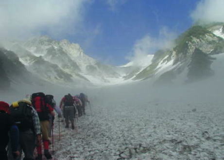 猿倉から白馬鑓への山径を左手に分け.北股入沿いの林道から登山道を経て大雪渓に向かう。 9月だと云うのに右岸沿いから臨むゴルジュには残雪が詰り.白馬尻小屋から大雪渓を踏むようなる。 濃霧で見通しが悪い中.自然落石の細かい石屑が雪渓上にゴロゴロ落ちてきた。それ以外は全くの静けさだ。 時たま聞えるハイカーの掛け声が.かなり遠くから私に耳に聞こえている。 夏合宿を北海道で迎え内地の山.北アに今入る。 大川は夏合宿に参加できなかったことで猛ハッスル。彼にしてみれば今が夏合宿だそうだ。 9月20日.新宿22:00= 大糸線「信濃四谷」の呼び名で入山するのは今回が最後になる。翌10月には「信濃四谷」は「白馬」と駅名を改正された。 「白馬」としたところから「しろうま→はくば」の読みが一般化した。 40年後.(2006年)の中央東線.新宿=白馬間アプローチ 猿倉―ネブカ平c1 |