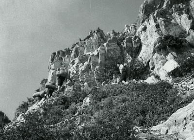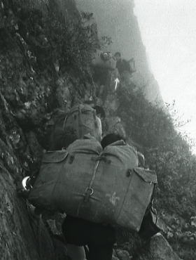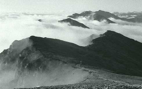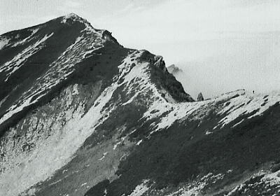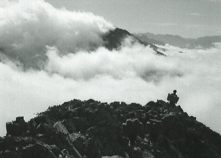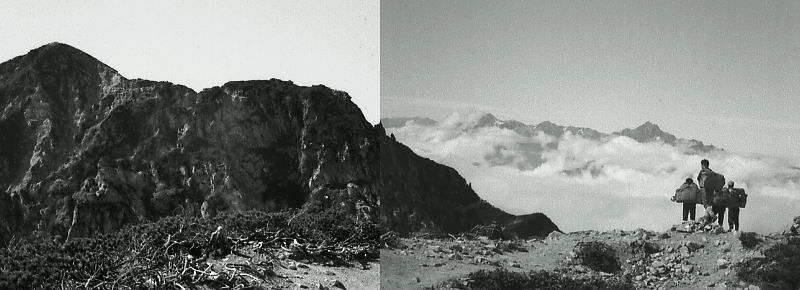 | 不帰ノ剣と飯田君 天狗の大下りは鎖が設置されている痩せ尾根. 早足は僕等をドンドン雲の中へと潜り込ます。 1年の飯田君は出掛ける前に東京で.この山稜を2年生から大分脅かせたらしく.幾ら慰めてもビクビクしていた。 女の子がキャアキャア言いながら下って行くも.彼が横目で見ている姿は滑稽そのものに思える。 不帰ノ剣が目の前を塞ぐ。鋭い岩峰と足元に深く抉り落ちる恐怖心. それでもここまで来ると.見ると聞くとは.こうも違うと納得したらしい。自分の経験に自信を持ち.彼に笑い顔が蘇る。 U峰南峰で1本取った。不思議なほど.1年生の食欲と口数が多くなる。山慣れしてきた証拠.する動作も様になってきた。 一年生全員が2年生にからかわれたようだ。夏合宿に全員が北海道山行に参加し.もう縦走には自信を持ってよい筈だった? クラブ内では松本.飯田.鈴木の1年生3人組は大人しい部類に属す三羽カラスかも知れない。 |