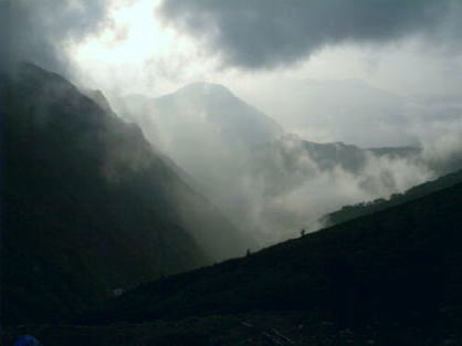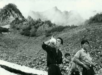 唐松岳山頂 大川と松本君 スープを作る中沢と鈴木君唐松山荘へ 縦走の途中で水を制限したせいか.1年生はポリタンの残り一滴も逃さない。 口を大きく開け雫の落ちるのを待っている。水は貴重だが.飯合と水ポリの残りは優先的に後輩の特権でもある。 湧き出した濃霧で餓鬼谷は覗めぬものの.カラフルな西欧風の唐松山荘はまだ赤く屋根だけを残し見下ろされた。 そして遥か彼方には五龍岳が流れ込むガスに顔を突き出しては消えていた。 |