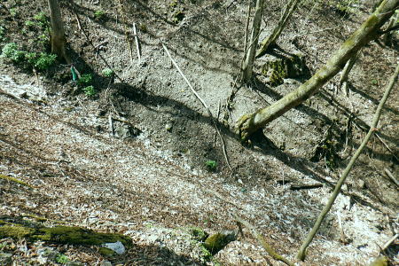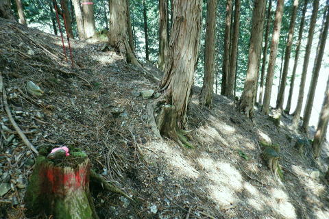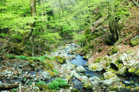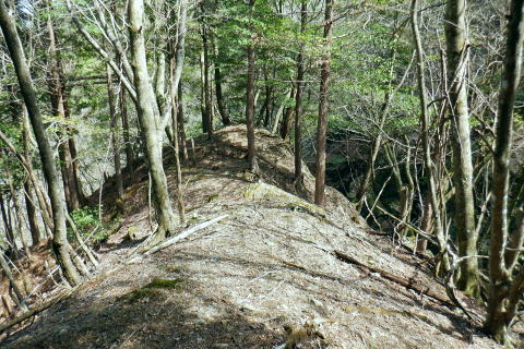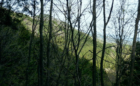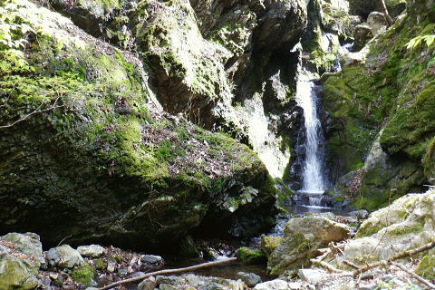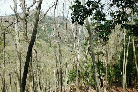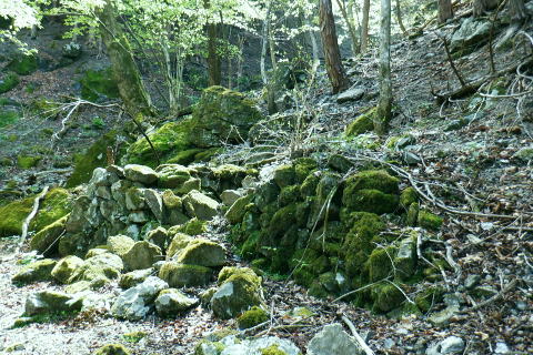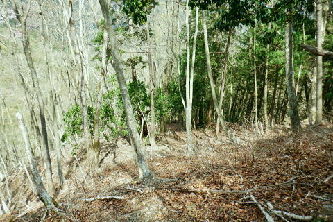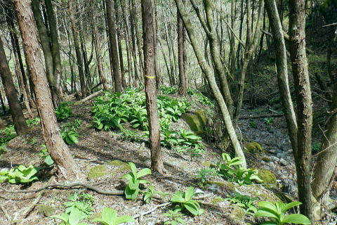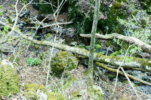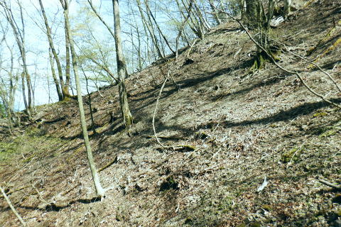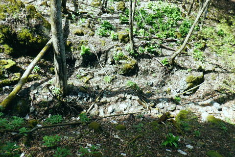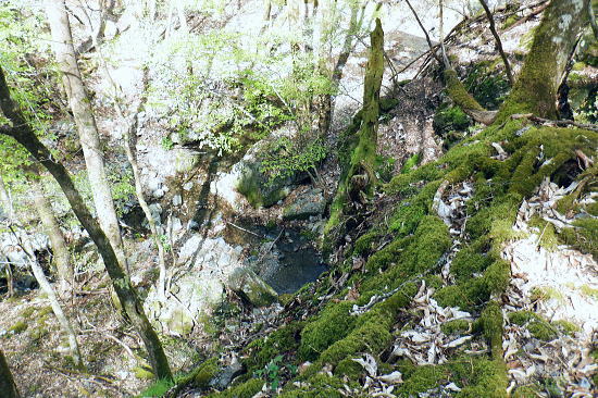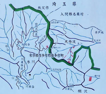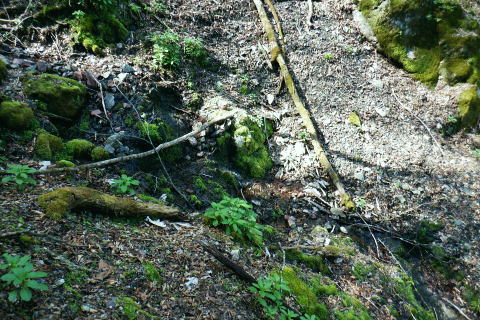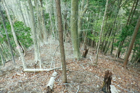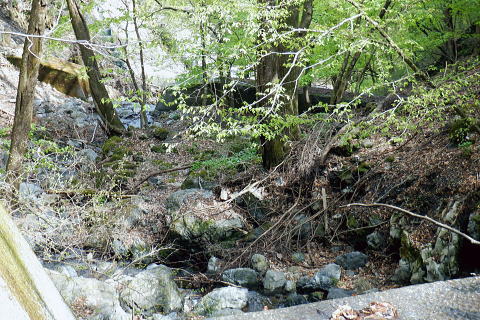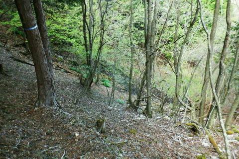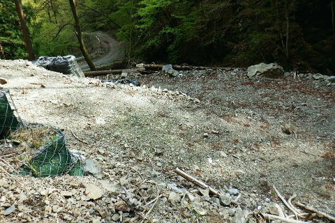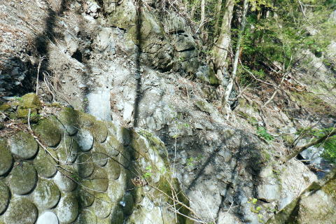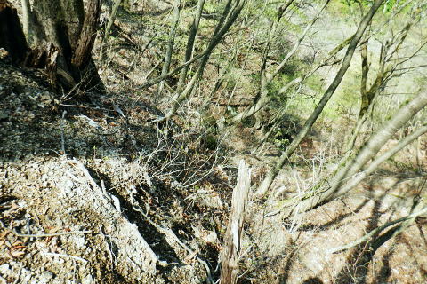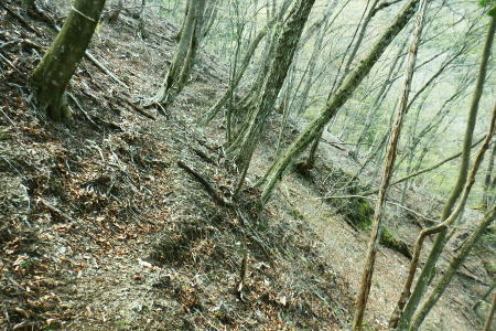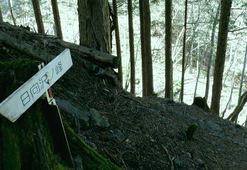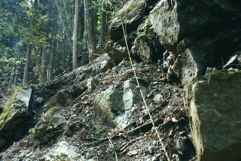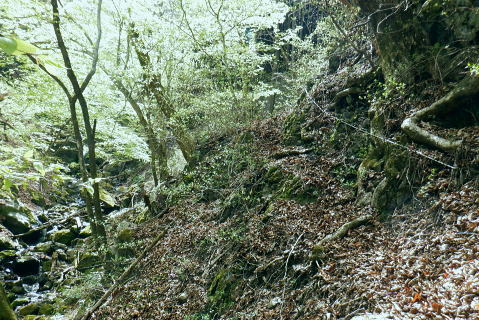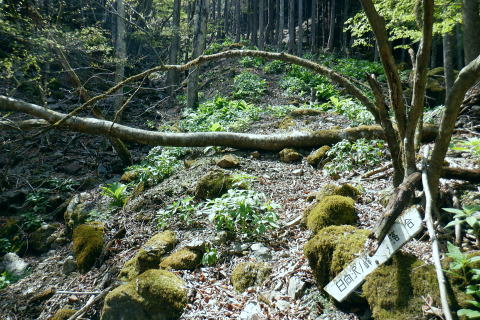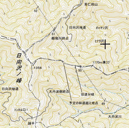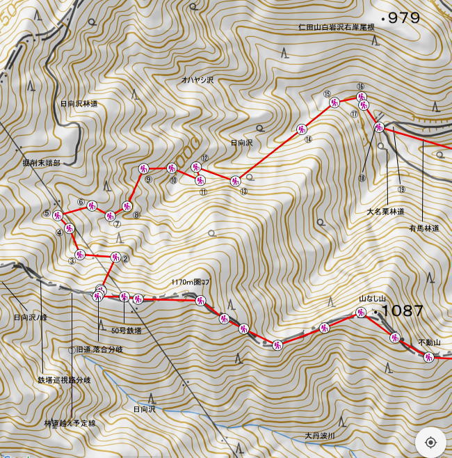 | 都県界尾根の新秩父線50号鉄塔基部に立ち.今度は奥武蔵の有間川流域に入る ・・奥武蔵山域Top 50号鉄塔からは旧道沿いに日向沢を下り.大名栗林道へ。今回の山行ポイントは最後の堰堤越え.そこには大名栗林道が横切る。 清東橋バス停から長尾丸山南尾根 長沢脊稜から新秩父線50号鉄塔 分岐から日向沢を下降し.大名栗林道を下る・・ガマカエル・幾何学的ロープ 県営・市営有馬林道から落合へ 大名栗林道から名栗湖南岸道路.さわらび湯bs @鉄塔下・落合の分岐 ![]() 薄日が陰り気味の道標「←有間林道.落合・日向沢ノ頭↓」の分岐にでて1本。12:12〜:40. 下山の尾根の取付きを確認してから頂を真近に控え.通り過ぎるハイカーを横目に見て昼食を摂ることにした。 今回も妻の手弁当とキャベツの味噌汗. 有間山稜への巡視路は分岐から中半登った所にある。日向沢のツメを横切るトラバースがあり.巡視路と兼る崩れ気味の登山道が51号鉄塔と結ばれている。 51号鉄塔の52号との三差路を示す黄色いL字杭には「51号」と記されているのは間違い.マジックテで×跡が残されているらしい。 日向沢周辺図 旧登山道の概念図旧道は最短で落合に降りられる面白いルート。前半は薄い踏み跡.最後は難堰堤があり.道中の山場を作っている。 崩落と接続不能の日向沢林道と大丹波林道 ![]() 踊平トンネル口の「保安林」の看板・・川乗谷側の予定線が破線で記されている。地形図に見る飯能・大丹波間の途切れた林道の終点。 日向沢林道 林道川乗線(733m)から繋がる日向沢線(川乗側3150m)は踊平トンネル(延長290m.幅員4m)を潜り. 背稜を越え飯能側の日向沢林道(1490m)と繋がれ.有間峠まで延長される筈だった。 それが2007年の台風9号の大規模な崩壊により2014年に国立公園内でもあり.整備計画は中止が決定される。奥多摩と奥武蔵とが 繋がる林道の筈で.完成すれば大丹波林道に有馬林道(1600m).広河原逆川林道(20422m).大名栗林道と繋がる主林道に。 尚奥多摩側の大丹波林道との繋がりも.踊平トンネル手前の崩落が激しく.現在は地形図に記されることもできぬほど荒れている。 巻道としては大丹波川沿いに踊平に至る登山道がある。 日向沢へ 北北東尾根に取付く取付きはまず日向沢東側の北北東に延びる上部の緩やかな尾根に入る。下調べ通り.赤テープ類は贅沢過ぎるほど多く付けられていた。 テープに導かれ以外と長閑な踏み跡を綴ると.左の切り開きから有間峠が見上げられた。 有間峠 幅広い尾根筋を直下.12:52手前は仁田山からの白岩沢右岸尾根だろう。大名栗林道を横切っている。踏み跡はこの林道に降りて. 右に折れると有馬林道と合わさっている。降りる所が厳しく.又大名栗林道の先は崩落地とのこと。 10分ほど下降このコースは旧登山道で廃道化されず.上手く管理され残されていた。ただ通う人より崩れる方が早く.赤テープが頻繁に付けられいた。 旧道の作業用に標杭類はないが赤テープは頻繁に見られ.見定めながら下れば林道まで間違うことはあるまい。 ただ細かい尾根筋の山腹をトラバースし.本流を下ってからの左岸沿いの枝尾根は多くあり.注意する必要がある。 先を見失った時は戻り.改めて赤テープを見出せばよい。それと最後に難場があった。 Aトラバース地点 12:58道標の逆方向へ左に折れる 確りした踏み跡も浅く.途切れるとつい赤テープを探すスタイルに 1120m圏・・「日向沢ノ峰→」の道標は過って登山ブームだった時のものだろう。それが支柱を失い. 知っかりした道標は改めて改修されたようだ。ここから日向沢沿いのトラバースが始まる。 赤テープは尾根筋から左に山腹をトラバースする地点までと思っていたが点々とあり助かっている。 ただ旧道とは言え.足場は狭く抉られ崩れ気味。薄い踏み跡は通る人が少ないことを意味していた。 数多い赤テープを見逃すと大変なことになる下山ルート。幾つもの小尾根に乗り.日向沢の本流に降りる。 少し遠目にみると判る踏み跡とテープ.12:59 小さな枝尾根を横切る.13:02B小尾根の起伏を乗り越え.西側から北西寄りへ 13:06C今度は正面に緩やかにザレる窪地を横切る。涸沢の対岸の立木下に道標を見る。分岐の道標と同じような感じ. 左岸沿いの山腹道から尾根伝いを左に分ける.3:10C尾根を直進すると小尾根の急下降になる。その手前に赤く塗られた株は直進する小尾根との二又で.株上にも小石を巻く赤テープあり。 ここは左に横切る小道を選ぶ。そして更に裏側で「白い道標」を見て.裏側の枝尾根から沢底に斜下した。 日向沢本流 13:14D道標の裏側が本流.13:12 沢底に接する直ぐ上部で本沢の右岸沿いから対岸へ下る。? 小尾根に変わり末端は左側からの二俣へ.13:16 E更に緩斜面になり.道標を振り返る.13:19この左に延びる小尾根を詰めれば飯能側の日向沢林道の終点辺りにでられるのだろう。 中間尾根末端から左岸沿いへ.13:20 左岸から横切り.再び尾根状に.13:21 尾根の末端の突き落としにでる.13:25F左山腹を回り込みながら下降し.沢底から左岸の山腹に入り込むと漸く確りした山道