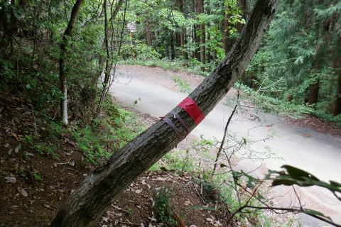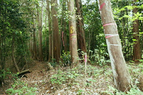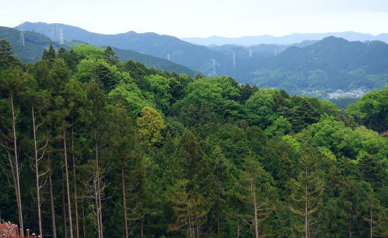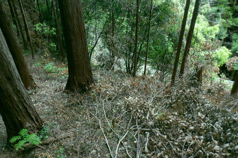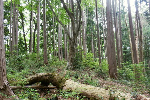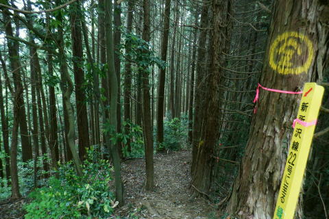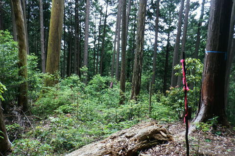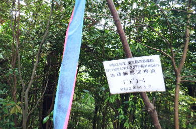 | 青梅との市界尾根(日の出町)を分け.更に三室山通矢尾根(平井川左岸尾根)を綴り.日の出町に入り. 23号鉄塔基部からは肝要峠にでて.更に小渕丘陵へ続く境界尾根を分け.新伐採地.林道三差路から細尾山を経て白山神社に下りている。 三室山南尾根から市界.通矢尾根.三ッ沢峠.23号鉄塔 鉄塔から肝要峠.林道三差路.細尾山・・真新しい伐採地の展望と地籍細部図根点を追う 細尾山から白山神社.都道184号.新井 430m圏コブ越の坂東平野 530m圏.新所沢線23号鉄塔基部から東方の展望.10:47 南方.秋川を隔てての戸倉の入山尾根方面ほぼ五日市駅前広場からも同じ風景が眺められる。正面2つの採石場は入山尾根の頂稜沿いまで削られている。 以前訪れた芳村石産(株)・美山採石場がはっきり望まれた。採石場へ下り.余りにも広く出口が分からず.大型ダンプを停めて美山町に下りている。 南方から昇って来た超高圧500KVの送電線送電線の先に延びる尾根裏を越えた秋川の流域がjr武蔵五日市駅付近 送電線の続く先はロンデン尾根に建つ鉄塔だろう。鉄塔の右奥が金毘羅山尾根に乗る南沢山。 ロンデン尾根から左に延びる端は441m峰戸深沢山。手前に隔てるのは平井川右岸流域。 送電線の一番手前が22号鉄塔鉄塔基部の530m圏コブから破線路が西側の梅ノ木林道に降り.又南側には415m点を擁する枝尾根を分けている。 この枝尾根に22号鉄塔が建ち.送電線は平井川沿いに下りロンデン尾根を越えて.金毘羅尾根に乗り.新所沢変電所と繋がれている。 新多摩変電所からの送電線で鉄塔88基で結んでいる。昭和54年7月に完成.500KVの超高圧ネットワーク送電線。 目指す通矢尾根は基部から南東に延びる主尾根を下る。 鉄塔巡視路の分岐.10:54標柱に従い右後方の巡視路を辿ると先程の鉄塔.23号から南尾根に建つ22号鉄塔へと綴られている。 長閑な林相の境を歩む.10:59 500m圏.尾根の二又.赤いコンクリート柱を左に折れる.11:08鉄塔基部から南東尾根に乗り.更に500m圏付近では南側に枝尾根を延ばしている。その尾根上の分岐.ここの本尾根は左側に延びている。 通矢尾根を下る場合は分岐の殆どは西南方面を選んでいる。左に折れるのは稀れ.尾根に林道が並行し蛇行している。 林道へは幾つもの薄い巻道があるも.間違ってもたかが知れている。馬鹿丁寧に探り過ぎた感はある。 満る植林を抜け.11:13 劇下降し.11:18 痩せ尾根になり右下に見下す梅ノ木林道.11:19 印が集まる所には林道への下りや何かがある.11:22470m圏コブ 大らかな明るい台地にでて.11:27長く南東に延びる通矢尾根. この辺の中盤に入ると高度400m台が続く緩やかな起伏の尾根が続いている。 そこを絡むよう寄り添う林道が次から次へと現れる。起伏の緩さは又分岐も多く悩まされることになる。 日の出山の会の赤帽黒柱sがあるだけでも益し.道標を見ることは林道以外殆どなかった。 肝要峠(肝要間坂) 449m.梅ノ木林道に降り横切る.11:32左下から降りてきた最初の林道. 写真の左側にある道標は下の写真。その左脇で昼食を摂る。 道標の裏側から降りている.11:34林道にでて丸太を運び昼食 12:04誰と擦れ違うこともなく.林道の道標の脇で妻の手弁当を摂る。 向かい側の道標に「肝要.日の出町」とあり.平井川肝要から綴られている旧峠路に入る。又道標の裏側に回り込めば直ぐ旧肝要峠にでられる。 旧肝要峠?・・通矢尾根を下るには深い窪溝を横切る.12:10 旧峠路の鞍部.左手下の梅ノ木林道を覗き込む.12:12梅ケ谷峠方面の分岐 梅ノ木林道が通矢尾根を東側に横切ると肝要入林道の起点にでて.更に少し進むと写真向かいの市界尾根の分岐と合わさる。 470m圏コブを過ぎ鞍部を左に入ると林道の道標に「梅ケ谷峠方面(尾根道経由)」とある。奥に見える広場は北鞍部から大久野川側に 回り込んできた梅ノ木林道。この下部で通矢尾根と分かれ.東方へと市界尾根を綴り梅ケ谷峠に至れば.長渕丘陵へと続く。 登り返した市界尾根に青梅市の2級基準点を見て.再び下降に移り.梅ケ谷峠の直ぐ南側の松葉沢. 石仏を納めた祠にでると都道251号に飛びだす。鼻山重忠の世.秩父・鎌倉を結ぶ人馬往来の要衡だった。 又梅ノ木林道に繋がる肝要林道の起点があり.向かいからは愛宕山コースから長渕丘陵に乗れる。要害山.赤ぼっこ.馬引沢峠.二ッ塚峠へのコース。 赤ぼっこに初めて訪れてから既に50年以上過ぎ.卒業し社会人になった頃で先輩.後輩と岩遊びに出向いている。確か短く2.3ピッチだったと思う。 青梅の里が広がりを見せていた。又最近では山の仲間達と大岳山の鍋割山北尾根を下った折.青梅の里に泊り.朝方馬引沢峠を散歩している。 梅ノ木林道沿いに更に南下すれば日の出町内へ.市界尾根を分け通矢尾根の左山腹に林道は移り巻いていた。 12:15「地籍細部図根点」はここから. 丁寧に綴る日の出の会の赤帽黒柱「通り矢尾根・標高」は尾根の取付きから道標代わりが続く。 地籍細部図根点 この辺から細尾山に掛け「令和元年度 東京都西多摩郡 日の出町大字大久野字永井地区外・地籍細部図根点 令和元年12月」の看板と