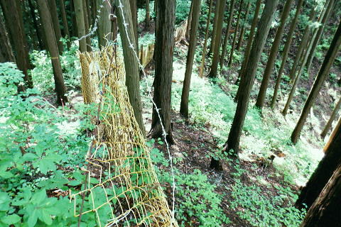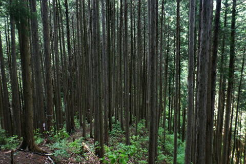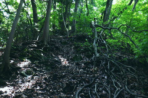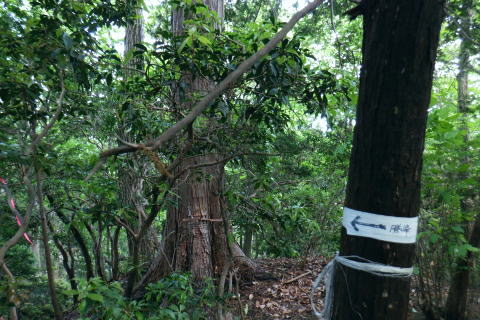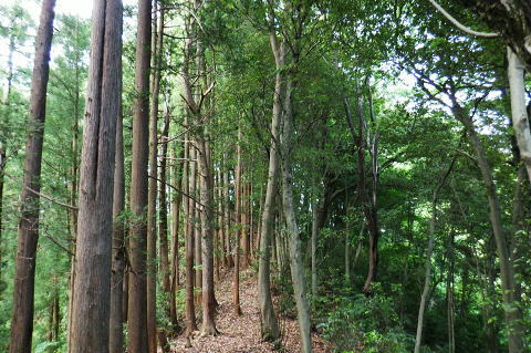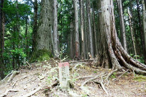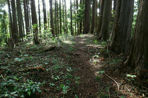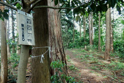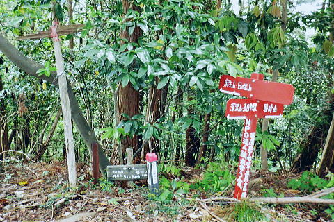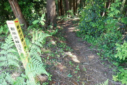 | 日の出山金比羅尾根を分け.ロンデン尾根に乗り換える。 白岩山から高度差200m前後の細かい起伏の梵天山.真藤ノ峰を越え.今度は新所沢線17号・16号鉄塔を過ぎ.勝峰山の分岐にでる。 高峰北尾根と市界尾根 金比羅尾根・・日の出山.麻生山から白岩山 ロンデン尾根・・白岩山.梵天山から深沢山北峰 幸神尾根からはためぐそ山から幸神川 白岩山(しらいわやま) ほぼ直角に右に折れる角地の頂四差路からフェンス沿いに登り.狭く漸く空地のあるような三等三角点峰に立つ。標石は4つの保護石に囲まれて標高631.7m。 基準点名は「肝要」で集落の地名. 北東方面の麓の平井川沿うに「肝要」の集落があり.その向かいの尾根に登れば肝要峠から青梅方面へ越えられる。 背は鉄条網に囲まれ,標石の脇に大きな看板「危険 立入禁止.日鉄鉱業(株)」とあり.展望どころか樹林に囲まれ常に薄暗い。 その上鉄条網に囲まれ.ゆっくり寛ぎ休むゆな頂ではなかった。頂からほぼ直角に右に折れると劇落ちる急坂の尾根に山道が下りている。 山道の左側は樹林に被われ.何も見えぬが看板から察すると石灰石採石場があるらしい。又は跡地を利用し他の廃棄物に利用しているとか? 再び訪れたい頂ではなさそうだった。 鉄条網沿いに下る 日鉄鉄鉱業の条網の境が尾根筋に.13:10頂を中心に西面,北面沿いに長く続く鉄条網のフェンスに尾根筋の左側は完全に塞がれている。樹林の途切れはなく.左下も望められず。 鞍部にでてフェンスは終えていた。 それと共に綺麗に手入れされた中木林に入る590m圏小コブ 「五日市町」の古い境界コンキリート柱.13:21淡く褪せた赤帽のコンクリート柱の傍には営林署の赤帽黒杭の境界抗が.下りの尾根筋に追番で綴られていた。 日の出山から金比羅尾根・ロンデン尾根へと綴り.深沢北峰までは市界尾根(あきる野市・日の出町).幸神尾根に移動すれば境界線と離れ 日の出町に入る。ただ東屋からためぐそ山付近ではあき野る野市との境界は地形図でも途切れぎみ.分かりずらい場所になっている。 梵天山607m 13:26突然現れた宗教的な山名. 尾根からみてはそれほど大きく魅了する山容でもない。それでも小コブの特長が見みられる頂だった。 地図を読むと北東側の尾根に破線が記されている。確りした作業道が付けられた肝要谷の二俣.中間尾根。肝要入林道が平井川の出合まで綴られている。 直ぐ南隣の小さな600m圏コブ 立木に「←勝峰」とあり.東に支尾根を派生させている.13:32600m圏の小コフからは493m点コブを擁する梵天山北西尾根が延び.肝要入林道の起点の平井川に下りている。 短時間で里に下りられる。新所沢線の20号鉄塔を過ぎると平井川の高原社の右脇にでる。境内には杉の御神木(樹高41m.幹周5.3m)が聳え. 日の出町の天然記念物。又白石岩山から肝要入林道と繋がれているものの.確り閉鎖されているらしい。 次回訪れる時は東西に歩みたく.峠越えをするに適しているようだ。平井川の肝要の里を起点として.対岸の通矢尾根.肝要峠を越え. 肝要林道と繋がれ禾引沢沿いで梅ケ谷峠の直ぐ南側に下りてればよい。この街道は秩父と鎌倉を結ぶ要所であった峠道. 古道か? 肝要の里の慶福寺との関係は? 前回の山行では三室山から肝要峠を越え尾根末端に下りている。 小コブから高度差500m下ると長いロープあり.13:35560m圏コブ 下り終え小コルを出てからの560m圏コフ.13:40ロンデン尾根はこの辺りから小コブを繋ぐ緩やかな起伏の尾根道が続く 心地よい雑木林.13:44真藤ノ峰 大らかな緩やかな起伏の尾根が続く.13:49幾つもの新所沢線鉄塔 この辺から送電線新所沢線の架かる領域になる。 次のコブ.真藤ノ峰543mは北東と南にそれぞれ2つの支尾根を派生させている。18号鉄塔を擁する北東尾根は西細尾の大平川大場入出合に没し. 南尾根は南面の本沢沿いを綴る深沢林道に向かい落ちている。直進するロンデン尾根はL字標柱に導きられ17号鉄塔基部にでた。 その標柱の指す南支尾根を下ると16号鉄塔があり.ピストンしている。 ここからは横切る深沢林道が尾根先に抉り落ちるよう見下ろされた。 この辺は殆どの枝尾根は何処も踏み跡が続いている気がするが定かではない。左に回り込ばと思う?対岸は5号鉄塔. 新所沢線17号鉄塔 17号鉄塔の基部と東電の石柱.14:02 :15鉄塔基部を過ぎてL字標柱が立つロンデン尾根の分岐,そのまま直進すると右に回り込み.南枝尾根の巡視路に入り込む。先は16号鉄塔. 再びロンデン尾根に戻るには左に巻き込むよう山道を取っていた。16号鉄塔基部手前の標柱は15号を指し.左後方の小コブ方面に下りている.14:06 16号鉄塔への枝尾根は緩やかに窪溝状を下りピストン.14:20 新所沢線16号鉄塔の基部から登山道へ戻る.14:15手前のL字標柱に戻り.再びロンデン尾根に乗ると鞍部を越えて448m点コブにでる。立木には赤テープを挟み白いテープが巻かれていた。 南尾根には幾つかの平坦地を抜ける薄い踏み跡があり深沢林道に降りているよう見える。尾根下を直接下るのは無理. 西側の小沢側には破線が延び.林道から16号鉄