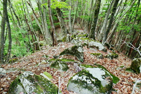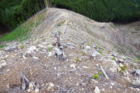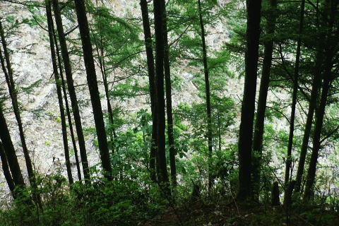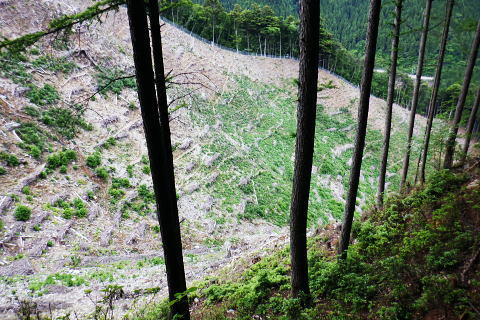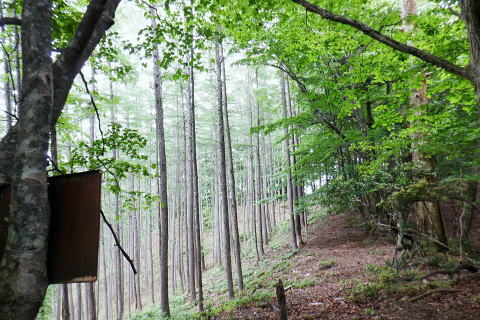 | 鶴川.飯戸から笹尾根を越え南秋川の数馬へ 鉢指沢ノ頭東尾根「深山の路」から東尾根を分け.1149m点コブから待望の伐採地.井戸入右岸尾根に乗る 飯尾から大茅南尾根のツメ.二又 南尾根分岐から大沢ノ頭・鉢指沢ノ頭東尾根.「深山の路」分岐 東尾根を分け.1149m点井戸入右岸尾根・・伐採地上部と「深山の路」 1000m圏肩から伐採地跡を抜け井戸入 左.井戸入中間尾根の尾根と右.鉢指沢ノ頭東尾根の分岐.14:35 左尾根は「深山の路」と1149m点峰.14:401149m点峰と井戸入中間尾根 鉢指沢ノ頭東尾根を分け左手の1149m点峰西肩へ.14:52深山の路の分岐点 左景.1130m圏・・左の尾根に「深山の路」が乗る取付き.14:45ハチザス沢ノ頭からの東尾根は熊倉山先の分岐から三頭沢に下るコースが「石山の路」で.分岐先の東方面は「深山の路」で閉鎖中. 「深山の路」の面 「深山の路」コースを面とする尾根は井戸入左岸沿いに下り.北東に延びる尾根の中半まで尾根を下ってから1049m圏で左に折れ. 北側の劇斜面で枝沢(六四郎ノ沢?)を横切り.高度60mほど登ると地形図に「950」と高度が記された尾根に乗る。 日蔭三頭ノ沢から石山の路でハチザス沢ノ頭東尾根に至る丁度中程にある1210m圏コブから派生する東尾根。 劇斜面の東尾根を下っているが.横切る破線路から傾斜は緩み.踏み跡はないが三頭沢沿いの都民の森への旧登山道に出られる。 980m圏で尾根を横切り.更に直進すると「深山の路」の踏み跡は確りし.トラバースしながら.三頭沢へ降りてをり.対岸には立派な林道がある。 奥多摩周遊道路からは都民の森へと「ケヤキの路」と繋がれている。この交差点には2度ほど歩いているが.膝までのラッセル時と. 三頭山中尾根のバテた下山時で..記憶には残されていなかった。 又沢沿いに遡れば「石山の路」のなかばで結ばれてもいる。多分ここも「深山の路」になるのだろう。 地形図では細い破線の尾根の右境は広大な伐採地。三頭沢最上流の伐採地で井戸入流域と共に広く.伐採されている。 これからその井戸入流域に入り.中間尾根の坊主山を末端まで下る。 1149m点峰の西肩 右景.分岐の右方前方は井戸入流域に続く伐採地のツメ左側は途切れ.右上は1149m点コブになる 1149m点の緩やかな丘のような頂 コブの裏側には鉢指山東尾根が延びている.14:50先は再び東尾根に入り込む。気持ち戻り.頂から北東に延びる尾根・井戸入流域に入る。 井戸入中間尾根 1149m点コブより北上小コブの尖ッ突きなで尾根筋の左は伐採斜面.右は雑木が続く , 左方は明るい六四ノ郎沢の伐採地最後の伐採尾根に入ると途端に.恐らく奥多摩周遊道を走る車やバイクの騒音が耳に付く。 対岸.六四郎ノ沢の伐採地斜面砥山 別名「戸沢ノ峰」.14:58 抉り落ちる尾根筋の左肩を綴る 小さな尖っ突きを越え 六四ノ郎沢沿いの伐採された斜面跡地尖ッ突きのコブ ブッシュ末端の小コブを越えると伐採地.15:05ここは左手は無理.尾根筋右側は藪絡みの踏み跡。過ぎると裏側に伐採地が切り開かれた。 伐採地跡・待望の台地に足を踏み入れる。 1050m圏の台地・・長い道中を終え.待望の伐採大地に着く.15:07左側は六四郎ノ沢.右側は井戸入. 更に鉢指沢ノ頭東尾根を跨げば鉢指沢.のの間が広大な伐採流域になる。 小コブを越え伐採地跡の大展望台にでる。 この一区画を望むために今日は東京から出向いてきた。朝方から登ってきた全ルートも.ここに来るためのアプローチでしかなかった。 ブログ「奥多摩 尾根歩き」氏の山行を拝読し.目に惹き付けられたのがこの1枚の写真だった。その場に立ち.眺めてみたいと出向き.今立っている。 見慣れた山々の光景も方向を変えて眺めてば違った姿形を現わし.私を喜ばす。鉢指沢流域には東尾根を含め何度が通っている。 ただこの景観は初めで想像できなかった眺め。まして伐採地の訪問は近頃多い中.今日は雨も留まり特別の眺めになっている。 砥山(戸沢ノ峰) 北面・・砥山の南側を回り込む奥多摩周遊道路鞘口峠・栂ノ木尾・砥山の山腹を大きく回り込む林道は風張峠と結ばれている。・・浅間尾根上端の取付き地点. 浅間尾根上端 正面は井戸入右岸尾根御林山.道奈良山.内台山連山と浅間尾根の下腹部を横切る周遊道路 浅間尾根の下端 東方・・南秋川沿いの山々.浅間嶺方面浅間尾根と笹尾根に挟まれた谷間は周遊道路と檜原街道 井戸入の真下に延びる尾根の末端周遊道路の先が三頭川 九頭龍神社脇に落ちる森ノ沢に向かい大きくUターンを描く周遊道路. 九頭龍神社の斜め前が数馬バス停. 井戸入中間尾根の1000m圏肩 1000m圏肩を見下ろす.15:12尾根を末端まで下り.井戸入の出合.植林線との境に見ずらいが小さく作業小屋が見下ろされる。 あそこまでこの広大な丸坊主の伐採地跡の台地を綴る。先の1000m圏肩からは更なる劇勾配になる。 伐採地に入るり.今まではストックを畳み背負っているものの先は如何なることやら。 飯尾から大茅南尾根のツメ.二又 南尾根の分岐から大沢ノ頭・鉢指沢ノ頭東尾根.「深山の路」 東尾根を分け.1149m点井戸入右岸尾根・・伐採地上部