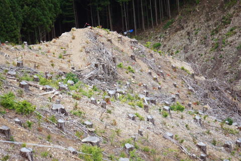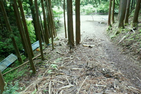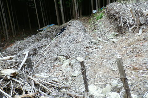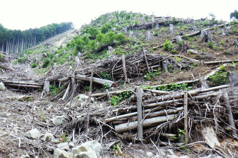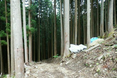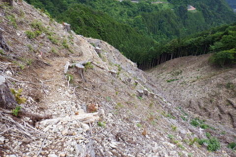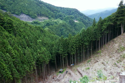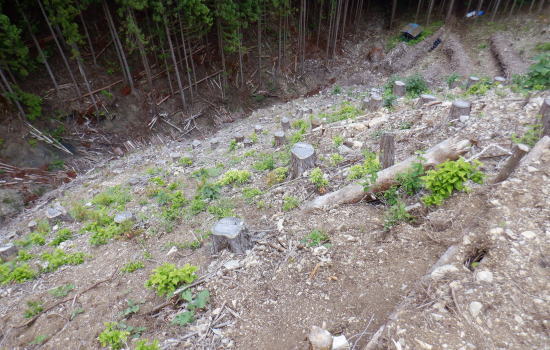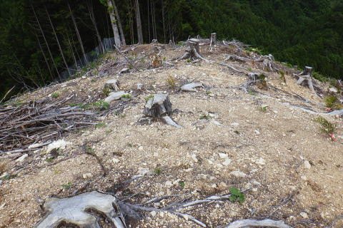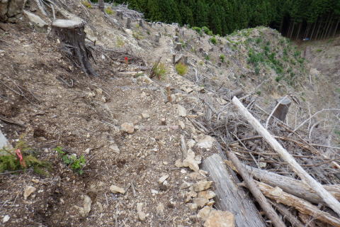 | 続.丸坊主になった伐採地の尾根の山に乗り.最後の伐採斜面まで丁寧に降りる。 1149m点コブ井戸入右岸尾根を下り.伐採地1000m圏肩から伐採地跡の末端へ―奥多摩周遊道・旧道から檜原街道から数馬 飯尾から大茅南尾根の二又 二又から大沢ノ頭・鉢指沢ノ頭東尾根「深山の路」 東尾根を分け.井戸入右岸尾根 1000m圏肩から伐採地跡を抜け井戸入・・伐採地下部と数馬 前方は井戸入中間尾根の1000m圏肩 1050m圏.沢底に蒼い作業小屋が見下ろされる.15:171050m圏から左前方(北東)に派生する枝尾根を分け.東側の1000m肩からは目一杯に広がる劇斜面が見下ろされる。 足元には植林のための足場が丁寧に細い作業行程の下こしらえ作られている。それは絶壁を思わす崩れ落ちるザラ付きの乾いた土壌。 伐採地の土砂を留めているのは切株のみにも見られるがそこを上手く工夫して植林の為の小径が作られている。小径と云うより窪溝. 道幅は両足が乗る程度.移動するにもバランスを必要とし.ストックが支えになる。ただあくまでもバランスで.足裏にストックに重みを与えれば土砂は崩れる。 その上脇を見下ろせば壁のような斜面で.土がよく留まっていると感心するほど。人が通る都度.崩れるような場所だった。 遠くから見ればただの丸坊主の禿山. 場所により目に見えぬ苦労が伺え.又それを乗り越える知恵に今回は感心させられている。 ここは現実的には危険を越えた小路の保護のためにも「通行止め」にすべき場所だった。土砂を安定させるためにも。 通るハイカーの方が可笑しいようだ。水分の吸収力ある苗木が植えられていた。 浅間尾根と植林された苗木の主作業道 15:20ここも見た目は緩斜面に見えるもストックの使用も危険。両手でバランスを取り.切る株をフルに利用して下るに限る. 尾根末端 向いの尾根との間には途切れ.劇坂の落ち込みがある 1000m圏.降りて来た斜面を振り返る.15:22 尾根の右山腹を廻る作業道.15:23対岸は1149m点コブから延びる左俣の尾根 植え付け小路 斜面には目には見ずらいが細かく植え付けの為のザラザラの台地に小路が作られている。 そこは流されぬよう木留めがメーンだが.あるものは何でも使う主義のように枝絡みの細かい枝木まで利用していた。 右脇の斜面.正面末端は超激 950m圏.15:27 メーンの作業道.15:39 900m.劇斜面下に倒木が転がり散乱している.15:36半端ではない斜面を降りた。前半はストックを畳み.後半劇斜面では反ってストックを必要としている。 雨天の場合は折角の小路を崩す恐れ代。入山は諦めるべきと自分なりに思ふ。 大分大きく見えだした作業小屋.15:36 これだけ大きな丸太は途中でも見受けられなかった.15:38 井戸入の作業道取付き入る.15:41井戸入 小さな井戸入を横切り.右岸のメーン作業道へ.15:42 中間尾根の末端にでる.15:43 井戸入の沢底に降り.もう一度振り返える.15:44頂点から降りてきた。 植林を抜ける作業道.15:44 向かいは奥多摩周遊道路周遊道路を左に折れれば旧道と合わさり.左に都民の森の旧道を分けている。 左に折れれば直ぐ六四郎ノ沢を横切り.三頭山を最短コで登るには「ケヤキの路」経由がある。 周遊道路手前の広場からは右脇が出入口.倒木に座り最後の1本を取る。数馬発バスの時刻までギリギリと知り.慌てて腰を上げている。 周遊道の右脇に流れる井戸入.15:48小屋から排水されている水道施設のようだ。 周遊道を下り左に折れて下れば旧道・宿街道にでる.15:54今回はそのまま周遊道を下り.右にカーブする地点に「三頭山荘」の白い看板があり.そこを左に折れ下れば旧道へ。 又鉢指沢ノ頭東尾根の末端に辺り.墓地の裏側の側壁の階段から周遊道に下りている。その先は鉢巣沢橋。 旧道の三頭橋と先は右の九頭龍橋と合流点 檜原街道からの二又を振り返る.15:59ここは何度も通っているが今回も九頭龍ノ滝に立ち寄らず。左は「都民の森」に繋がる奥多摩周遊道路. 右は旧道と数馬温泉口。 右手奥のガードに囲まれた青い標柱は「秋川上流端・多摩川水系上流河川.桧原村数馬.標高717m.西多摩建設事務所」とある。 九頭龍神社を左に見て通過.16:00神社の左脇が森ノ沢(宮ノ沢橋). 背は浅間尾根の1120m圏コブ森ノ沢右岸尾根. 終点.jr武蔵五日市駅bs.17:11数馬バス停に着くと外でバスの運転手に迎えられた。時間を聞くと直ぐでるとのこと。出発時間すれすれに来る人がいないか確認しているようだ。 道中車の往来は少なく.慣れた手付きでの運転。乗客は私を含めてハイカー3名.市街地に入ってから如何にか立つ人をを見ている。 往路は大勢の乗客が居たにも拘わらず.山中は大沢ノ頭で単独のハイカーと擦れ違っただけだった。 間を開けた山行の割に不詳もなく.のんびり歩めホッとした自分がいた。復路は便よく東京にでる。 16:07数馬bs:09=17:14jr武蔵五日市:18=17:56立川.中央特快18:08=18:37新宿=大江戸線・・日没.18:59. 今回の概念図 麦茶.紅茶各500cc.コーヒー150cc.妻のカツ.卵サンド.ネーブル.饅頭 飯尾から大茅南尾根の二又 二又から大沢ノ頭・鉢指沢ノ頭東尾根「深山の路」 東尾根