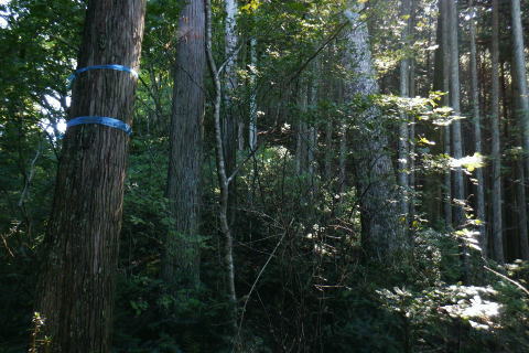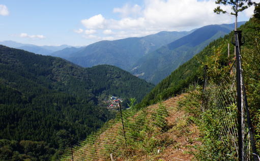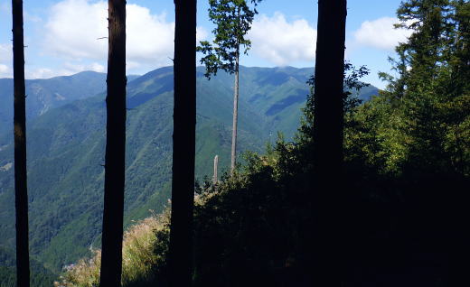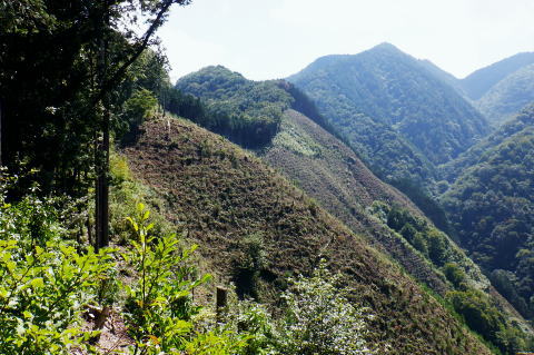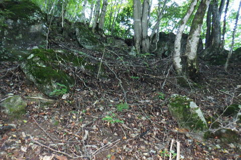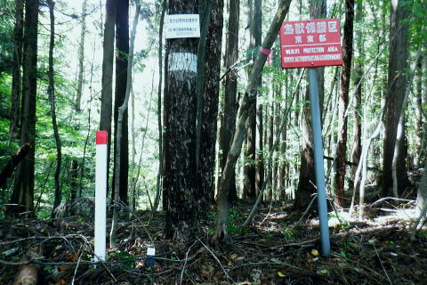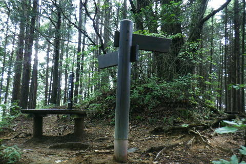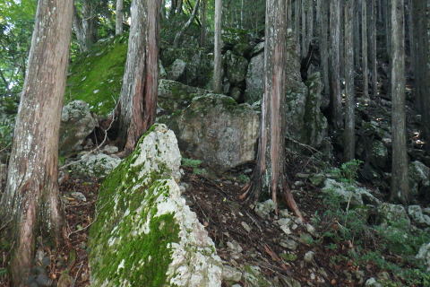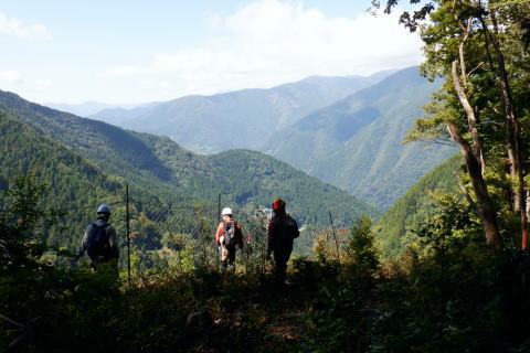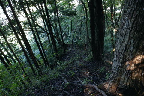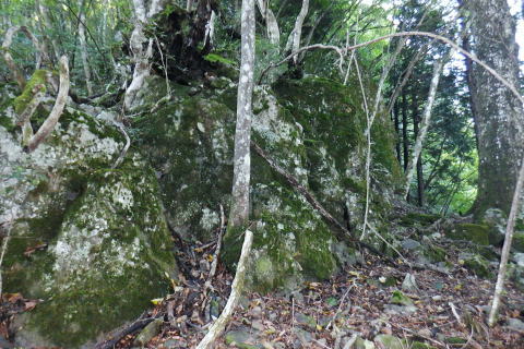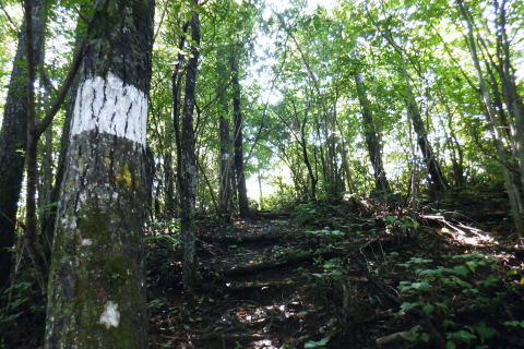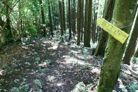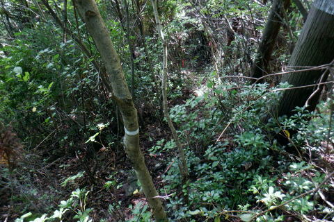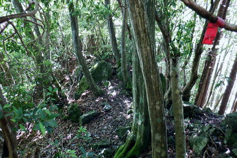| 露岩帯から伐採地の遠望台にでて.江戸小屋尾根と鞘口山 山ビコ尾根の露岩帯を越え江戸小屋尾根と左前方から合わさる伐採地からの展望を楽しむ。江戸小屋山尾根に乗りと背稜は鞘口山 橋詰から山ビコ尾根・680m点 露岩帯から鞘口山江戸小屋尾根・・岩場と伐採地 黒ノ戸山中尾根から神戸岩入口Bs 山ビコ尾根 700m圏.植林から露岩帯へ.9:35露岩帯に突入 720m圏.この足元から露岩が尾根状が続く.9:38 最初は左を巻く.9:40岩稜の迫力は見た目より写真では劣る光景だが以外と厳しい岩場。 最初は左に巻道があり.直ぐ露岩を繋いでいる。ポイントは最後.左に回り込み傾斜が増す中.尾根上にでる。 9:42 露岩上.9:47見た目よりスケールが大きい岩峰 760m圏.正面から左に大巻きする.9:49 側壁も回り込む.9:51 その並びの土壁を縫い這い上がる.9:55Z字に左上へ斜上.ストックは片手に束ね這い上がっている ひと段落し.中段裏側の左上から尾根に乗る.9:59歩きはガリ股歩きだったが最近は散歩でも意識して改善していた。この急陵な狭い岩場を抜けるのに.内股で踏ん張り続けた為か. 足の疲れと重なり.露岩帯を抜けた時は気が緩み安心したのか江戸小屋尾根に合わさる辺りで.右足.腿上の筋に異変を感じていた。 危険度としてはストックを畳まず.手に2本を束ねて這い登っている。やや急な斜面で.調子に乗り膝を高く上げ過ぎての登行か? 尾根に乗った下部を覗く.10:04岩場を終え トレーニング不足に係らず調子に乗り.膝を高く激しく動かしてしまったようだ。登り終えて軸足の右膝上の筋を少し痛めたようだ。 江戸小屋尾根と合わさり登山道にでて楽になる筈の足が.急に張り重みを増している。少し庇いながらの登行に変わる。 尾根上部.10:04鉄の支柱が1本立っていましたが撮り忘れる。何故かも不明なもの。 尾根幅が広がる斜面.立木には白帯が付く.10:10 広く開かれた台地状の斜面,10.16這い上がると傾斜は緩み.立木に付く白帯が点々と現れ.明瞭に導きはっきりした山腹道に吸い込まれるようなった。 10:28850m圏付近に這い上がり尾根幅は更に広がり開けだしている。 途中でアケビらしきものを見て.黄色い「奥多摩駅→」と書かれた立木を見る。江戸小屋尾根の方向を指していた。 水平山腹道になり.病院裏からの江戸小屋尾根との尾根伝いに.幾つもの赤テープで合わさる。 このコースは10号鉄塔から井戸入林道に降り.慈眼寺の境内に降りられていた。920m圏で.尾根道はここから明瞭な踏み跡に変わっている。 西方の景色・・小河内ダム 左景.920m圏.掠れた左奥は大菩薩嶺と鶏冠山.10:35江戸小屋尾根に乗り伐採地にでて.尾根沿いの北側から西側に掛けての展望が開かれる。 水根山榧ノ木尾根の末端は戸倉山 右景.小河内ダム下の水根と中山・むかし道の起点右手前が先月登った榛ノ木尾根に突き上げる井戸小屋尾根 惣岳山シダクラ尾根 左景下.ミニチュアに描かれた栃寄森の家シダクラ尾根の下端には送電線.多摩第一線の7号鉄塔が建つ 石尾根・・鷹巣山と六ッ石山・三木戸山 右後方を振り返り.10:41中央に横切るのが榛ノ木尾根,左の多摩川に落ちる尾根は井戸小屋尾根・沖ノ指山南尾根.イソツネ山南尾根。右の谷間は小中沢で源は六ッ石山. 伐採地からは白帯に続き.赤帽白柱が先を示すようなり.登山道は踏み固められた道へ。植林帯に入ると直ぐ九竜山にでた。 九竜(重)山 10:46別名として九重山.栃寄向フ山.1954.0m. 向かい合わせの縦走路.「鳥獣保護区」の看板に黒帽白杭も。 尾根筋を南方へ詰める。頂点は鞘口山.10:49 920m辺りの小さな露岩帯.10:51木や岩を掴みながら抉り落ちる痩せ尾根. 斜面を慎重に下る。この江戸小屋尾根も白帯が立木に点々と付けられている。 95m圏コブと江戸小屋山 九竜山の下り880m圏より.11:00鞘口山.黒ノ戸山.御前山.惣岳山 伐採地からまだ遠いい鞘口山榧ノ木尾根と倉戸山 伐採地の最高部にて.11:06 11:22樵夫. 伐採地最上部の930m圏で3人の樵に出会い.声を掛けられる。 尾根を挟むよう最近両脇に真新しい鹿柵が設けられている最上の伐採地。写真の鹿柵の足元には最近苗木が植えられ. その下草刈が今日の仕事のようだ。右の境界標.「首分収育林地境界木.東京都森林整備公社」は脇に落ちていた番地, 入山から詳しく尋ねられたが橋詰から入山し先は岩場で足を痛め考慮中. 恐らく中尾根に変更し下ることになろう。 まだ筋が少し痛むと伝えている。「気お付けて!」と言葉を頂き別れている。 又下山して仕事を終えた彼等と神戸岩入口バス停傍の釣場で再会することになった。 遠望の江戸小屋山 大ダワ付近の縦走路から振り返る・・2018.03.03/13:24背は石尾根三ノ木戸山・・トバノ岩山クレド沢右岸尾根からクロノ尾沢右岸尾根から赤井沢出合へ下りた折..繋ぎの大ダワを過ぎて撮影した。 江戸小屋山 伐採地から植林帯に入り.970.0mコブを通過.11:30左方に今回も眺められた鋸山とそれに連なる雄大な山稜は撮り忘れている。 雑木混ざる劇下降し折り返す.11:35 下り返す930m圏のコル.11:38小さなコルを越え2つの作業道を横切る。前回と比べ