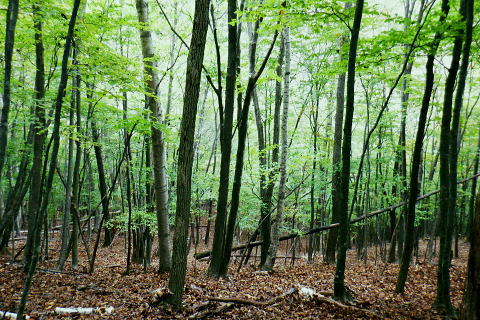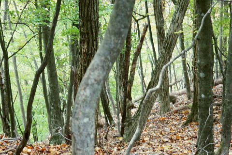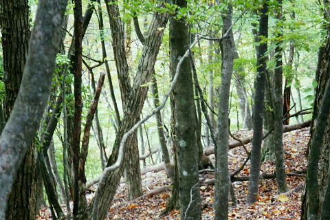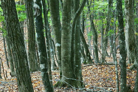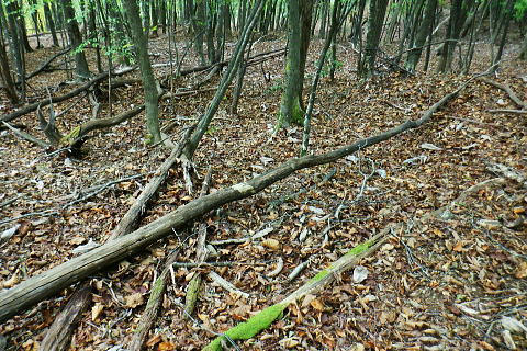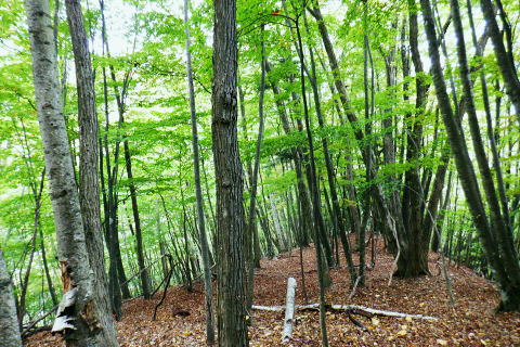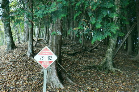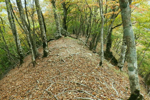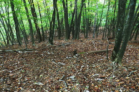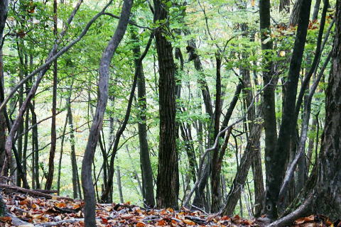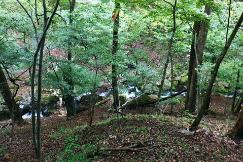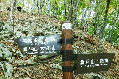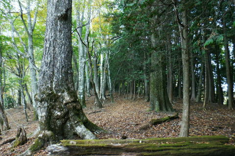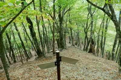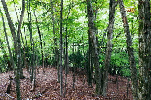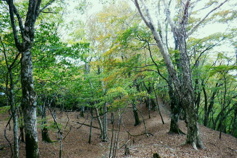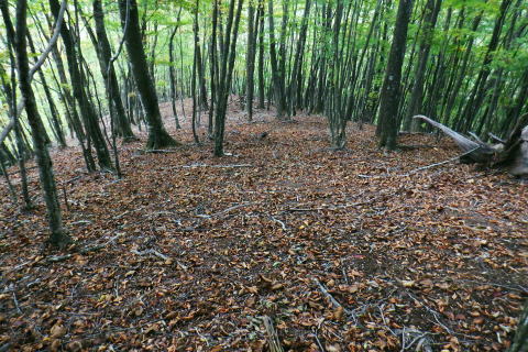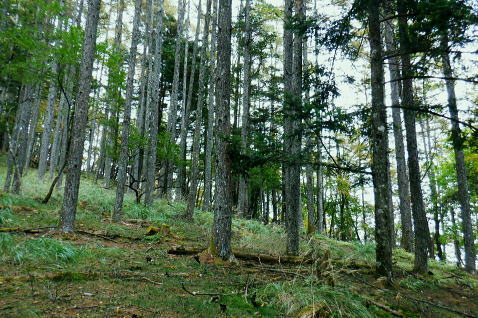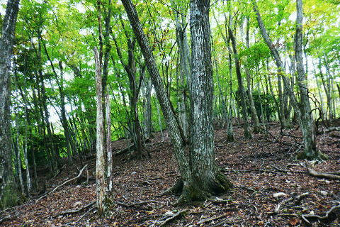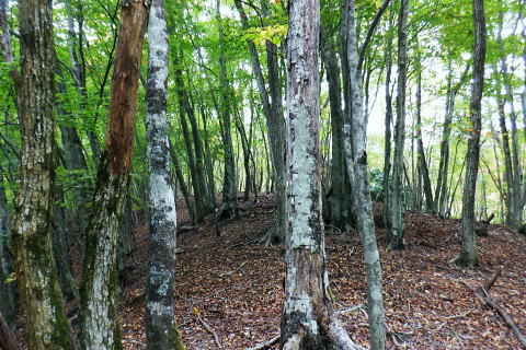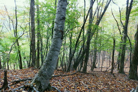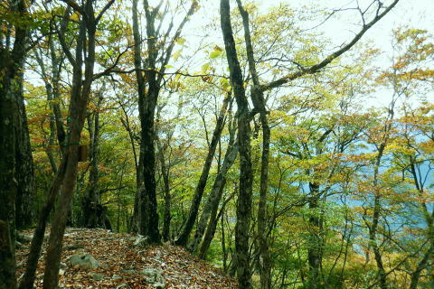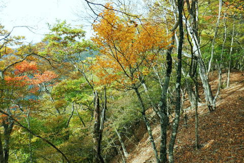 | タカナメ沢右岸尾根から水根山直下で榧ノ木尾根に移り.榧ノ木山まで尾根筋を下る 榧ノ木尾根1530m圏から奥沢と水根沢を隔てる榧ノ木山に立ち.越えた裏側の北面に当たる三本ケヤキ沢右岸尾根を下降する 峰谷bsから奥沢林道に入り.タカナメ沢右岸尾根 911m点で奥沢中腹道を横切り.水根山直下から榧ノ木尾根 水根山南尾根尾根を下り.榧ノ木山から三本ケヤキ沢右岸尾根・・だらけた動きの猿軍団 尾根末端の水根林道から奥多摩湖 榧ノ木尾根は水根沢と入奥沢.雨降谷と分水する長大な尾根で榧ノ木山を擁し.ノボリ尾根は入奥沢と雨降谷に挟まれた尾根。 榧ノ木尾根を詰めれば直ぐ水根山にでられる。水根沢や榧ノ木尾根から派生する支尾根には手の加えられていぬ自然林が残されていた。 ただ紅葉の季節感を味わうには早かった。 榧ノ木尾根に乗る 1530m圏.違った光景により異なる雰囲気を持つ落葉松林.12:21榧ノ木尾根の左.直ぐ上の頂が水根山(金左ノ頭)1620m。気持ち榧ノ木尾根へ降りた所に鷹巣山南山腹道の分岐点.1600m圏がある。 その下に合わさるのがタカナメ沢右岸尾根合わさる1580mの尾根合流点の分岐。その手前山腹を横切って1530m圏にで出いた。 落葉松の森.12:22 12:26尾根を下って「←石尾根・倉戸山→」から「水根沢林道の分岐」を通過。 左に折れ榧ノ木尾根を下り始めて最初の道標.12:23 次の右側に立つ新たに立て替えられた道標は奥沢山腹道の切られた腕木はなくなっている。 左奥のロープの先は「奥」への入奥沢山腹道の取付きで.先程はタカナメ沢右岸尾根を詰め.山腹道を横切り榧ノ木尾根に乗っている。 1420m圏.13:30登山道の右手に林界界標「76/77」を見て.広い尾根を南下し.再び林班界標を見ると水根林道への分岐にでる。 1410m圏.水根の下る分岐を振り返る.12:31左上から下ってきた。右手は石尾根の南側山腹道に入り.途中に水根沢林道の分岐があり.右下へ下れば水根沢の山道に入る。 1462m点コブ 小コブを越え南下すると榧ノ木山.12:35榧ノ木山 標高1485mの山頂の懐かしいブルキの山名標が今も残されていた.12:51別名.長久保山. この前後に真新しい山名標が立木に付けられ.この後は山名標の裏側の三本ケヤキ沢右岸尾根を下る。 右後方に朧に望まれた鷹巣山 右手の谷・・入奥沢流域の明るみ.遠方は浅間尾根 背稜の南尾根を下る.足場は驚くほど奇麗.12:53登り尾根の分岐1430m 12:55榧ノ木山の南側肩に立つ真新しい道標の裏側から降りている。道標の向かいがノボリ尾根.過ってラッセルし登ったことがある。 紺碧の空にブナ林を抜けた覚えがある。右手は榧ノ木山の西側を巻く縦走路で.当時は今下ってきた榧ノ木尾根を逆に. 淡雪の煌く雪面の白さに踊らされ登っていた。 左はシンナシノ頭1344mから倉戸山を経て.山上集落から尾根末端から湖畔の戸倉・熱海にでられる。 ここを初めて下った時も残雪期だったと思う。緩やかにうねる雪被る丘のような尾根も素敵だった。 又戸倉山から南西の尾根は湖畔の女の湯にでて.大麦尾根は小河内ダムに直接下りている。 1430m圏.シンナシノ頭手前の小コブで昼食.13:00〜13:30示唆し振り妻のサンドイッチとホットの紅茶を.食後はオレンジと。北面の降り口が分からず.焦っていた訳でもないが片手にサンドイッチ持ち. 周りを探り回っている。時には何故か体が動くことがある。落ち付かないのか? そして安心すれば食事も終わってしまう始末。 20mほどの尾根の下角が榧ノ木尾根との分岐だった。ここから尾根と分かれ.右寄りに少し回り込めばシンナシノ頭から倉戸山に下りられる。 分岐で2人の単独ハイカーと擦れ違う。後は水根に降りてからやはり2人のハイカーと出会っている。 ドジ メモ書きの地図を忘れての山行.自慢している訳ではなく情けない。周りの主尾根・支尾根は結構歩いてをり概念は分かるものの.情けなさが募る。 タカナメ沢右岸尾根は劇斜面だったが迷いことのない1本道でホッとしている。奥沢中腹道も歩いているので気が休めていた。 三本ケヤキ沢右岸尾根は初めてのルートで三本ケヤキ沢と榧ノ木山尾沢を隔て.中半の尾根二又で.左尾根を選び.三本ケヤキ沢の出合で水根沢に没する。 尾根筋に林相の境があり.非対称の三本ケヤキ沢沿いに気を付けて下るに限る。1250m圏の尾根から左に分かれる所がポイントとなろう。 後は1050m圏から北側の斜面に逃ればよいようだ。最後の詰めの林道に降りる所が岩場か.土壁か.或いはないと思うが鹿柵か.考えると悩むことになる。 三本ケヤキ沢右岸尾根 1420m圏肩から水根川へ向かう・・13:20昼食後.私は漠然とした斜面の先に支尾根を見付け左寄りに下ることにした。すると 間を開けず尾根らしくなり.北東に延びている。 1350m圏.下り初めて直ぐ.尾根を横切る猿の軍団に遭遇.13:30だらけるよう移動する猿軍団 尾根幅が右寄りに広く開かれる台地.13:31尾根から分かれた支尾根の広い尾根伝えで間を開けて尾根を横切る数多くの猿軍団と出遭う。 だらけて行動する軍団は統制と云うようなケジメもなく.長く尾を引き.のんびり右