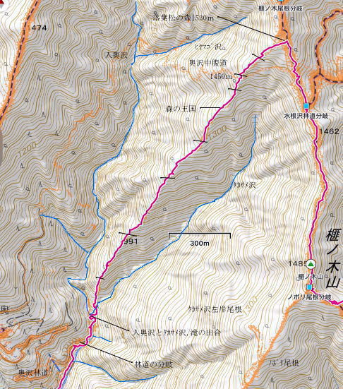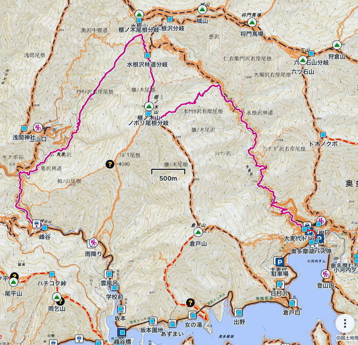 | 榧ノ木尾根を跨ぎ.2つの支尾根を繋げ.峰谷から奥多摩湖々畔へ 榧ノ木山を越え北面の三本ケヤキ沢右岸尾根の末端.の根沢出合からは水根林道起点水根・奥多摩湖.小河内ダム 峰谷bsから奥沢林道に入り.タカナメ沢右岸尾根 911m点で奥沢中腹道を横切り.水根山直下から榧ノ木尾根 水根山南尾根尾根を下り.榧ノ木山に立ち.三本ケヤキ沢右岸尾根 尾根末端の水根林道から水根・奥多摩湖bs・・小河内ダムbs 水根沢 水根山の南東面を源と発し.榧ノ木尾根.石尾根.六ッ石山南尾根に取り囲まれた水根沢は.奥多摩湖の小河内ダム下に注ぎ込む多摩川の河川。 又この河川は多摩川水系における川海苔の名産地としても知られている。以前.日陰名栗峰ヤケト尾根から水根林道を日没と競争して下っていた。 又榛ノ木尾山へは水根沢左岸のアシダキ沢右岸尾根を登ってもいた。 水根沢右岸の三本襷ノ沢 右岸沿いから始る石垣道・・2015.11.28/15:40名栗峰ケヤト尾根を登ったた時は鷹ノ巣山南面山腹道から水根沢林道を下り.奥多摩湖の湖畔にでている。 その折は水根沢1000m付近の右岸に落ちる三本ケヤキ沢出合の木橋で渡っていた。正面の石垣は下ってきた右岸尾根の下端になる。 三本ケヤキ沢右岸尾根の下半 水根沢.気持ち上流側の右脇が三本ケヤキ沢出合.14:13下半の水根沢林道1020m圏から水根沢本流沿いを下る. 降りてきた末端を林道から見上げる.14:13 榧ノ木尾沢とに挟まれた小沢の木橋を渡り.14:16仁右衛門沢出合 小沢の出合の林道から対岸を眺める.14:16 930m圏.水根沢本流を左岸に渡る吊橋.14:22 左岸のジャングルのようなヤケ山沢.14:25 水根沢本流を渡り一時長閑な左岸道 大堀沢出合.14:30 出合.沢合流地点 幾らか明るみが増し.14:43 アシダキ沢右岸尾根末端の対・本流の沢底へは禁止に.14:57 歩道の崩壊で高巻を強いる.14:59土砂崩れて通行止め.歩道の戻り振り返る. 直ぐでた林道終点.15:00右下に水根に下る山道があるも忘れ林道を直進 間違え.そのまま中段の林道を進む 710m圏.右手に水根に下る作業道を見付け下降.15:09赤帽白柱はこの下にも続き.下って水根へと修正する 鹿柵の手前で本来下る山道と合わさる.15:14このU字点点から水根にでる 背は榧ノ木尾根 水根地区にでる.15:20 集落に入り.「奥多摩むかし道」と合流 西東京バス.水根停留所を通過.15:26青梅街道の右.西側はは大麦代トンネル口.右は滝ノリ沢バス停からjr奥多摩駅へ 点線都道で湖畔の奥多摩湖バス停530.0mにでて終了.15:3015:30奥多摩湖bs:50=16:08jr奥多摩.ホリデー快速16:17=17:48新宿=大江戸線・・日没16:59.青梅 15時50分発の路線バスに乗る。乗客は数えるほどの人.奥多摩湖〜jr奥多摩間の途中のバス停はノーストップで18分. 16時17分発のホリデー快速おくたま4号に乗車.驚くことに出発から満員で立つ人も多い。次の駅.御嶽ではラッシュ並みになる。 OS−1・茶×各500cc.妻のサンドイッチ.バナナ.ネーブル.饅頭 10/26日. 初冠雪・・浅間山.男体山.福島吾妻山.中ア千畳敷.大山.富士山・・甲府.吉田9/30日.静岡10/26日 10/28日. 東京都心で10月に気温一桁を3日間連続するのは36年振り 今日の概念図 20022.10.22.右端の「点線」は本宿を終点とする都道205号線. 起点は国道411号の甲州街道,水根で.都道に変わり.小河内ダム北詰から点線都道になる。 ダムサイドを渡っている。湖畔の大平尾根から小河内峠を越え.陣馬尾根の末端.藤倉から車道に変わり. 本宿にで都道33号線(檜原街道)と結ばれている。所謂.水根から奥多摩湖の小河内ダムまでは短い距離だがその先は点線都道になる。 タカナメ沢右岸尾根 入奥沢との出合.三段の滝―タカサメ沢右岸尾根―中腹道横断―榧ノ木尾根 榧ノ木山三本ケヤキ沢右岸尾根 落葉松の森―榧ノ木山―三本ケヤキ沢右岸尾根―水根沢出合 地図「奥多摩湖」.タカナメ沢右岸尾根.三本ケヤキ沢右岸尾根.登山明細図(西編)・シリオブーツ.22.024歩 峰谷bsから奥沢林道に入り.タカナメ沢右岸尾根 911m点で奥沢中腹道を横切り.水根山直下から榧ノ木尾根 水根山南尾根尾根を下り.榧ノ木山に立ち.三本ケヤキ沢右岸尾根 尾根末端の水根林道から水根・奥多摩湖bs・・小河内ダム |