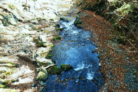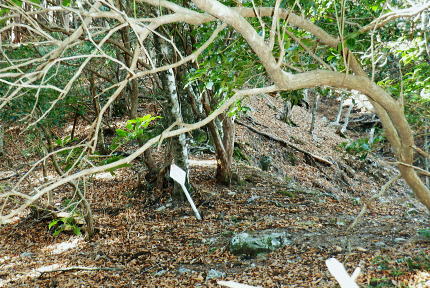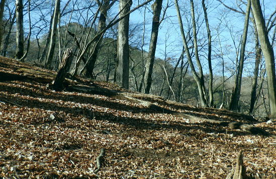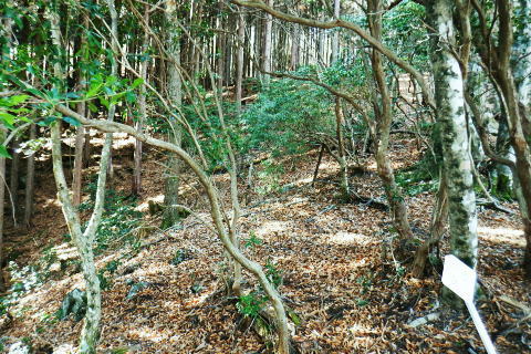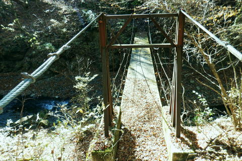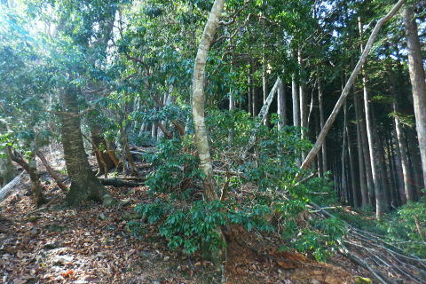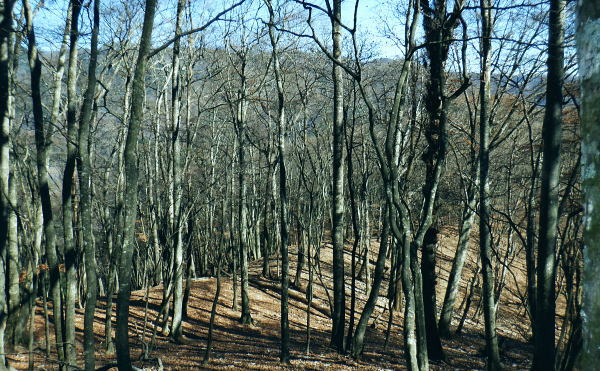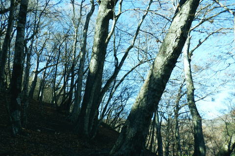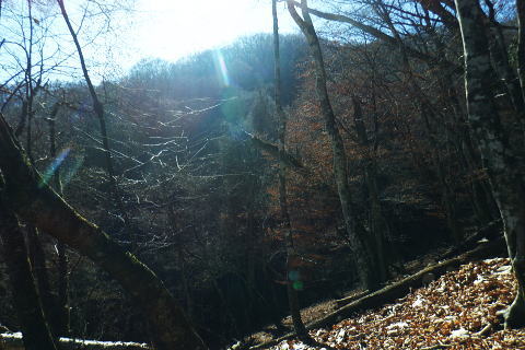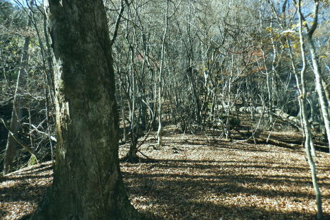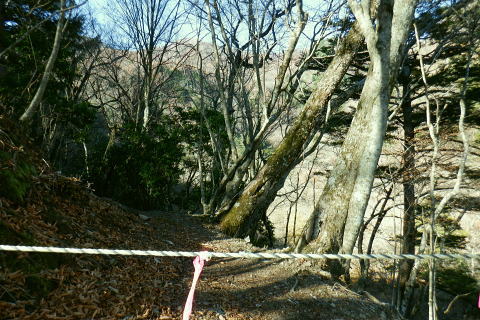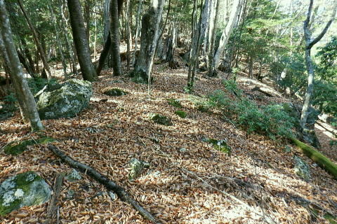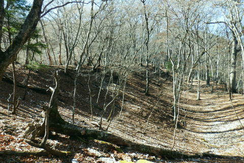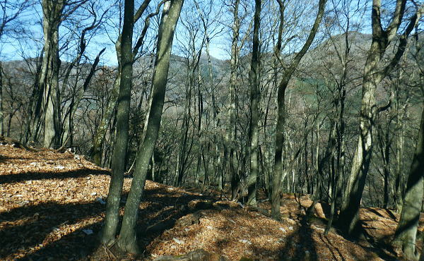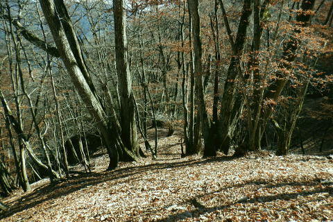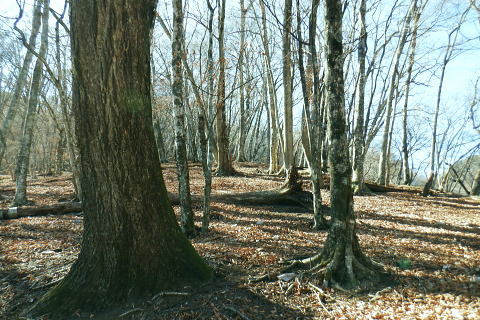 | 林道から小川谷の吊橋を渡り.材木小屋尾根末端から下段・上段歩道と綴り.巨木の台地へ. 幾つもの支尾根を合わせ.冬木林に被われたタワ尾根の篶坂ノ丸を仰ぎ目指した。 東日原から鍾乳洞を経て小川谷林道の吊り橋へ 篶坂ノ丸材木小屋尾根から篶坂ノ丸を望む・・下段と上段歩道 篶坂ノ丸から金袋山.人形山からタワ尾根を南東進 一石山から旧道伝いに一石山神社 林道を分け小川谷の吊橋へ 「カモシカ保護地域」の看板が立つ分岐より.9:57石積がある確りした作業道を上流側に緩やかに下りている 小川谷の吊橋 左岸を下り小川谷の吊橋を渡る.10:00 思うより立派でガッチリしていた小川谷 吊橋真下の上流側吊橋の真下の本流の流れ.右岸からは犬麦谷が注ぎ込む 下流側.右岸の山腹には下段歩道が綴られている材木小屋尾根の末端 ここは自粛規制の作業道.10:07材木小屋尾根の尾根筋には作業道が綴られていた。 短い距離だがら末端は劇斜面. 足元に吊橋を見下ろし.左からは巻道だろう。山道が登ってきた。点々と目立つ赤テープを見下ろされた。 先に見える道標は下段経路と交差.10:15下段歩道 900m圏.読めぬ道標と登ってきた斜面.10:19 ロープの先は上流側歩道は唐松沢・鳥居谷から三又方面に至る。 下流.材木小屋窪から鍾乳洞方面へここで中年の単独行と出会う。もう何年もこの山域を登っている彼. 鳥居谷に入り.沢沿いの尾根からタワ尾根にでると云っていたが 後半のタワ尾根で再び出会っている。彼は木材尾根に変更して私と同じルートを綴っていた。 手にはストックを持ち.右腰には巧いぐわいにアイスバレル添えていた。私も過って西丹沢の西に入った頃に.まず小さな園芸用のバイルから始まり アイスバイル持参した覚えがある。藪絡みには至極不便で.今は簡易アイゼンを持参している。間々使い易い。 上段歩道からの尾根は急登 紅葉は既に落ち.アセビだけが緑葉を残している.10:39 1000m圏.科を変えての巨樹は多い.10:41一度勾配が緩み.左からの尾根と合わさり右にカーブする。尾根幅が広がり明るさが増してきた。 尾根筋は自然林が続く.10:50巨樹と云ってもよいほどの立派な大木が数多く散乱し.見どころ満載の尾根に乗る。 前方に尾根筋を塞ぐ岩場が現れる・・直登は不可.10:54 1050m圏.左手の切れ目から登り切る.10:57左に巻道があり.直ぐ右に回り込む踏み跡を見付け詰めている 1100m圏.岩上の蒼空.11:09大地は明るさが増すが樹林から仰ぐ天空の蒼さに勝る明るさはない。 長沢脊稜 背の境界尾根を振り返す.11:13足元はブナの森,重なり合う立木から頭上を仰げは樹冠が並び.長沢脊稜が連呼の如く望まれた。 それがここでは当たり前の風景にしか思えぬ贅沢さ。額に納まりきれぬ山並みが溢れるばかりの風景を見せつけている。空は更に深い。 狭くなった尾根筋 丸味を持つ尾根の裏に隠れるよう1178m点がある.11:191050m圏で傾斜は緩み左から枝尾根を合わせてほぼ南西に綴ってきた尾根筋は.西側へと右に回り込む。 そして小さいながら尾根は丸味を持ち.不思議な二重山稜的な地形を創りだしていた。 1178m点小コブ 狭い痩せ尾根の頂.11:26コブには朽ちる木杭があると云うも見当たらなかった。又頂から眺められるという長沢脊稜やタワ尾根にウトウの頭は冬季の展望で. まだまだ茂みの蜜る中だった。アセビの多い小さな頂で先は痩せた岩尾根が連なる。 地形. 小ピークの裏側(北)は壁のような劇傾斜で谷間に山腹を落としている。 反面手前左の窪溝は浅いが抉られ.痩せ尾根と並行するよう延びている。短いが二重山稜を描いていた。 1178m点の足元から左下の窪みに回り込み.先の鞍部のような所から再び左の本尾根に乗っている。 窪んだ大地・・右肩が1178m点小コブ.11:29左下の窪んだ溝から左前方の本尾根に乗る。そしてアセビの茂みを潜ると上段径路にでた。 上段径路1200m圏 11:32その先でアセビ絡みの茂みを潜ると先ず.林班界標「24/25」が目に入り.上段歩道を横切る。 小川谷右岸の山腹には上段と下段に経路が築かれ.作業道として不安定の所も多い。特に下段は経験者向き。 上段径路は登山明細図(西編)には黒破線で記されている。過ってここから材木小屋尾根を詰めた折. 見たことのある「底の抜けた鍋」は今だ失われていず.石標に伏せるよう置かれていた。 2016年7月にここから材木小屋尾根を詰め.篶坂ノ丸オロセー尾根へと横断している。 その時もこの割れた鍋が転がっていたのを見ている。初めて見る方にはこんなものと思うだろうが再び見れば懐かしさが募る。 上流の三又方面の木杭から振り返る・・左下から登ってきた。以前は林道口から上段歩道を綴り.材木小屋尾根を乗っ越す分岐から篶坂ノ丸へ詰めていた。 当時は「ツルハシ」も転がっていた覚えがあったが? 今日は吊橋を目的に尾根末端から登り詰めている。 上部と異なり急登の連続で上段に競り上がっていた。以前.街道の終点では何年もの長い改修工事が行われ通れず. 「人形山のミズナラ」を経て下段歩道に入り.篶坂尾根を登ったのはその後だった