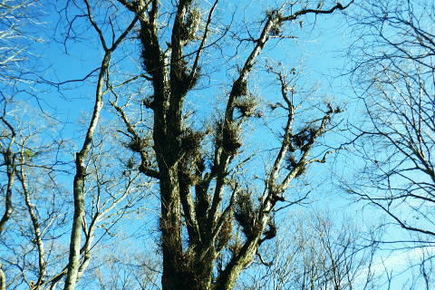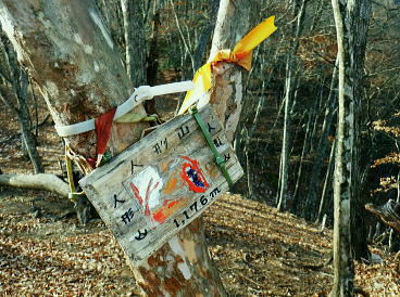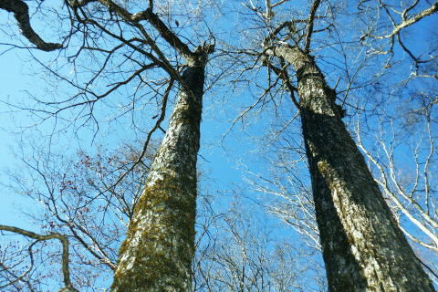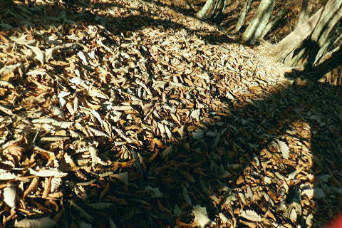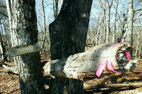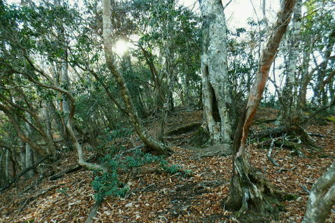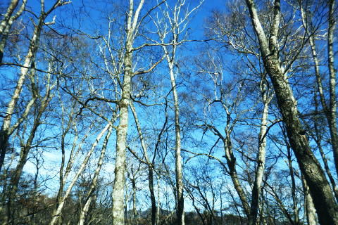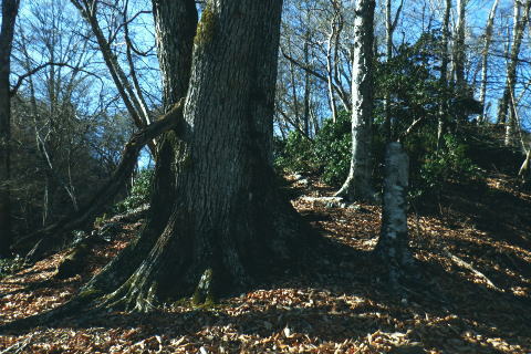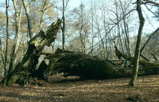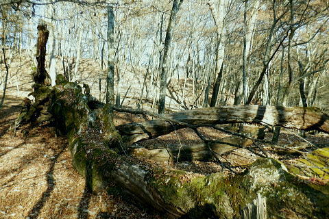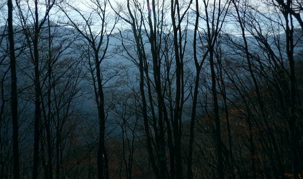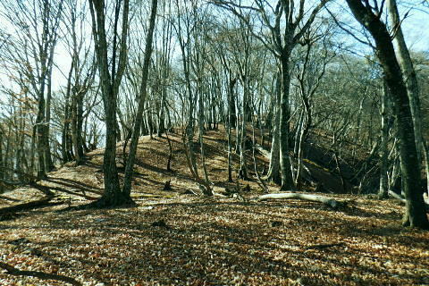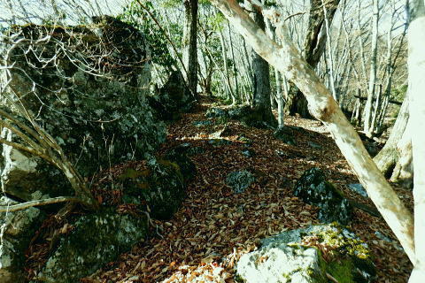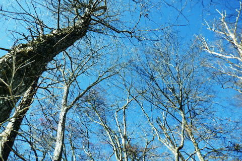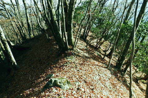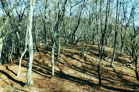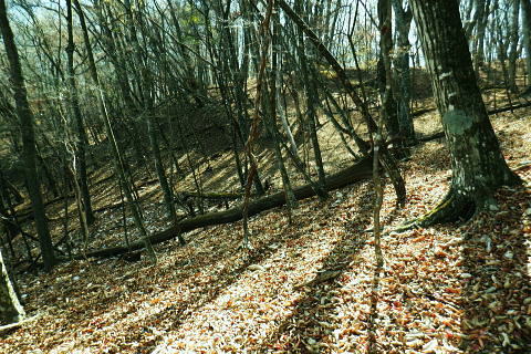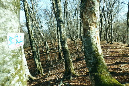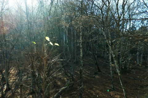 | 材木小屋尾根の下段.上段歩道を横切り.雄大に広がる穏やかな起伏の尾根を綴り.裸林に被われたタワ尾根の篶坂ノ丸に立つ。 東日原から鍾乳洞を経て小川谷林道の吊り橋 篶坂ノ丸材木小屋尾根から篶坂ノ丸を望む 篶坂ノ丸からタワ尾根を南東進・・金袋山.人形山.一石山・・金袋山のミズナラ 一石山から旧道にでて一石山神社 篶坂ノ丸材木尾根の上部曲り角 1330m圏.12:08尾根筋が南西から大きく南南南西に回り込む浅い窪地角 尾根の枯葉群材木小屋尾根は末端からタワ尾根の天辺に至るまで枯葉の深いクッションで覆われていた。勾配は思いの外高まると 風道までもが枯葉で積もり.尾根上の痩せ尾根の少なさを痛感させられている。以前は訪れた時は.新緑に飾られた世界だった。 12:094枚の枝葉 1350m圏.最後の左に回り込む辺り.12:12ほぼ枯葉はちぎれ落ち,その残された細かな枯葉の残骸だけが枝に残されていた。その中.4枚の大き目な枯葉だけが 原型の間々残されていた。それが日差しに照らされ.輝き眺められていた。何を伝えているのだろうか? 登るにつれ頂稜が真近に迫る.12:21空だけでなく周りは明るい台地. 尾根筋は南側に傾き.傾斜の増した最後の1000mを一気に詰める。 後一歩でタワ尾根に乗る 12:23ウトウの頭1587m 右手にウトウの頭が大きく描かれ.タワ尾根にでる.12:24 1400m圏.登り終えた材木小屋尾根を振り返る.2:25篶坂ノ丸 二又の幹に倒木が重なる山頂の立木.12:26タワ尾根の細長く広い1456m台地に東端 緩やかで大らかで平坦な台地は裸林に被われ.その連鎖の見応えのあるタワ尾根にでる。穏やかに起伏する台地に急に出て. 1450m圏の細長い頂の西側の台地から東手へ.1本の頂の立木を見付けながら歩む。それが以外と難しかった。 増して同じような立木の裸林が乱立し並ぶ小広い平頂. 幹の二又に倒木が挟まる目立つ立木を見付ければよいが,言葉ほど簡単ではない。 又手製の山名標は尾根の末端側の裏側に付けられていた。まずはそれを目印に反対側に回り込み山名標と見合わせている。 このイメージで登り詰めた篶坂ノ丸は2013年5月のタワ尾根を登って以来4度目の頂になる。 山頂付近は落葉広葉樹に覆われ.広大に開かれた起伏に枯葉を積もらせ.平頂の東端に見付けている。南側に延びるのがオロセ尾根. 山頂の一番高いテッペンと蒼空 山名標のある樹冠を見上げる先客が一人いた。彼女と少し離れた倒木を選び昼食を摂る。 妻のカツサンドと日清のカップヌードル小はテルモスから。ゼザートはオレンジ.今回は途中で飲まなかったマウントレニ-ア.コーヒーとチョコ。 間食は大福で.バナナは口にしなかった。飲物はOS-1.煙草も箱で持参した割に1本に抑え.天を仰ぎながら吸う贅沢さ。 昼食を摂り.不思議な繋がりの仲間達 ここで単独の女性と出会っている。オロセ尾根を登り,ウトウの頭をピストンすると云う。次回は上段径路に入りたい願望があるようだ。 単独は無理かも? 如何してもなら新緑から後の暖かい季節を勧めている。入れ違いに2人組の青年と出会い.一度すれ違って戻ってきた。 読図の仕方を教えているようだ。山行回数が減り.バテバテだった私には山の回数を増やせばまだ大丈夫とお墨付けを頂いたが 彼等は私が登ったルートを下り.今日は三又に天張るらしい。それを聞くだけでも贅沢な話。 笑い顔が素敵な2人だった。どんな理由を付けても独りで登れる姿は素敵だと褒美を頂き.調子に乗る私がいた。 不思議なことがある。今回彼女を除けば下山前に3組の男性軍が2度出会ったことになる。 そして擦違った全パーティが材木小屋尾根に関わったことになる。山に入るハイカーは少なかっただけでなく.思えば不思議な話の繋がりになる。 ましてもう少しのんびりしていれば彼女との再会しただろう。最悪の場合は東日原バス停で。ただ私はその後.ヒッチハイクに誘われている。 蒼空と裸林 タワ尾根筋は既に何処も裸林の世界.13:29足元は材木小屋尾根に入ってからは足元は常に落葉に靴が埋まる枯葉の世界が広がりを見せていた。 背に望めるのは長沢脊稜の三ッドッケ〜蕎麦粒山辺りだろう。ここでは尚更.尾根伝いに枯葉を蹴り,回りを眺めつつ下る。 石尾根 1430m圏.タワ尾根を横切るロープ.13:35タワ尾根の二又にでる。東から北東に回り込む支尾根に入り込まぬようロープで長く閉ざされていた。 ロープからは右前方に延びる南東を下り.緩やかになると尾根幅は広がり人形山1176mにでる。 又ロープから75m程手前には右手(南)のオロセ尾根と合わさり.孫惣谷林道の作業道入口から八丁橋にでる分岐がある。樹幹に矢印あり. ここは何度か行っているが緩やかな斜面が続き.南面に向かい下れば自然とオロセ尾根に乗っている。ただカメラを落としたことがある。 てんぐ巣病? 1330m圏.今だ続く珍しいてんぐ巣病の木? 13:43最初にタワ尾根を登って以来.珍しく何度も見上げているのが1325m点の手前の立木・・ヤドリギの巣のような大木. 初めて見たのが10年ほど前.見たイメージとしては今でも殆ど変わらぬ姿。この
