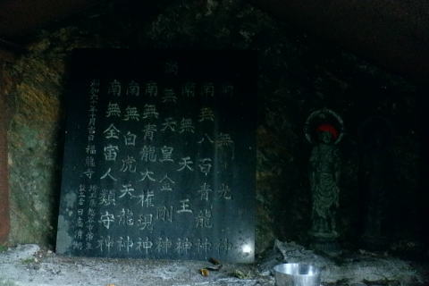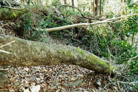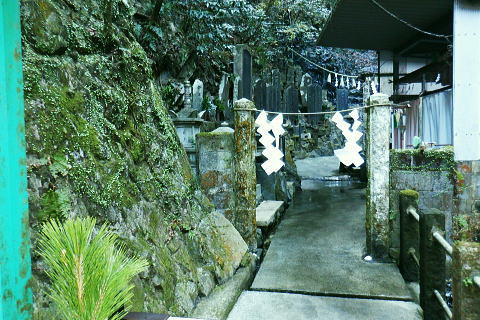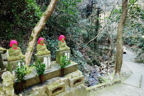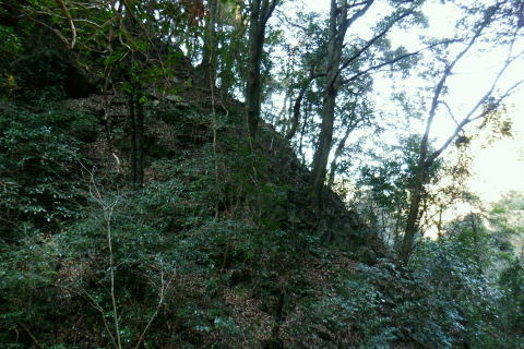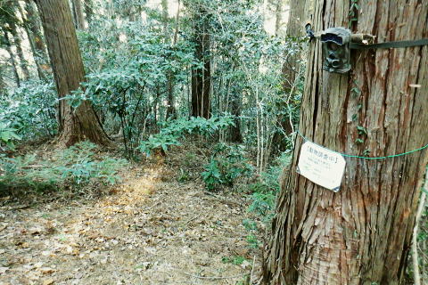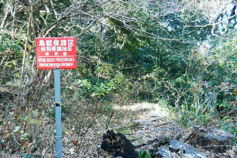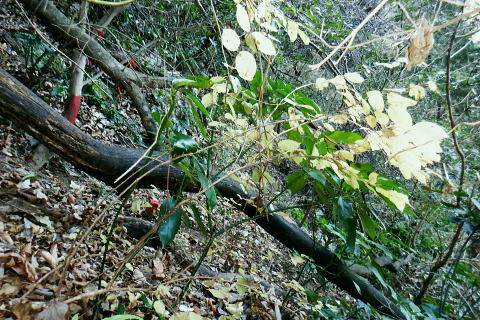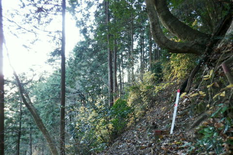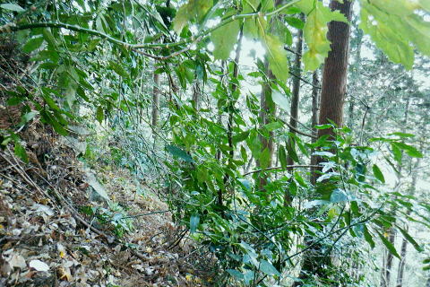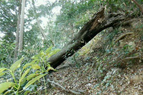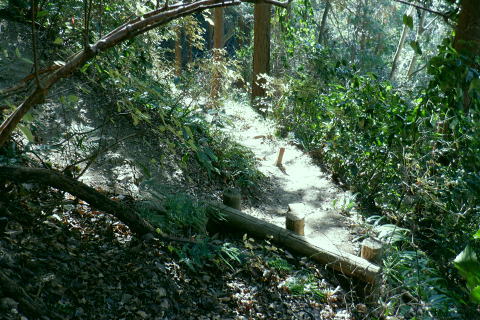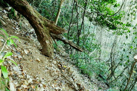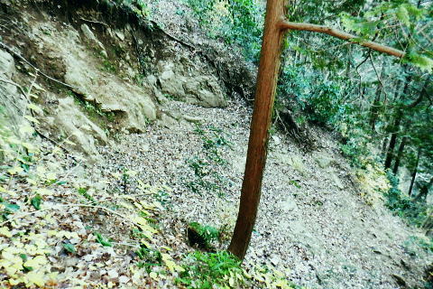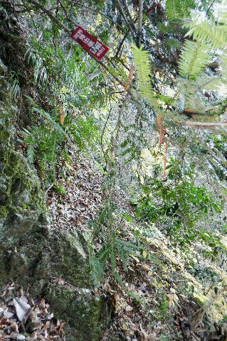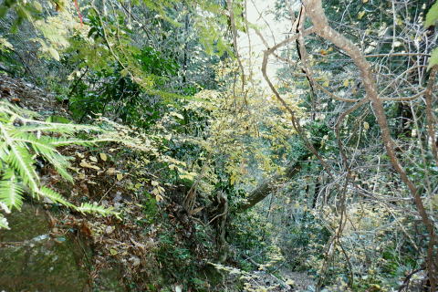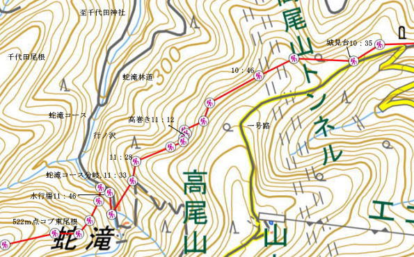 | 高尾山の北面. むかし道から林野庁の蛇道と結び.蛇滝から大見晴へ 一号路の城見台から離れ.北側中腹道から1ケ所切れた荒れた「蛇道」に入り.蛇滝コースから水行場参籠所を経て.行ノ沢へ 大見晴522m東尾根を登り返し高尾山を目指す。 高尾山むかし道脇から城見台・・高尾山ちか道と一輪の赤い椿 北側作業道.蛇道から水行場参籠所・・林野庁「蛇道」.1ケ所大崩れ 行ノ沢を渡渉し大見晴522mP東尾根から高尾山の頂を巻き逆沢作業道 日影林道.小仏川左岸の高速道の側道からjr高尾駅 高尾山北側中段の作業道(蛇道) 320m圏・・城見台側.右端の取付き.10:36左脇に丸太のベンチが数個と立派な一号路の「城見台」の地名柱があった。道幅広い一号路を分け.右手の蛇道のトラバースする巻道に入る。 蛇道経路の概念図 城見台〜蛇滝を経て行ノ沢ケーブル高尾山駅485m点コブの北側の蛇滝沢の源流をトラバースし,突き当たった蛇滝コースを下り大見晴脇の522mP東尾根の取付く。 その間の蛇道はコースが分からず適当に予想して行動したため.JPS機能と不具合の場所も起きている。 北側経路の蛇道へ.10:39この作業道は山上駅・高尾山駅のある台地状の尾根の北西側山腹を回り込んでいる。作業道の終点は蛇滝コースの途中と結ばれている。 国有林のため林野庁が管理し.点々と付けられている境界見出標には「蛇道.林野庁」と付け加えられていた。 細かい小沢を蛇行するトラバースを繰り返している。使用度が少ないせいか全体的に足場は斜めで悪い。高巻きは1ケ所あった。 400m圏.作業道に取付いて直ぐ固定カメラ.10:41「野生動物調査中」と張り紙があり 最初は長閑な風景.10:43 藪道に入り込む.10:45 400m圏の倒木.10:45 足元はやや斜めに抉れる.10:48 作業道の路肩は以外と脆い.10:53 10:59斜めに延びる枝に境界見出標が垂れ下げてある。ガリーの底を下り頭上を見上げると正面に段違いのステップが 丁度よく切り開かれていた。高巻きするか思いとホッとした所。 境界見出標によるとこの北側の作業道は「蛇道.林野庁」と記されていた。点々と密に付けられて.ルートとして迷う心配は少ない。 ただ荒れた足元は全体的に斜めで不安定. 藪絡みから見て通う人は少ないようだった。 又2ケ所に崩落激しいガリー状の所がある。1ケ所は高巻き.もう1つは真近で見れば足場が取れ.高巻きがなくホッとした。 370m圏・・11:00 沢底はガリー状だが正面は側壁の地形.11:05ポイントとなったガリーのツメ 向いに山道らしき所は切断され.口が見られるが横切れず。よいと思った下流側は劇勾配のジャリ斜面で上り返せず。 戻るのにも足場が取られ馬力がいた。安易に降りてしまったが足場が悪く.苦労させられている。結局楽な大回りで高巻いている。 足場は屑付き気味の斜めの足場で.気ばっかり強いられていた。 390m圏の高巻き中.11:16 380m圏で作業道に戻る.11:25 大らかな枝尾根を巻き経路にでる.11:29西に延びる大らかな尾根の先端にでて大きく南側に回り込むと更に穏やかに傾斜は緩み.生い茂る下草類も安定感を増してきた。 疎らになりだした茂みを進むと突然にして丸太の杭壁が眼前に姿を突然現した。ここは昨日の調べて知ったポイントだった。 蛇滝コースに乗る。確りした登山道の突き出しに出くわした。今ばかりは何とも心地よい山道コースに変わっている。 蛇滝コースと合流 400m圏の確りした山腹道.11:31薄い踏み跡から木柵を越え確りした登山道にでる. 上流はケイブルカー展望台近くの一号路にでる。又浄心門から女坂を選べば行ノ沢の右岸沿いに辿り.みやま吊橋を渡る4号路からは高尾山に立つ。 横切った上流側にある木祠.11:35蛇滝コースを右に折れ.ほぼ真南に進むと左手から枝沢が降りてきた。地形図には確り青線で記されをり.横切る所には立木を 土台とした木祠が祀られていた。小沢の上流側はガリー状に抉り切られた薄暗い斜面になっている。 木祠内に奉られた石碑の神様たち 下流側には枝沢を横切り水行場の水行場参籠所へ.11:36横切った枝沢の下流側は二俣になり.直ぐ本流の右俣の水行場にでている。そして更に下った二俣には参籠所が建てられていた。 水行場参籠所.蛇滝 登山道の左側には本流右俣の蛇滝.11:38蛇滝の本体は見ることはできない。 大見晴522mの東尾根末端 行ノ沢野沢底に降りる途中から登り返えす藪尾根を見上げる。水行場から行ノ沢対岸に聳える大見晴脇の722mP東尾根が見上げられた。この藪絡む劇斜面を河原に降り.末端から登る返す。 肩から傾斜は緩み.大らから台地の頂にでれば北北東の尾根を合わせ.吊橋コースの4号路と合流した。 河原に降りてのお地蔵さん.11:40行ノ沢を渡渉し.東尾根の末端から東尾根を詰め722mPへ。 蛇滝コースとは別の蛇滝口に出る簡易舗装道.11:41東尾根対岸の取付きから二俣に建つ参籠所を見上げている。このコースは下流で蛇滝林道を分けている蛇滝コースの登山口にでる。 更に滝沢の右岸道を下れば千代田神社の正門前を通り..湯の花梅園を抜けると旧甲州街道にでる。 昨年3月に高尾山を