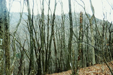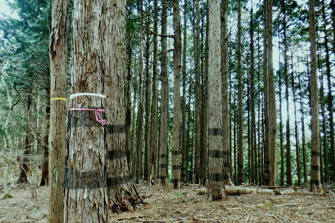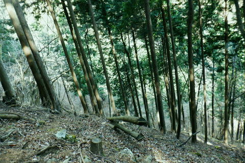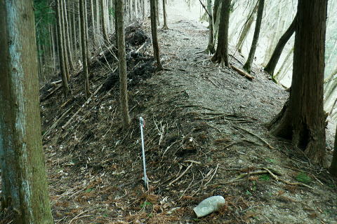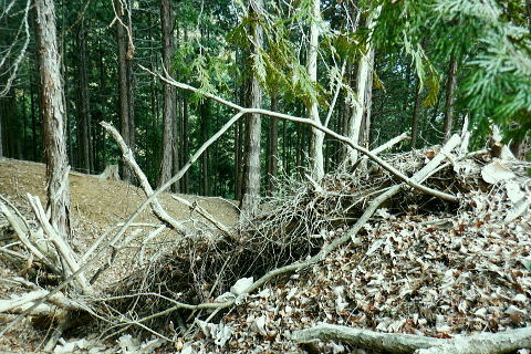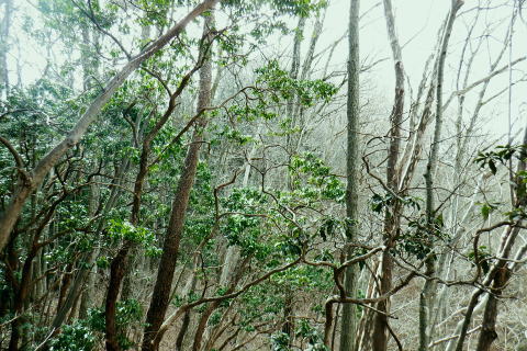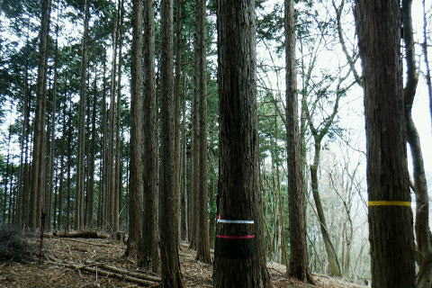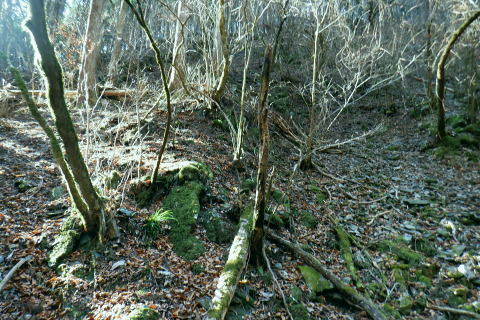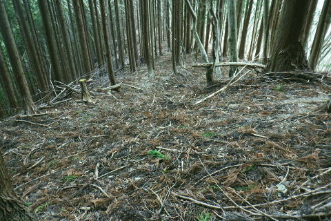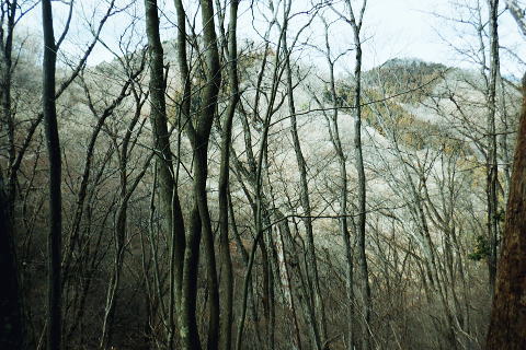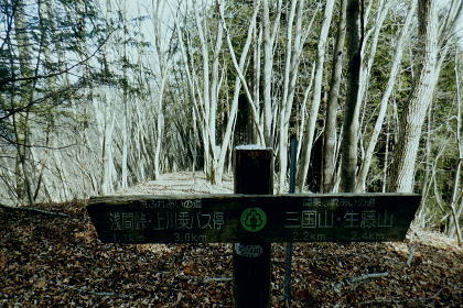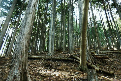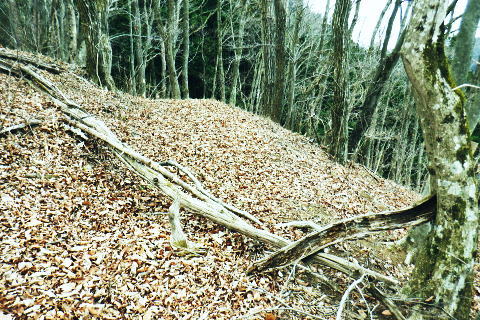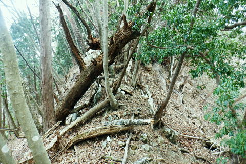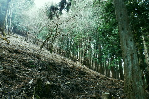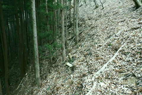 | 矢沢から熊倉沢に入り.大ツイジを南北に横断し.芦沢山から下伏にでて黒田川へ 熊倉沢右俣二俣から広河原沢源頭へ千ケ尾沢右岸尾根. 815m点東北東尾根から大ツイジにでて.栗坂峠を下り下伏集落へ 南郷から熊倉沢林道と右俣右沢 千ケ尾沢右岸尾根.815m点北東支尾根を詰め栗坂峠から下伏 下伏から棡原藤野線.間道.旧道から新井 広河原沢源頭の千ケ尾沢右岸尾根 815m点北東支尾根の末端.9:22諦め戻るか考えた末.過って歩んだことのある上流側の千ケ尾沢右岸尾根を再び詰め.大ツイジの広河原沢源頭に立つことにした。 前回は右俣右沢の陸軍ノ滝に寄ってから右俣右沢の出合に戻り.千ケ尾沢右岸の北東尾根の815m点を頂点とする北西支尾根から 笹尾根の860m圏小コブにでている。 熊倉沢右俣右沢のほぼ中間地点の右岸から北東支尾根に取り組み. 又右俣の末端からの支尾根は頂直下の850m圏の平坦な台地は北側で矢ケ沢左岸尾根と合わさってもいた。 千ケ尾沢右岸尾根 一息し落ち着くも下部は見えず.9:53まずは河原の500m圏から千ケ尾沢右岸の北東尾根の815m点へと東北東尾根を末端から詰める。 所謂.熊倉沢右俣の二俣から西南西に尾根を詰め.笹尾根の860m圏小コブにでている。 安とした斜面にでて.9:54登り始めの30分が勝負. 劇勾配にやや柔らかい土壌の壁.足場が取れずにずり落ちる。 小枝でも立木の根元を探ることが出来れば申し分ないが疎ら過ぎる間隔に足を踏み込めば崩れる斜面。 狭い範囲だが硬ければ石面で踏み込めなかった。ストックでバランスを取るにも足場は不安定。 このような場合はアイゼンを使用するに限る。緩ければステップを切り.硬ければフラットに置いて出来るだけ大股で移動した。 細かい動作は却って道中の動きを長くするばかり.手間ばかり掛かることになる。何時も持参しているがアイゼンを用いるのは何年ぶりになるのだろうか? 傾斜は緩むも踏み跡はなく馬力がいる.9:54 560m圏・・ふあふあの斜面.9:59倒木帯を見付けては近づき.伐採地を見付けては境を抜けるよう気を付ける。枝木の下枝藪の激しい所にでる。 もし踏み跡を見付けても.覆い被さる枝木で.焦らず直進するに限る。停まったらお仕舞とゆっくりでも進む。 一度傾斜が緩み安全圏にでる.10:05まずは踏み跡を見付けねばと周りを時折探るも.それ以上に山腹は広く統一的に続く斜面が続いている。 更なる急登は814m点までの中半で.薄い踏み跡を見付けてもいる。あった知るだけで先に安心感をもたらしていた。 植林と疎らな途切れ.10:24向いはトヤド浅間か? 朧で不明.10:36814m点 尾根二又が近づく.10:36 二又にでて一時の痩せ尾根.10:39 振り返る熊倉沢を隔てるトヤド浅間.10:43820m圏の平坦地 大らかな細長い平坦な台地.10:44栗坂丸北東尾根? 西隣りの尾根を振り返る.10:50街道から歩き始めた時はあんなに碧かった空は谷間の樹林覆う林道を抜け.谷底に降りても.狭い空間から天空の碧さが仰がれていた。 それが尾根に取り付くと陽射しは閉ざされ全く見られなくなった。そして頂稜直下からの展望は霞み.薄日に変わっている。 又この地点は尾根沿いではなく.過っては左(東)側から熊倉沢右俣左沢. 奥の西沢に通じる作業道が綴られていた。今は廃道だろう。 大ツイジ860m圏小コブ 笹尾根のJPS点.10:58815m点コブへと前回は北支尾根.今回は北東支尾根から枝尾根を詰めてきた。私の好む850m圏の秘密の台地から860m圏の小コブに立つ。 前回と同じくポールが1本立ち.石杭のある道標裏から笹尾根にでている。 登ってきた千ケ尾沢右岸尾根を振り返る.10:50以前はなかった都有林の看板と最後のツメ10mは藪漕ぎしたと勘違いした.緩やかな登り。 山での出会い 笹尾根にでて偶然.朝方路線バスでお会いした単独の彼女と出会う。彼女から「バスでお会いしましたね!」の言葉から少し話し込む。 中学生の時.棒ノ嶺に登り始めてから黙々と登っていると。又小学生では集団登山で伊豆ケ岳に登ったとも。 私が中学の時.自分で企画し.初めて登ったのが伊豆ケ岳だった。チロリアンハットに登山バッチを買い求め.同級生と登っている。 そして翌月には妻坂峠から見た武甲山へ挑んでいる。。今年は春先にもう一度訪れてみたいと考えていた。 彼女からコースが沢山あるから選べ.大丈夫とお墨付けを頂いた。元気のよい彼女.私も見習い頑張られば。 笹尾根大ツイジ 右(西)に折れ大ツイジを西方へ進む.10:55大ツイジに乗る「栗坂ノ丸」と背陵の反対側.南に延びる栗坂ノ尾根 10:57.最初はここ栗坂ノ丸879m点から尾根を直下する積もりでいたものの.前半の計画が中途半端になってしまったため. 「栗坂峠」850m圏まで先を進み..旧峠路から改めて下伏の集落へと旧道を下ることにした。 遥か遠く三頭山と土俵山南尾根 栗坂峠から笹尾根.西側の山並.11:13栗坂峠 登山地図では「休憩所のある浅間峠」と「881m点と879m点の間の栗坂」を区別して表示している。一方.「甲斐國志」.「新編武蔵風土記稿」などに 明記されているように.元々は小祠のある峠は浅間峠でなく.栗坂峠であったよう