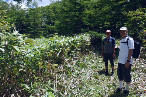 | 草津温泉の酒宴と芳ノ平散策・・上信越高原.国境南部Top 2023年07月15〜17日 m.見城.竹永.松村・・日帰り往復を含む. 竹永先輩は広島から参加.東京から共に往復している。が? 7月15日.jr上野12:00」jr上野.竹永集合.12:14=11:35高崎14:37=14:46新前橋:49=14:58八木原=スパックス草津 7月16日.湿原自然歩道登山口から何時もの同じ芳ケ平コースをピストン・・硫黄畑→金比羅神社参道の裏→スパックス草津 7月17日.jr八木原¥330. 11:14=11:35高崎.「はくたか558号」=12:30上野=御徒町.高崎より乗車券は普通¥2310.新幹線¥2300 芳ノ平へ 芳ケ平湿原自然歩道.10:14 右並びは草津温泉ゴルフ場.10:24右手が谷沢原 蟻の塔渡り・・右手は入道沢・常布ノ滝への廃道.分岐.10:51 10:51黄色いトンボ 今年の芳ノ平では春蝉が賑やかだったと云うも今は0。変わって避暑に訪れた黄色いトンボが尾根筋を途切れることなく舞っていた。 蟻の塔渡り辺りから延々と芳ノ平ヒュッテまで.驚くことに1時間半以上の長い間.トンボは群団を作り.凄い密度で私達の歩く先々をも. 私達の体に絡みつくよう舞う。それほどの大群に出会っていた。何故? 層が厚いのだろうか。 赤トンボは和名では「○○アカネ」と呼ばれる赤トンボ25種類。アキアカネは1年に1回発生して卵で冬を越し.平地の水田や湖沼で羽化し. 育った幼虫(ヤゴ)は梅雨期に成虫になると高原地帯に移動して夏を過ごす。秋になると山から再び平地に産卵のために戻ってくる。 この時期まではまだ性的には未熟でオレンジ色をしているが.成熟するに従い赤トンボに変身する。 又最近のトンボの減少は農薬で処理した苗の中にあるとか? 大きな群団としては2018年8月の北ア・乗鞍岳東面の雪田. 10年?の八ケ岳赤岳沢の河原と08年8月の飯豊山の頂に群がっるトンボには特に印象に残されている。 深く満る背丈の高い笹の遊歩道 . 草刈りしたばかりの遊歩道.11:20 弁天様.11:21 毒沢川に架かる木橋11:24一本松・・利根川水系吾妻川白砂川の支流.湯川大沢川の支流.毒沢川。 毒沢川は硫黄分多い・・大滝―左岸道―常布ノ滝―香草温泉(野湯)―谷沢川第二砂防ダム 横笹の分岐 1625m・・右下は大平湿原へ.11:41一昨年は芳ケ平から大沢川左岸道を下り.大平湿原からこの分岐に戻る積りでいた。ただ幕営地の周遊道と間違い.再び芳ケ平に戻っていた。 今回は見城さんが下見をし.下山時に選ぶ積りでいた。それが当時は藪絡み多く止めた方が良いとのこと。ただ今回は道標も分かり易くなり. 花敷方面の分岐口からは尾根筋と同様に草が刈払われていた。2度尋ねるも.諦め.今回も同じコースを下っている。 右景.12:05 左景 アップ・・広い高原の長笹川・大沢川流域 全景.12:27白根山北東肩の2138m点峰 草津白根山からの山道を合わせ茅ケ平ヒュッテへ.2:45湿原の池塘と夏雲 芳ケ平ヒュッテ先の芳ケ平の湿原1832m.12:57芳ケ平湿原は中之条町と草津町に広がる湿原で.2015年(平成15年」にラクサール条約.湿原登録簿に登録される。 芳ケ平キャンプ場(野営場)で竹永・見城両先輩.13:16昼食・・即席ラーメンに生卵のみを落す 幕営場脇にかたまるニッコウキスゲ 再び遊歩道を下る.13:36下る前方は草津温泉。登りにはそれほど気にならなかったアザミの葉が.下りでは葉の切れ込みがズホンの上からでも刺さり.チクチクさせていた。 下りは同じ自然歩道だがアザミの茂み痛かった.14:27帰路は谷沢原沿いの左側の町営草津温泉ゴルフ場に一度回り込んでいる。ゴルフボール. 戻ってきた芳ケ平湿原自然歩道登山口.15:46左側の谷沢川を隔てた天狗山スキー場には国道292号線が通り草津温泉へ。 右に折れれば長笹林道から上信越自然歩道へ。先は荒廃した赤点線から花敷温泉に至る。国道405号線から野反湖.地蔵峠にでられる。 下山後は「とん香」で反省会・湯畑―西の河原通り―しゃくねげ通り―金毘羅神社.(一人登りの参道には先週と同じハルジオンが咲く)―スパック草津. 芳ノ平ピストン概念図 右端でP地方道の黄色道は茅ノ平の取付きで.先は長笹林道に繋がる。赤線の国道は天狗山スキー場から志賀高原に抜ける。 7月17日.jr御徒町6:34=上野6:40=8:31高崎.吾妻線4両.大前行.:53=新前橋:53=9:14八木原 八木原.上越線4両.9:42=10:01高崎.「あさま612号」.10:20=11:05上野=11:18御徒町・携帯を紛失し回収に出向く。 7月21日.今年初めてミンミン蝉の鳴き声を聴く・・東大〜合同庁舎間。28日は小島町公園. 7月22日.東北北部.南部と関東甲信地方は梅雨明け。梅雨前線の南下に伴い太平洋高気圧とチベット高気圧がダブルになり.連日35℃を超す猛暑日。 |