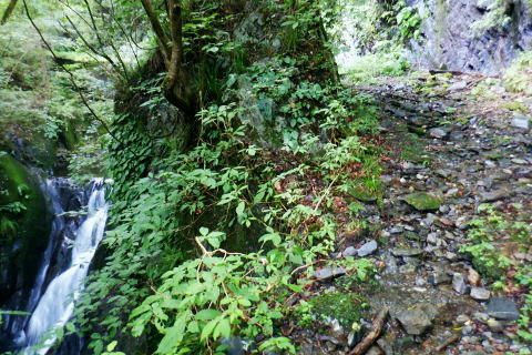 | 春先に続き2ケ月振りの山行.再び南郷から熊倉林道へ・・笹尾根大ツイジ周辺Top 連日の猛暑日を逃れ.体を動かす為にも.微妙な気温の変化を汲み取り.手近な奥多摩に入る。 熊倉山北尾根から大ツイジにでて.三国峠.生藤山から鶏冠尾根へと背稜は前回と逆の東側のコースを選ぶ。 醍醐丸から笹尾根を進み高岩山から中谷山尾根へ。メシモリ岩山南西尾根から案下の陣馬高原下bs。 2023年08月12日.松村 南郷から熊倉沢林道に入り熊倉沢左俣の奥二俣・・左俣右沢に入渓 西俣の大ツイジ熊倉山北尾根を詰め笹尾根から三国山へ 生藤山からは鶏冠尾根の醍醐丸.高岩山から中谷山尾根に変えている メシモリ岩山南東尾根から陣馬街道を下り上案下 還暦を迎え再び山登りに目覚めた頃は.殆ど足を踏み込んだことがなく.初めてとも云える奥多摩の日帰り山行を続けていた。 当時2008年2月の日記には.「昨年の4月に奥多摩御前山を目指し.山と高原2008「高尾・陣馬」を購入している。 その折.この地図の斜め下に延々と綴られている笹尾根に目が奪われていた。 そして11月には高水三山の下見山行に同行した折.田中先輩から高尾山から陣馬山までの歩きが.心地よかったと勧められている。 この高尾山コースから笹尾根に入り.周りの地形を覚えながら.本格的な日帰り登山を試みるようなる。 先輩とは立教学院清掃ボランテァ登山に誘われてから2度目の山行で.再び山登りを始める切っ掛けにもなっていた。その一歩が三頭山笹尾根. 日帰りで繋ぐ縦走。高尾山稲荷山尾根から雪残る陣馬山を越え.鶏冠尾根から生籐山.三国峠を経て井戸の集落に下りている。 ふと.その時のことを踏まえ.今回は熊倉山北尾根からの逆縦走を考え付く。猛暑に対応しながら.最後はゆっくりメシモリ岩山南西尾根を下り. 陣馬街道の上案下に下りることにした。暑さだけでなく何か想いだすことがあればと。 南秋川.南郷の集落 南郷の信号と檜原街道.左端にバス停「南郷」待合室あり.7:538月12日(土).曇後晴.東京36℃ jr御徒町5:11=5:17東京.快速:29=6:16立川:27=6:58武蔵五日市7:10=7:47南郷bs.377m 日の出4:57.日入18:40. 駅前から2番目の数馬行乗合バスはお盆を直前にして以外と混んでいた。殆どが10月に開催される「第31回イセツネCUP」の 参加メンバーで30名近い。今日は講習会らしく担当者の配慮で一般者は座席を優先的に取れるよう配慮されていた。 本番の参加者は2000人とのこと。春先には伊豆ケ岳.武川岳に登った折.長谷川カップの15期生の9名のメンバーと出会っている。 講習を終えたグループの集いとか。彼等が再び進行を引き連れているのだろうか? 旧南郷小学校跡.8:03看板には10月1日から禁漁厳守のチラシと右が「檜原 教育の森」の道標. 南秋川矢沢橋・・三度目の入山.8:05渓谷に入り.漸くミンミン蝉が鳴き出している。それにしても鳴き声が少ない。オスが少ないと云ことでもあるまい。 10cm強のトカゲが足元の道路中央を通り抜け.大きなオニヤンマが1匹.林道を走り回っていた。又アゲハらしく舞うチョウと夏の見本のような生物を見る。 矢沢 矢沢の左岸道よりリトル雄滝.8:06矢沢二俣 左俣の矢沢沿い矢沢林道のゲート.8:11 右俣の熊倉沢.熊倉沢林道に入る.8:14林道を分ける左俣(矢沢)の落合橋から矢沢林道.詰めれば笹尾根の茅丸にでられる。二俣の正面の中間尾根は軍刀利山長尾尾根の末端。 7年前に熊倉林道終点からトヤド沢出合を経て広河原沢源頭千ケ尾沢右岸尾根を詰め.笹尾根軍刀利山長尾尾根を下降し南郷bsから周回していた。 出合からは西寄りに降りて.矢沢側を跨ぐよう渡渉している。今年3月には熊倉沢右俣左沢から千ケ尾沢左岸尾根・大ツイジ.栗坂ノ尾根と繋ぎ. 芦沢山を経て下伏.八幡神社に下りている。アプローチは間道.旧道を経て新井bsにでている。今回は北尾根からの逆コースを取る。 熊倉山北尾根と坊主山 熊倉林道に入り直ぐ・・2016年08.26/8:09に撮影熊倉沢西沢と東沢を隔てる中間尾根. 回顧・・当時は陸軍滝から千ケ尾沢右岸尾根の広河原源頭にある平尾根から笹尾根を綴り軍刀利山西峰の長尾尾根を下り落合橋に戻っている。 林道の起点から200mほど先. 覆い被さる樹林で林道から見上げる樹冠の隙間は狭く.仰ぐ天空も小さく閉ざされていた。 その前方に開かれた場所が1ケ所あった。見上げる岳は地形から見て熊倉山北尾根だろう。今日笹尾根に登る第二候補として熊倉山. 第一はトヤド沢出合からの大河原沢右岸尾根を詰め平頂にでる。どちらにしてもトヤド沢の出合にある陸軍滝までは見聞を兼ね尋ねる積りでいた。 右俣の熊倉沢林道 2019年の19号台風により崩壊で切断された林道.8:17 林道の切り口は大きく崩壊されているこの右肩上の丘陵広場にまだ数ケ月しか経っていないのに新たにキャンプ禁止の立札が何枚も立てられていた。 何時も同じ所にある鞍は1つ.8:25 前回と同じ林道の側壁が崩落壊し.振り返る.8:29 足元を見下ろす.8:30 8:36熊倉沢二俣 林道終点広場まで行き..二俣に下る木橋まで戻る.8:52左上が熊倉沢左俣・右下が右俣. 熊倉沢 林