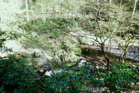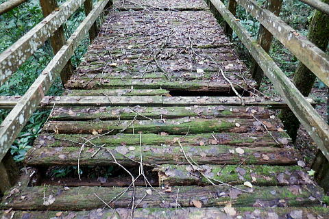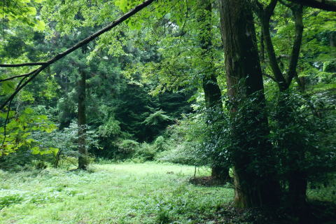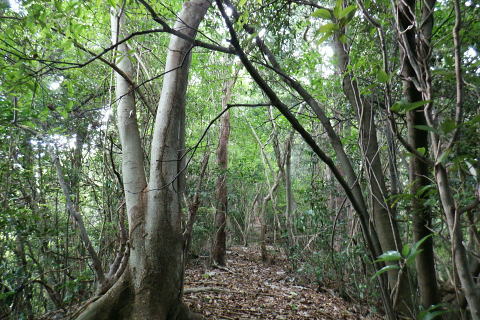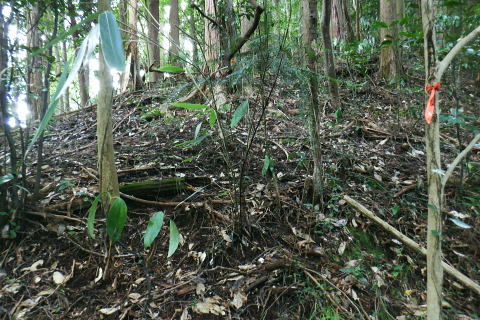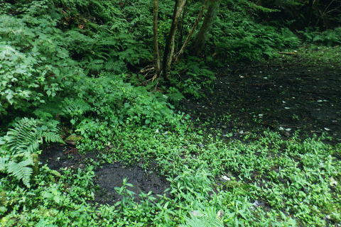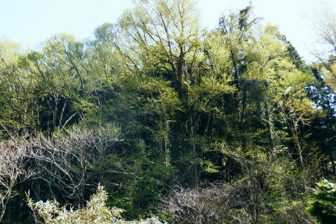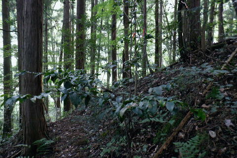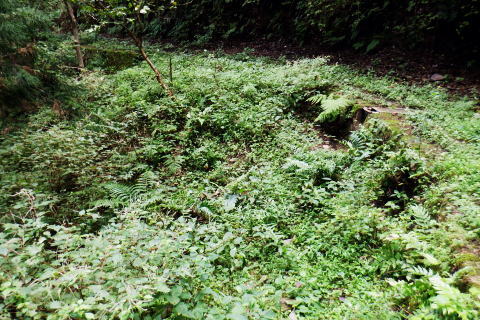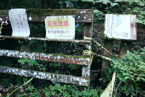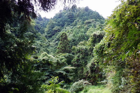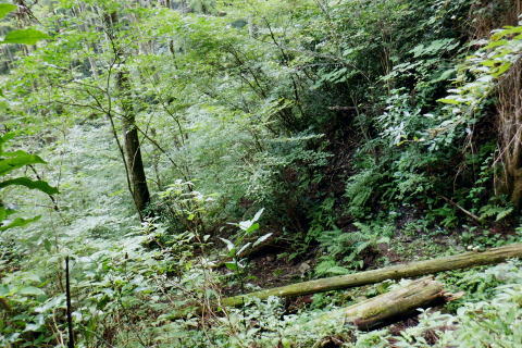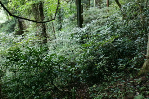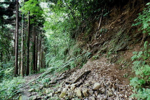 | 高尾山8. 続猛暑トレーイング.先ずは日影沢林道の「三本杉)を目指し.「きらぼしの森」へと短い距離 ・・陣馬高尾山山域Top 小仏川沿いの高尾山北面の3つの林道を日影林道の終点から高尾山522m北西尾根の末端を横切る日影沢林道と蛇滝林道を繋ぐ。 日影林道口の作業道に入り藪支尾根から直接.日影沢林道へと綴り.蛇滝林道終点林道の金毘羅台北尾根から小仏川へ下り「きらぼしの森」へ。 2023年08月12日.松村 林道終点の「カツラ林遊歩道」から直接.林道に立ち.終点崩壊地・・三本杉 旧登山道から千代田稲荷尾根.蛇滝林道の終点.崩壊地 作業道から金毘羅台尾根二又右枝尾根を下り.「きらぼしの森」 昨年4月には初めて高尾山を取り囲む林道を綴り.今回はその後半の高尾山北面の小仏川沿いにある3つの林道を綴る。 猛暑の炎天下を睨み午前中の短い小仏川南岸沿いの林道歩く。日影林道終点の「カツラ林遊歩道」を抜け.川畔の巻き道から 日影沢林道330m圏にある北枝尾根を詰め林道.3本杉にでている。 早くも今朝一番の目的地.直線の藪尾根を直接選んだため.間を開けず出てしまっている。小仏川の南岸沿を蛇行するダート林道の終点からは 旧登山道で繋ぎ.蛇滝林道の末端からは作業道を利用し.金毘羅台北尾根の下部の支尾根右又を選び下っていた。 東枝支尾根は予想に反し.東側は崖縁で.展望もよく.我ながら良い下りだったと思ふ。 連日猛暑が続き外出が間々ならくなった今日.運動不足には叶えられる距離とは云えぬが.御前中半日の清々しい山道を選んでみた。 裏高尾の「カツラ林遊歩道」 日影沢林道終点からの遊歩道・・2024.04.07/14:49 林道から小仏川を渡った左脇にあった旧遊歩道口.7:36春の新緑と清流.秋には鮮やかなカツラの黄葉に衣替えする.時間があればゆったりしたい場所。 旧甲州街道の日影林道の起点に立ち.改めて気が付く「林道名」と「遊歩道」. 林道標柱には「林道日影 今回のスタートは日影線の起点から直接.日影沢線の330m圏の北尾根に入り.3本杉へ。又背に架かる遊歩道は今まで全く気が付かなかった。 8月12日(土).晴 jr御徒町5:48=5:54神田.快速6:03=7:05高尾:12=7:23日影bs.229m. 新宿駅を過ぎると車窓から仰ぐ都心の空は紺碧の蒼空. 早朝から湧き上がる純白の積乱雲.既に巨大な入道雲に成長させ連なる姿は 遠望する雲積みの雲堰に線状降水帯を現わしていた。そして東空は黙々と乗り込まれ始めていた。 又台風10号は関東接近し.午後には雨をもたらし.明後日には関東から抜けると予報がでいた。 湧き上がる雲堤は1つの大きな前線として湾岸に一線を引き望まれた。抜ける蒼空は八王子まで.西側の山並は曇がち。 東京は真夏日が50日も続き.又9月に入っても衰えず.真夏日・熱帯夜はは9月3日で連続60日続くとあり.更に35℃の猛暑日が入る。 今回は猛暑日が途切れるのを良いことに.半日行動の散策にでる。 奥も幅広い遊歩道だが中央の節に乗らぬとボロボロ折れる。明治の森高尾山国定公園だが.今は探索するには危険の領域に入っている。 右岸道から日影沢林道330m圏の北尾根の末端取付きへ 日影駐車場240m10台. P真向い左脇の薄い踏み跡を辿る.7:46地形図を読むと小仏川右岸に日影林道で渡ると直ぐ黒線1本が描かれている。短い林道の支線と考えていたが現地で取付きが分らず。 まずは影沢のカツラ林遊歩道に入る。その後.付近では取付きが見当たらず。作業歩道かと考え探ると駐車場の脇に薄い踏み跡を見付けている。 小仏川の右岸沿いのトレース.7:53目的の北尾根の末端取付きへ 不思議な地形図の黒線ルート?.7:55 壊れた短い桟橋・・過っては確りした山道だったのだろう日影沢林道の330m圏の北尾根 直ぐ赤テープを中央と左手の立木に見る.8:01少し周りが開けると急に足場もよく.川沿いから離れ先方が尾根らしくなくなった。尾根に乗る。 旧街道の小仏川左岸から林道へ突き上げる尾根末端を見上げる 矢倉沢を下山して旧街道から・・2024.04.07/14:54本来.遠目から見た高尾山北面の522m峰北西尾根の末端. 日影バス停近く. 取付きから緩く直上する雑木林トラバースして来て踏み跡らしくなる。 地図と異なり大らかな絡みのない尾根筋.8:13. 巨樹を見始めると直ぐ林道にでる.8:17日影沢林道 アッけなく.崩壊したベンチが並ぶ.尾根と突き出した林道にでる。左に折れれば直ぐ3本杉広場にでる.8:19 先々月は今回と逆コースで.伊能忠敬の道として高尾天満宮からここを右へ抜け.千代田御荷尾根を直登。高尾山の裏側から萩原作業道へ。 小仏城山の東.西側経路を経て66号鉄塔尾根から底沢に降りている。御荷尾根で猛烈な藪漕ぎを強いられていた。 真向いの林道を横切れば左脇から詰め大見晴にでられる。正面の尾根を着実につめれば高尾山方面の522m点峰.北北西尾根に乗る。 三本杉広場 癒しの場にでて早くも1本.8:38 中央の立木が一番の太木とか 左奥のヌタ場北高尾山稜に乗る熊笹山 3本杉の林道からから北側に面する.8:27 林道330m圏の突き出し.8:34裏高尾へ北尾根が下りている。 前回は丸っきりの裸土と石積み道 325m