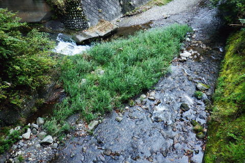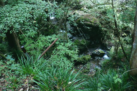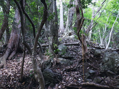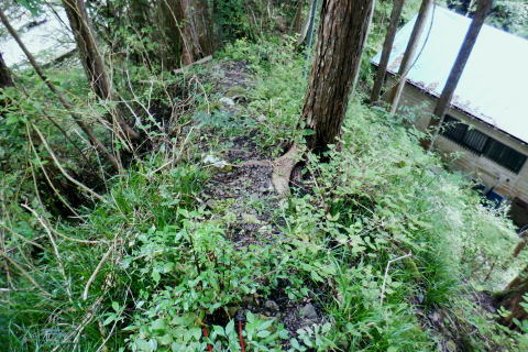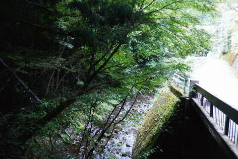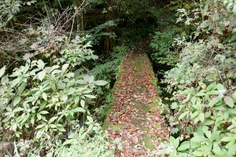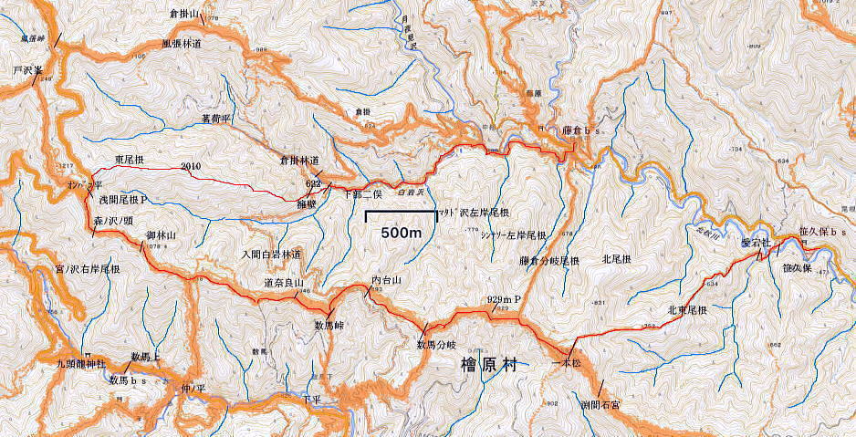 | オハヤシ沢左岸尾根から入間白岩林道の側壁を下り.再び林道を横切り.尾根末端の作業道を綴る。 地図の標高点622m下にある短い尾根だが手応えはある。 掛林道からの舗装道にでて.白岩沢沿いの集落を綴り.月夜見川出合を過ぎ.惣岳沢の出合.藤倉bsにでる。 笹久保bsから一本松北東尾根に取付く 浅間尾根上半と周遊道路.浅間尾根P オンバコ平白岩沢左岸尾根から白岩林道を横断 末端作業道から白岩沢沿いの倉掛〜藤原bs・・沢又の集落 白岩沢左岸の末端尾根を下る 入間白岩林道を横切り.更に末端の中間尾根へ.14:34林道の向いに林班界標板と黄色いポールが立つ。 最初は林道を左に折れ.林道の起点.倉掛林道と合わせてから白岩沢沿いに車道を綴り藤倉バス停にでる積りでいた。 それが擁壁から直接.尾根末端に下る作業道を見付けている。尾根末端へは躊躇せず下ることにした。 破線路があったらしいことはHP「山旅DIARY」氏から地図で伺えたが最後の車道は如何に降り付くかが分らなかった。 渡渉は渓谷深く無理. 降りてから運よく沢沿いに木橋が架かり.ホッとさせられている。 途切れ途切れの伐採地と造林作業道.14:36間伐された伐採地を抜け.尾根筋が左側に回り込むと右足元に小屋を見下ろす。 降りてきた600m圏から右下が営林署の宿舎.14:40 最後の中間尾根末端は痩せ尾根左上は右俣.ムジナヤ沢左岸の舗装道路。直ぐ下が二俣で.中間尾根の最後は両手を支えに這い下りる。 造林小屋 地図「猪丸」の白岩沢.標高622m点の横には林道が通っている。その直ぐ下の小さくなった尾根の終点が白岩沢二俣の出合になる。 白岩沢オハヤシ沢左岸尾根の林道擁壁からは林道を巻かず.そのまま末端に下りた。地図に見る出合手前の1つの赤印は営林署の家屋. 又右俣の沢沿いには小橋が架かり助かっている。無かったら渡渉は無理だっただろう。 左手下の白岩沢二俣付近の渓流地帯.4:45尾根末端を跨ぐ木橋 白岩沢右岸にあった木橋.14:47造林小屋の反対側.下ってきた小尾根から左に折れ.幾らか戻るよう作業道を下ると単純だが小さな木橋が架かり. 白岩沢の右俣.630m圏(標高点622m近く)の白岩沢左岸道にでる。倉掛林道終点からつらなる舗装道路で. 風張林道の分岐からの道路とも合わさり.白岩沢二俣からの左岸道に入る。白岩沢は浅間尾根と倉掛尾根との間に流れ.月夜見沢と合流する。 上流側には集落があること.尾根の源頭には風張峠P.奥多摩周遊道路が通っていることから奥深い感じはない。 その右岸の車道に出た向かいに地形図に記されていた1軒の民家があった。丁度外に出て来た地元の方.同士の会話に引き込まれていた。 バスの時刻もあり.短いが楽しい会話を楽しむ。何処から来たか? 朝方の堂々と車道を歩く野猿の話には驚かぬどころか.うようよ居ると。 右手から車道に出て下流側を望む。倉掛の集落.14:51車道に出た左手.背方を詰めれば.直ぐ倉掛の集落に入り.988m点を擁する尾根から倉掛山1078mに立つことができる。 ただ尾根伝いに林道が複雑に綴られ.道標類は0とのこと。探索力が必要とのこと。左岸の対面は900m圏の小コブかも? ミズナラ沢右岸尾根の末端.14:59末端の標高点779m点から北側に延びる2本の枝尾根の西側の尾根口にあった白岩沢に架かる歩行鉄橋。 左.倉掛尾根 白岩沢出合手前の道路に挟まれた集落.15:.01 藤倉への左岸道.15:03 藤倉地区.15:10愛宕橋の手前で対岸に石積みを制作中の石コロを運ぶつるべ籠と夫人部。 主婦2人がやや大き目な石塊をつるべ籠で何度も運びんでいる。対岸には男達が崩れた所の石積みを直しガンバる。等々と説明された。 左上は中組への登り坂.右下は向平.藤倉Bsへ.15:16右下に降りる途中が落合橋. 車道終点にでて道案内板のある標高499mは風張林道の起点で.直ぐ先で白岩沢の右岸に渡ると北秋川の上流の二俣.落合橋 (右俣は月夜見沢.左俣は白岩沢)を北側に見ている。その先の黒線分岐は下流側の中組地区への分岐。 499m点から左に入れば陣馬尾根(猿江分岐)コースへ。直進し地図の破線尾根を詰めれば陣馬尾根コースに乗る。 月夜見沢は北秋川の源流となる沢である。本流は月夜見山〜風張峠の辺りに突き上げている。 支流のヒイラギ沢は部分的に倒木が煩いが.小滝を楽しみながら小河内峠に達することができる。 白岩沢右岸道をさらに進むとマタド沢が右手から入り込み.右後方からは延命山寒澤寺の参道が下り合わさる。 本堂を左から墓地を抜けると770m圏で植林一色になり.850m圏の小コブを越えると右後方からマタド沢左岸尾根が合わさり. 標高点929mの峰に立つ。白岩沢沿いは愛宕橋で左岸に移り.北秋川の上流に架かる上徐手橋を横に見て藤倉バス停にでる。 藤倉bsからの南側.浅間尾根側の展望 藤倉バス停(標高481m点から北西に8m).15:20手前は惣岳沢に架かる徐毛橋. 右奥手が白岩川に架かる上徐毛橋. 下流は左手から惣角沢を合わせ北秋川になる。 この辺は沢又と呼ばれている。右手の上徐毛橋の南詰.その向かいの階段から以前.藤倉分岐尾根を詰め浅間尾根を尾根末端まで下っていた。 
