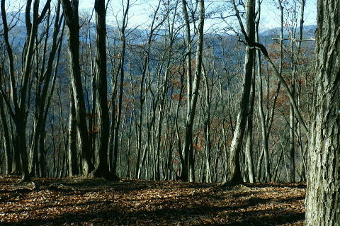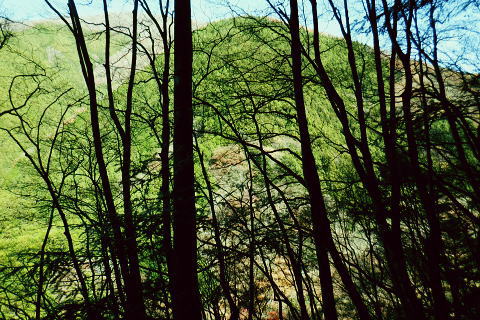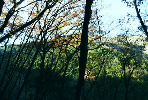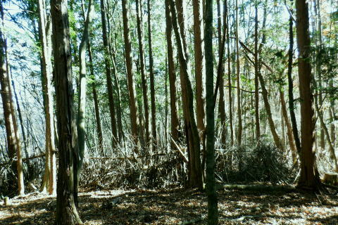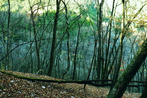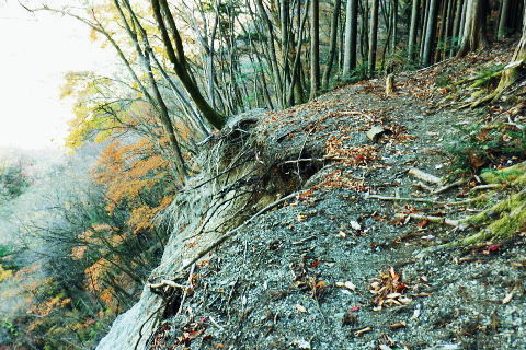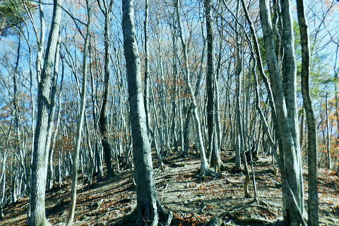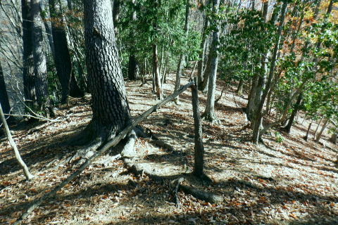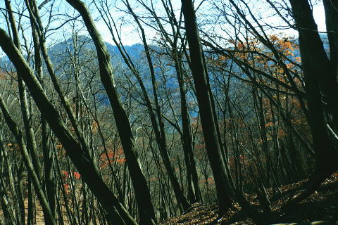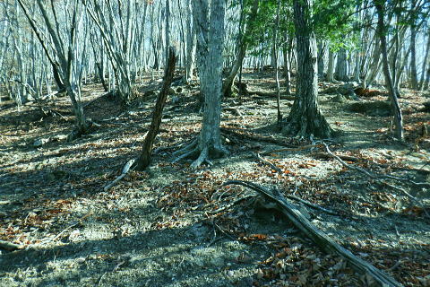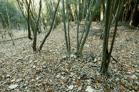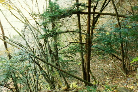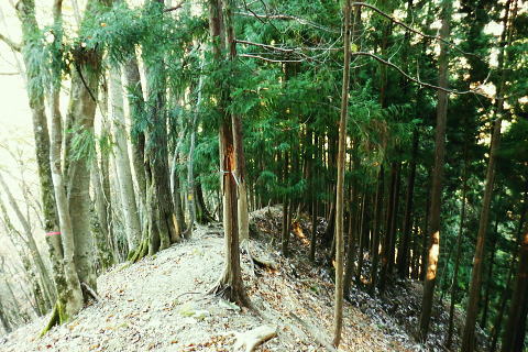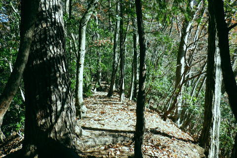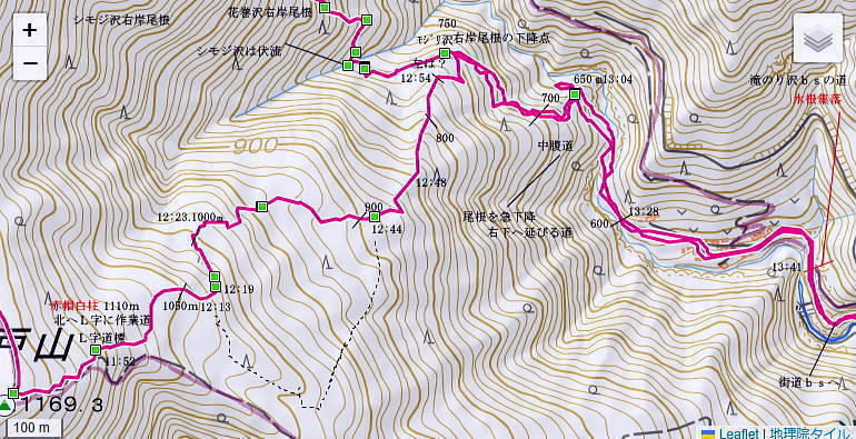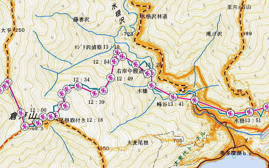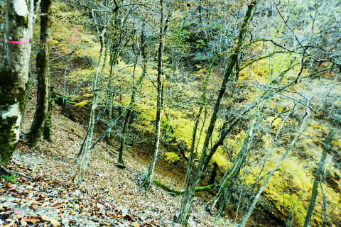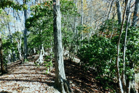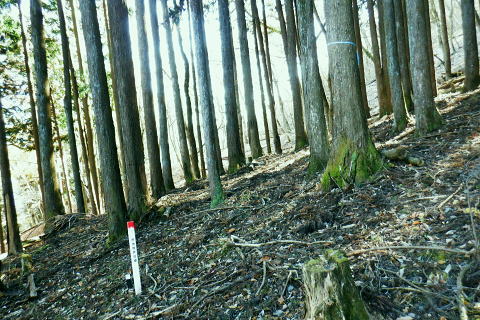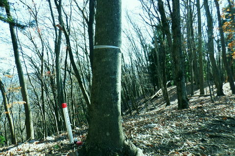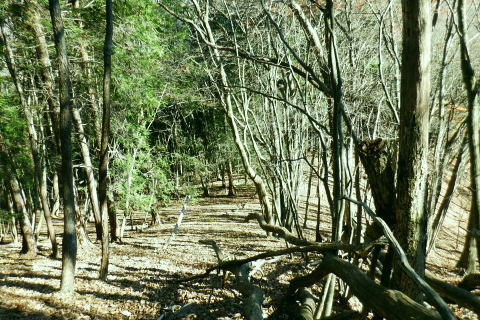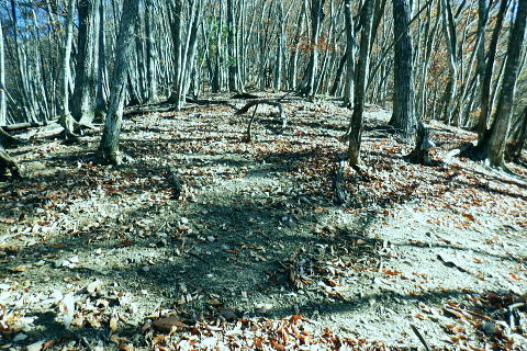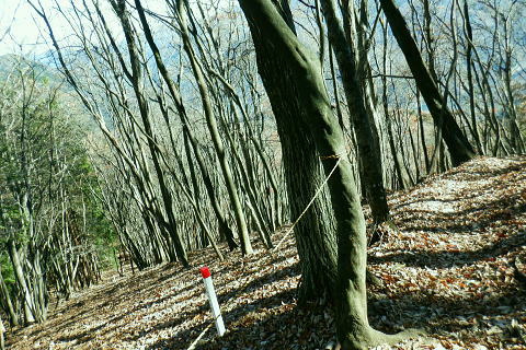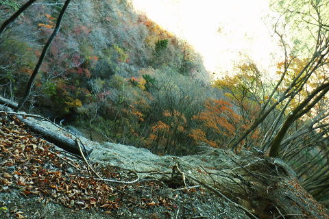 | 雨降谷左岸尾根の後半は枯葉に埋まり尽くされた尾根を詰めている。榧ノ木尾根を南下して倉戸山を越える・・水根沢流域Top 下りは反対側の水根沢右岸沿いのモジリ沢右岸尾根に乗り水根沢中腹道へと繋げ降りた。 峰谷橋bsから雨降沢左岸尾根の前半.760m圏まで 榧ノ木尾根に乗り倉戸山モジリ沢右岸尾根を下り水根沢・・右岸下段の中腹道から水根 中腹道からは水根を経て奥多摩むかし道.中山へ 西久保で折り返し.旧道出合〜境橋 雨降谷左岸尾根 榧ノ木尾根にでて倉戸山へ.9:55 登かな尾根から860m圏で.群生するアケビの急登に.10:07 10:24 960m圏.アケビは続くも傾斜は落ち歩行が楽に.10:30990m圏でアケビは消え明るい斜面へ. 榧ノ木山 1000m圏.10:31 10:39 右遠方は肉眼では細く雪富士が眺められるのだが?奥多摩湖を隔てた三頭山からの山並み.10:40 10:44 10:281480m圏.11:08 雨降谷左岸尾根を登り詰め榧ノ木尾根に乗る。 登ってきた右岸尾根方面を振り返る.11:10倉戸山 小広い台地が続く三又分岐の山頂.11:19 頂は少し南側に位置する.11:20小広く南北に細長い頂で二等三角点標石があり.標高は1169.31m.基準点は「留浦村」. 留浦村村は奥多摩湖の上流の西方端で.留浦浮橋が架かり.近くには小袖川の出合にでる。 北側の平坦な台地.11:21 「熱海(戸倉口)」方面のコースに少し入り1本取る.11:45 道標裏で昼食.11:47〜12:05次のロープに張られた「倉戸口バス停」の道標。向かいは植林帯の境で.今季初めでテルモスを持参し.カップヌードル.小を食べる。 倉戸山モジリ沢右岸尾根 倉戸山越え水根沢右岸の下段中腹道に入る![]() モジリ沢右岸尾根 この脇の赤帽白柱から登山道を右に分け.ロープを潜る.11:48 広い斜面の作業道が一直線に開かれる.11:54御前山と惣岳山 右手にやや回り込み奥多摩湖の湖畔が望まれた.11:54 2本目の赤帽白柱の先が木材で閉鎖されたバリケート.12:141050m圏で北側に方向を変えるところ.分っていたが直進してしまった。平坦なのどから尾根という云うより山腹道。 先の作業道から左側に折れても回り込めるが.ここは戻ることにし.1つ手前の左の小尾根を下る。 バリケートに突き当たる.12:15意味が分からぬバリケートがあった。写真手前の浅い小尾根まで戻り下っている。 ゆるやかに波打つ尾根.12:19 1000m圏にでて黒杭.12:231本のストック 枯葉の吹き溜まりに足を取られ転倒! 右手に掴んでいたストックを紛失。転んだのは一角の狭い範囲だが筈が枯葉が舞い. ストックは埋まりわからなくなる。3年ほど前の10月にも奥高尾からイタドリ沢ノ頭右岸尾根.大日野原を抜け.小渕丘陵にでた折. jr藤野駅に直下して.ストックを紛失した。笹薮の中.数mの距離だだったが何処に行ったのか.探すも分からず。 見える範囲にストックはある筈だが分らず。薄暗くなる中.褪せるのみ。膝を着け.手で探るも分らず。 日没を気にして笹を潰しては掘り起こし.30分ほど探すも見付けることができず.目の前の短い範囲だが諦めざる得なかった。 今回もそうなってはと焦らず.まず転んだ範囲を考慮して.この中の何処かに埋まっていると丁寧に掘り起こす。 そして諦め掛けた時.手に触れたのがストックだった。我ながら今回は見つけ出しホッとした。 ここからは暫く平坦な大地に.12:29 12:35 910m圏.12:39 時たま現れる平坦な台地.12:43 一時の痩せ尾根と作業道としての白柱.12:45 850m圏.12:46 水根沢林道まで続く植林帯.12:52800m圏を過ぎると薄い踏み跡の痩せ尾根を過ぎ.広く開かれる斜面に出ると作業道が幾つも合わさる。 770m圏から尾根伝いにそのまま北進して下れば.690m圏の水根沢右岸の中腹道に出られると思ふも.右手に確りした踏み跡を見付け. 移動したのが最初の計画とは少し違っていた。ただ何処でも歩める斜面にみえる。又下ってぶつかる所が中腹道であるのも間違いないコース。 水根沢 大らかな斜面に薄い作業道を暫し見る.12:57榛ノ木尾山 水根沢対岸のトオノクボの山稜.12:59水根沢下段右岸の中腹道 730m圏で確りした作業道に突き当たる.13:04左に折れればモジリ沢にでる。林道終点. 本作業道にでれば後は沢筋に向かい綴るだけで.木橋で左岸に渡れば水根の集落にでる。 足元下は水根沢の流れ 水根沢の上流側藤巻沢右岸尾根 一時.中腹道を上流.モジリ沢側を偵察.13:09 モジリ沢の斜面を見て戻っている..13:13 戻り.下流側の中腹道へ峰谷橋bsから雨降沢左岸尾根の前半.760m圏まで 榧ノ木尾根に乗り倉戸山モジリ沢右岸尾根を下り.水根沢下段中腹道 中腹道からは水根を経て奥多摩むかし道.中山へ 西久保で折り返し.旧道出合〜境橋 |