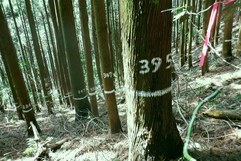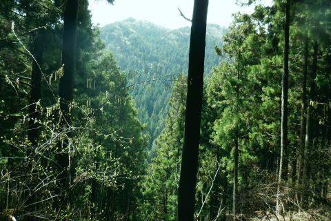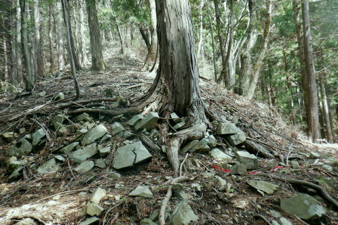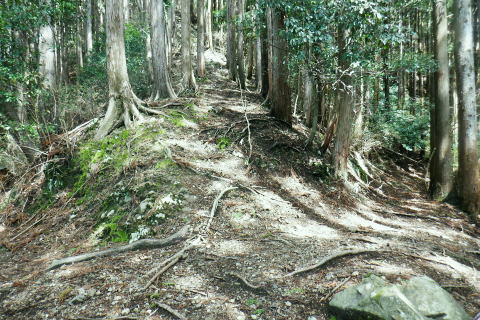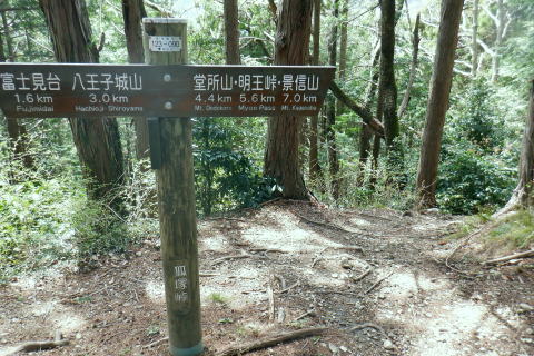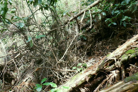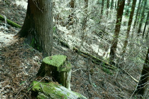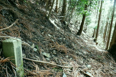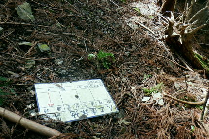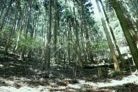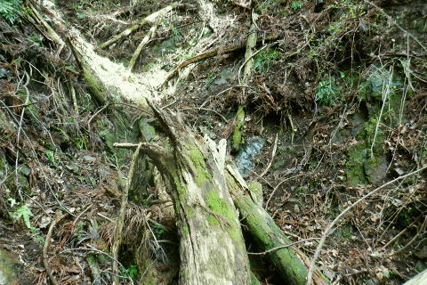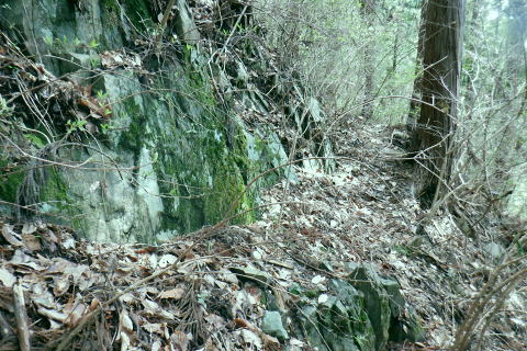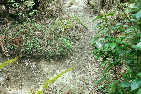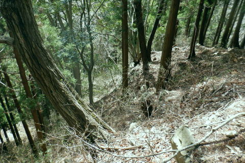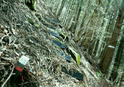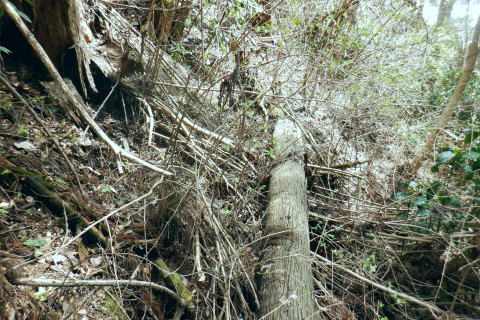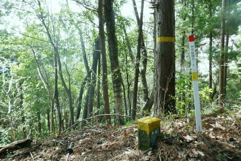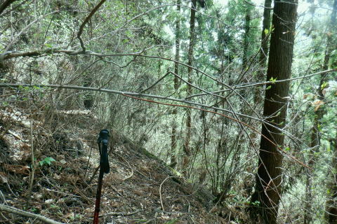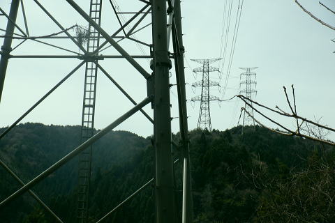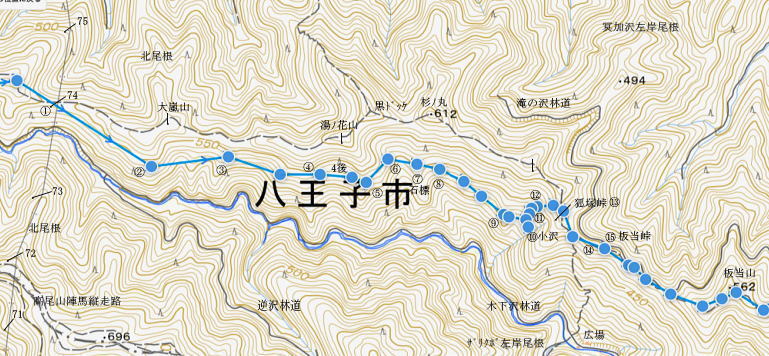 | 新多摩線の74号鉄塔基部脇から北高尾山稜の縦走路を分け.季節にもよるが南側中覆道の藪絡みが激しい巻道に入る。 狐塚峠までは殆どが細かな踏み跡に藪絡みを持つ水平歩道。今の時期は丁度目線に枝木が掛かる嫌らしい山道になっている。 下川井野から三本松山北東尾根 北高尾山稜74号鉄塔から南側の巻道の旧経路・・74号鉄塔.目線の薮 狐塚峠〜富士見台.木下沢分岐 543mP西尾根から矢倉沢を下り木下沢林道 74号鉄塔から先は私にとって北高尾山稜南側経路と云うよりも.山稜自体が全く未踏の領域になっている。 過っては北山稜を横切るため板当峠から入り.狐塚峠を抜けて木下沢林道に下り.大久保山北尾根へと登り返している。 今回の経路は未知数でだが調べで得たい事柄も少なく..コースを含め何も知らぬことがポイントになっている。それが今回は主たる目的に。 北高尾山稜南側経路 74号鉄塔@〜狐塚峠Lへ新多摩74号鉄塔基部からは大嵐山.湯ノ花山.黒ドッケ.杉ノ丸.狐塚峠の北高尾山稜はパスし.南面の旧山腹道を歩む。 @北尾根に乗る送電線新多摩線 74号鉄塔基部より.10:09木下沢を挟んで対岸の北尾根に乗る73号.72号鉄塔を2基望む。その奥の基部には高尾陣馬縦走路の甲武国境尾根が横切る。 南面の木下沢側の鉄塔基部の右脚桁 下段の脚桁から左へトラバース北高尾山稜南山腹の水平歩道 鉄塔基部下へは巡視路のプラ階段を下り.下部の木下沢林道に下りる巡視路とも分かれ.山稜南側の東に延びる水平歩道に入る。 又西側の水平道は鉄塔手前の550m圏から等圧線沿いに480m強の突き出しまで下り.木下沢の林道沿いに並行する山腹道があるらしい。 最後は右脇の背陵への登山道の分岐をを分け.直ぐ関場峠にでるとこのこと。そこは次回に回すことにした。 鉄塔の左脚桁の南東角地から山腹経路に取付く.10:20過ってはここの木立に赤テープに「造林作業道×登山道不可」とあったとか。・・2013.03. それから10年は過ぎ.通う人も乏しいらしく.特に半ばまでは藪絡みの激しい作業道として残されている。 右下に折れ巡視路を下れば木下沢林道にでられるが.今回は作業道口を改めて見詰め.真っ直ぐ巻道を歩む。 A.最初から藪絡みの作業道 540m圏.まだ春先で葉は茂ぬが細かな枝木は多い.10:27 北高尾山稜と木下沢林道との中間に付けられた作業道.10:30B対岸の696m点コブと590m圏コブ 最初で最後に覗き込めた南側の展望.10:31 枝藪絡む斜面.10:37前半は次第に藪絡みが酷くなり.周りを囲む展望は失われている。今の時期は葉も付かぬ裸の枝木を通す姿だが。 透明度も高い筈だが.細かい枝絡みが多く重なり.注意せず適当に歩むと目線に枝木が当たり.悲惨な状態に陥る。 それもムチのようで手だけでは防ぎようがなかった。帽子を確り頭に付けることが一番の必要品になっていた。 石積もあり.露岩下の足場は確り付いている.10:41目線を避けた中腰の姿勢での行動は不自然な姿になり.疲れることはこの上もない。 その上.足場は狭く.分かりずらい所もあり.苦労させられた。障害物のある所は以外と足場がよいが.大股に高くなる。 C.細かく枝木の絡む斜面 踏み跡の浅い不確実な所も.10:46右側の直ぐ下に小下沢林道が透けて見える筈だが? 転がる倒木.材10:48小尾根を越え 小尾根の520m圏から湯ノ花山610m圏の上部を見上げる.10:56中半に入り幾らか足場だけでも確りしてきた. Cの後. 湯ノ花山から南東に下る尾根筋 下る下部を見下ろす 小尾根を下って左に少し曲り下りている。木下沢林道に下りられそう。 進むべき左横を見るD.上部の北高尾山稜を見る 道も周りもややワイドに.11:03E.緩斜面の広がる台地 510m圏.楽になった広い踏み跡.11:07F.石標のある山腹道 490m圏.数多い名入石標あり? が列をなす.11:08数多く農林関係の肩書ある人物で.頭に二桁の番号が付くが.置く位置はバラバラ。 石標.倒木を抜け山道らしくなる.11:15倒木が綺麗に切られていたが.藪絡みはまだ少し残されていた。 G.杉ノ丸612mからの南尾根 500m圏(454m?)の小尾根越し.11:19左から小尾根を越え右に抜けている。すっきりした山道に変わっている。ただ作業道で道標類はない。 H.広い山腹の植林帯に入る 初めての木の屋号.2本線と幅広い作業道へ.11:26 落ちていた「人工造林地」の白紙の標板.I小沢 470m圏.植林カールの東端は小沢の踏み跡は途切れる.11:29小沢沿い 傾斜の緩い斜面の広い植林帯にでて.両手を広げる林道のようになったと思ったら.急に閉ざされ道に塞がれた。 見た目.その切っ掛けになったのが.この落とし物.「人工造林地」。先は細道に変わり.小沢沿いに吸い込まれた沢筋は 穴口のような地形に変わっていた。狭い流心に入ったと思ったら行き止まる。何故かと思うも戻るしかなかった。ルートではない。 J.壮大なワイドな植林帯 立木.1本ずつに木番号が付けられた杉林状のカール.11:40今度は戻り.広大な植林帯にでて行き止まる。ワイドな植林帯の東端下. 広く歩き易い植林帯に入り.少し高度を落してしまったらしい。 このまま林道に下りても大丈夫かも。木下沢は広場辺りは大