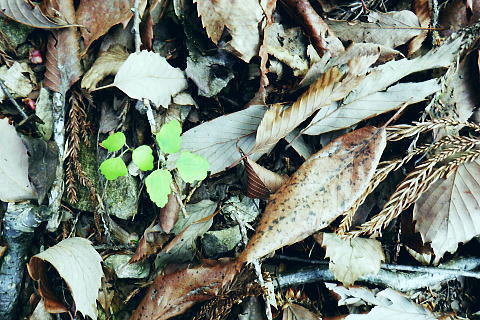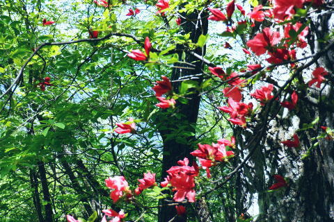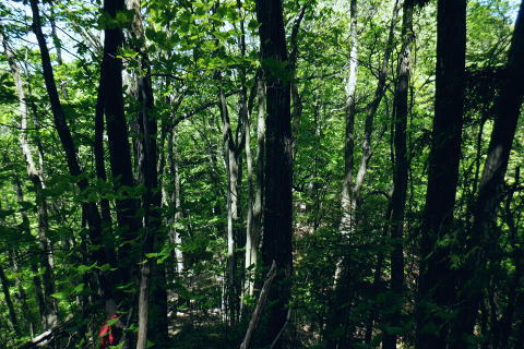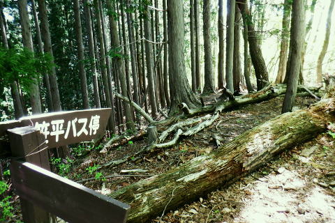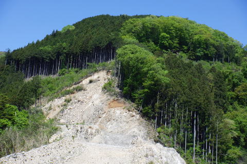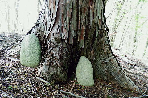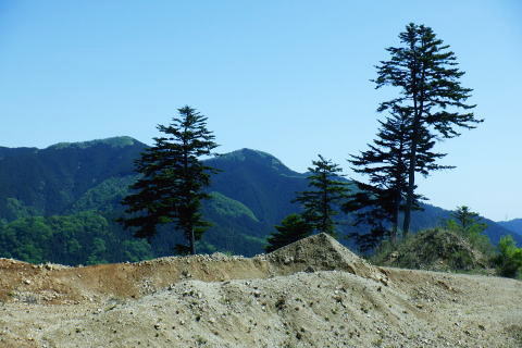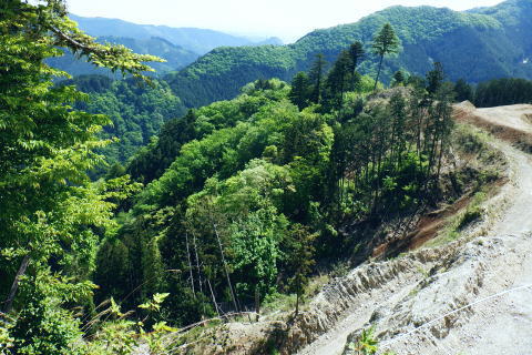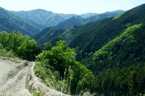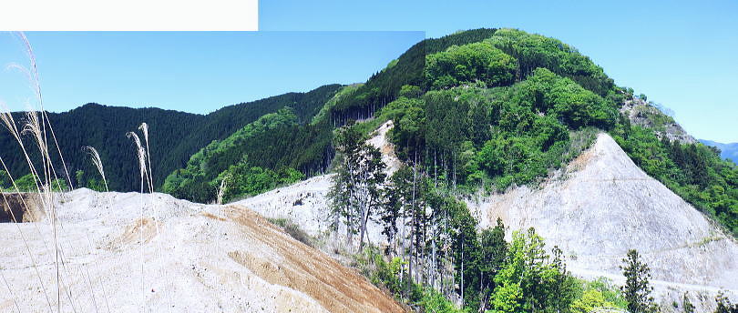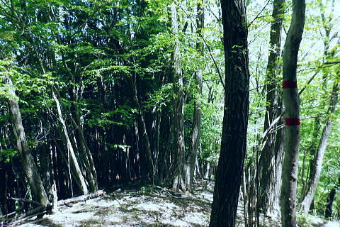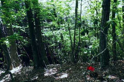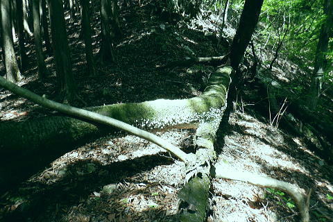 | 旧バケモノ山から吉祥寺尾根の760m圏峰を経て.松生山南東尾根の840m圏小コブにでる。先は払沢ノ頭から西側に回り込み松生山933.7mへ 本宿役場前bsからバケモノ山東尾根 吉祥山760m圏峰南東尾根から松生山南東尾根・・過っては藤倉分岐尾根から逆縦走で松生山.840m圏小コブ・春雪と夏日 松生山出野沢右岸尾根・・檜原街道..南郷 旧バケモノ山からの大展望 ほぼ採石所越野の北側方向.9:20背は中里沢と千足沢流域の稜。馬頭刈尾根の大怒田山と高黒山.つづら岩を隔てた小屋ノ沢山. 656m峰と臼杵山 バケモノ山南東尾根方向の下り市道山と醍醐丸 少し南方の展望中間の吊尾根はまだ残されている植林の陰裏に閉ざされている。 小坂志川右岸の山並・・臼杵山・市道山吊尾根 バケモノ山の南方削りつられ旧バケモノ山を越え 完全の禿山に変身した山頂の逆側から振り返る.9:32旧バケモノ山東尾根を登り詰めた裏側の東尾根は.最後にツゲツゲの藪に再度出合っていた。 地形図によると旧バケモノ山は突き出した山頂になっている。その頂上が今は窪み.高度は採掘でマイナスへ。 ・・バケモノ山の由来は「2018年2月のバケモノ山」. 780m圏峰南東尾根と右裏の北東側は吉祥寺尾根 780m圏峰の南東尾根は旧バケモノ山と繋がれている.9:29 足元はトゲトゲの茂み.9:44以前は大型車両が通れる幅広い坑道が一本.まだ荒れた凸凹姿で築かれていた。 旧バケモノ山の北側.山ノ神沢源流 780m圏峰南東尾根の取付きより.9:46吉祥寺尾根の下端 逆側の北側に振り檜原城址G.登ってきた少し高みから南面の坑道の背稜口 今の鉱山坑道を見下ろす.9:45鶏冠尾根・・醍醐丸〜連行峰.茅丸 .右手前が万六尾根.湯場ノ尾根醍醐丸の谷間.小坂志川流域を最後の見下ろす。.その右伝いが南秋川渓谷と檜原街道。 H.780m圏峰南東尾根 採石所から離れ坑道から作業道の急登.9:49 深い枯葉 倒木を通過.10:04I.780m圏峰の東肩760m圏 右から登ってきた吉祥寺尾根筋と合流.左くっと曲がる.10:15J.780m点圏 やや細長い平頂で都水道局の標石を通過.10:17 以前はここから植林帯の斜面を斜下してバケモノ山を目指す.10:20過って藤倉分岐尾根から浅間尾根を東進して.840m圏小コブで浅間尾根を分け.バケモノ山を目指している。 この地点.780m圏コブから南面の植林山腹を斜下し.780m圏峰南東尾根の下端にでて.出来たばかりの坑道を歩み.バケモノ山に立っている。 後は.バケモノ山東尾根から笹野に下りる。樹林を失った根株だけの索漠とした頂だった。又前半は雪原状の春雪に覆われた台地を歩んでいる。 淺間尾根840m圏の小コブ 浅間尾根.払沢ノ峰858m直ぐ下の小コブに合流.10:41過って訪れた時は小コブの中央に.今と同じ黄色いプラ抗と埋まる赤帽が立ち.右脇の二又に分かれる立木には「財団法人. 南郷共益会所有地」の立木看板が目印になっていた。その上.反対側の取り付きの立木には念を押すよう 「←バケモノ山」の印がピンクのテープで貼られてもいたが取り外されている。 その印を目指し.緩やかに北側に湾曲する東尾根に入っている。このコブは黄色いプラ抗だけが残されてすっきりしたコブに変えられていた。 それに比べ朝の入山時の東尾根は採堀現場を横切るものの.都水道局の境界杭は立つものの.通行禁止の標識や柵類は設けられていなかった。 松生山南東尾根840m圏の下り方面 南東尾根の下端は.笹平へ尾根沿いの1つ下の小コブからは2019年9月に 払沢ノ峰北東尾根を詰めて.この尾根の1つ下の小コブから出野沢左岸尾根を下る。 檜原街道からは嫁取坂を経て旧醍醐峠え・・古道を綴り醍醐の集落と繋げている。街道では猛暑で動けなくなっていた。 上り方面・・灌木に深く覆われた払沢ノ峰 .直ぐ上部の858mを見上げる払沢ノ峰 標高点は858m点.東京里山100・・10:52払沢ノ峰東尾根は採石場に没している。北東尾根の末端は払沢の滝にでる。 過って払沢ノ滝から払沢ノ峰北東尾根に乗り.出野沢左岸尾根を下り.嫁取坂から旧醍醐峠を越えたことがある。 檜原街道にでてからは残暑の強い照り返しを受けダウン。柏木野バス停小屋に戻り.一時休んでいる。 それから2停留場を路線バスをるようして過ぎ..改めて登り返したことがある。今回は払沢ノ峰は素通りした。 浅間尾根840m圏 払沢ノ峰からやや北東に曲がり最初の小コブ.10:59840m圏北尾根・・急下降で正面に大岳山が眺められ.痩せ尾根をゆっくり下り.750m圏分岐を左へ。ちなみに右はとんでもない急下降。 下って下って630m圏分岐を左へ。580m圏は直進し痩せ尾根を降り.右雑木の林相の境にでて水の音を聞く。1:00. 下班は平坦な扇状で地形図通り. 瀬戸沢(下流に払沢ノ滝).対岸に道を探し下流へ。鳥居形のパイプが沢を横切り.沢を渡って淺間林道:20. .時坂から払沢ノ滝1:00. 小さな紅色のミツバツツジ.11:01 石の?.11:09標高867m点コブの直ぐ手前のヒノキの根元には意味ありげな丸石が2つ並び置かれていた。 この辺は集中的に「財団法人.南郷共益会所有地」の立木が続く.11:13「共益会所有地」は南秋川対岸の小坂志川.矢沢周辺の山々にも掲げられてい