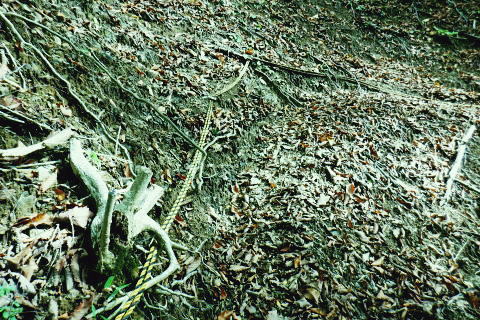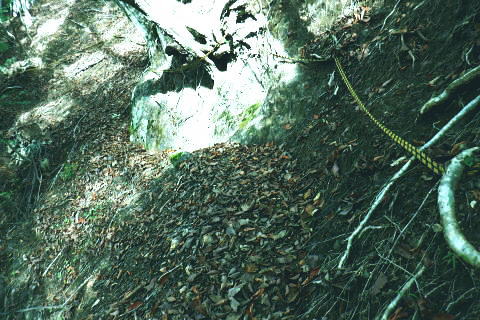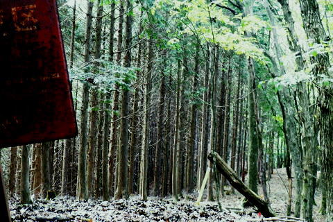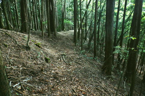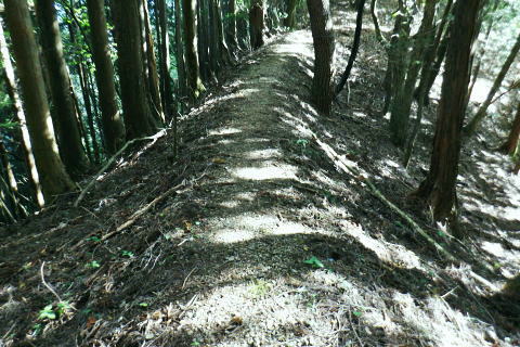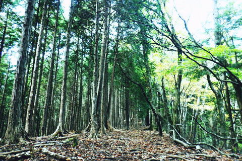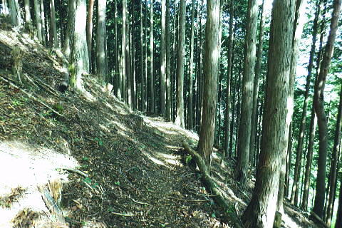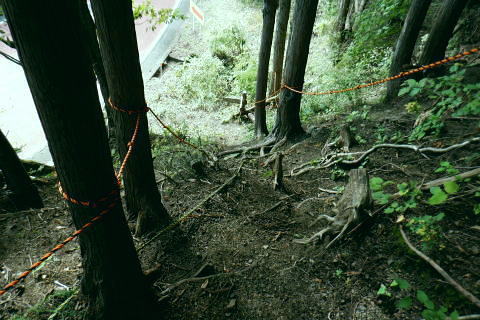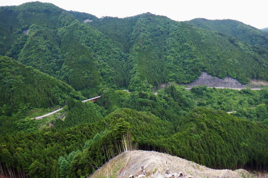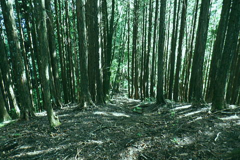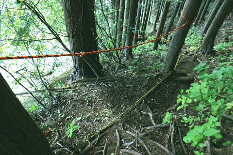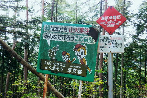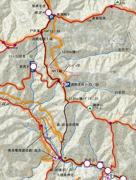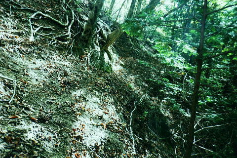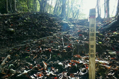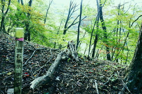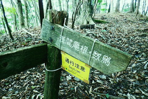 | 風張峠から鞘口峠のコースに入り.風張ノ頭から浅間尾根の最上末端に乗る。難路は固定ロープで助かっている。 再び周遊道路を横断すると私の知る浅間尾根最上部と繋がり.浅間尾根Pから無名の1120m圏コブにでる。ここは今回で2度目.下山は里の九頭竜神社. 藤倉から陣馬尾根を詰め小河内峠 町村界尾根の月夜見山周辺と風張尾根.風張峠 浅間尾根北端の戸沢峯から南下し.浅間P越えの1120m無名峰・・周遊道路W・結んで浅間尾根を完歩 1120m峰から森ノ沢右岸尾根.数馬〜数馬下bs 鞘口峠への山道へ 風張峠を越え砥山方面へと右に回ろ込む.12:44戸沢峯浅間尾根.上端〜1120m圏コブ森ノ沢右岸尾根 奥多摩周遊道路の横断は2.道脇は3南秋川上流端の九頭竜神社にでる。 浅間尾根の最上端尾根.戸沢峯〜1217m峰 三頭山東峰展遠望台より御堂指尾根に下りブナの路から撮影・・2016.03.31/2/11:15. 暮れに大岳山御坂尾根を訪れ養沢川側を綴っている。その下部が御前山湯久保尾根。 更に下の尾根は浅間尾根最上部の戸沢峯から御林山に至る藪尾根で.北秋川と南秋川(檜原街道)を分けてもいる。 尚.右下には奥多摩湖周遊道路が通り.直ぐ脇の鞍部に浅間尾根Pがある。 戸沢峯の裏側が風間ノ頭.風間峠へと続き.月夜見山と倉掛尾根に分けている。 鞘口峠方面へ.12:45 先ずは戸沢峯に立つ.12:54鞘口峠へ直進し.浅間尾根への腕木は戸沢峯の裏側を左へ抜けている。 戸沢峯 戸沢峯は鞘口峠と分かれる分岐点.13:01鞘口峠への途中.砥山も「戸沢峯」と同じ名で呼ばれてもいる? 戸沢峯.別名「風張ノ頭」の頂は登山道は.稜線から僅かに南側を通っている。ここで鞘口峠への山道を分け.頂から左に南下する。 浅間尾根の最上端 浅間尾根の途中には難所あり.固定ロープが設置されていた.12:58戸沢峯周辺は何故か.道標類が極めて多い。立て続けに現れる。ただここを過ぎると道標類は周遊道路を横切るまで皆無。 又「悪路につき 通行注意」の警告版が付け加えられていた。 戸沢峯から右下の尾根沿いに.道標「浅間尾根.数馬」へと下端へ 井戸入右岸尾根の伐採地の頭から撮影・・2022.06.13/15:07戸沢峯から浅間尾根に繋がる東尾根で.御林山.道奈良山.内台山連山と浅間尾根の下腹部を横切るのが周遊道路。 鉢指沢ノ頭東尾根「深山の路」から東尾根を分け.1149m点コブから待望の伐採地.井戸入右岸尾根に乗る。その頭からの展望写真。 伐採地跡の末端からは奥多摩周遊道.旧道から檜原街道.数馬にでている。 砥山.鞘口峠への登山道から浅間尾根へ下る.12:58 鳥獣保護区の古い道標があるT字路.12:59鞘口峠への道を分け.初めは歩き易い穏やかな尾根道が続く. 鞘口峠方面の杉林浅間尾根の最先端部 ここで13:12昼食13:32全てが私独りだけの為にあるような贅沢な場所で昼食を摂る。足場は何もなく.やや大き目の枝を3本探し出し.腰下に据えた。 語り合う微風はあるものの.風との会話も控えめに。作業道だが人通りは控え目に思える場所。何か何処もが湿っている。 ・・経口補水液・茶・500cc.妻の弁当.オレンジ.バナナ. 間食は帰りの電車で月餅. 小さな丸太を3本拾うい出し.山道中央に陣取る。足元は急坂に見えぬ食後の道. 尾根が狭くなり.何とも云えぬ起伏の盛り上がる場所.13:33 1010m圏小コブ.平凡すぎる歩き易い尾根だが.13:361100m圏コブから抉り落ちる崩落地 西肩の幾何学的に組まれた固定ロープにでる.13:38山腹をトラバースする1217m点峰の手前の小コフの西肩゙は.崩落が激しく.最近.新たに幾何学的に組まれたトラロープが設置された。 10年ほど前までは.それほど抉り取られてはいなかったようだ。それでも「悪路注意」の札板は道標に付けられていた。 1210m圏小コブの南山腹 上部の根元まで這い 上がり.トラバースして.難路を渡る.13:38一ケ所.足場が狭く傾く場所にでる。ロープがなければ支える手元がなく.雨でも降れば嫌らしい場所になろう。 固定ロープ.13:41組まれた固定ロープがデンジャラスに崩れる悪路に張られている。安心感をもたらしていた。その威力は凄い。 危険地帯を通過し山腹道を直進.13:50そのまま右の山腹に回り込む。右側の谷間は朧に霞む森の茂みで望めぬが.周遊道の「数馬の湯」方面からだろう。何か催しものか? 軽いテンションの曲のような音色が.微かな風に乗り.聞こえきた。それは気にするほどのこともないが? 何時もの山にいると云う感覚とは異にしてた。周遊道路にしろ.私には違う次元か。出会う人も猟師か.地元の方が殆ど占めている。 奥多摩周遊道路 眼下に見下ろされる周遊道路へ下る.13:53急斜面の左肩は落石防護でのコンクリートで固め.足元は20m強ほどの擁壁のような土砂の急斜面。 周遊道路W・・周遊道路へ下るため.劇斜面の踏み跡の両側を挟むよう.幾何学的に真新しいトラロープが組まれていた。 周遊道路が真下に見下ろる。劇坂にはトラロープがダブる.ここでも幾何学的なロープは安心感をもたらしていた。それほどの劇斜面. これこそ.あって助かるロープ.下の道標の左向こう側のカーブ先にも浅間尾根駐車場側の道標がある。 急