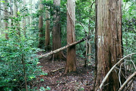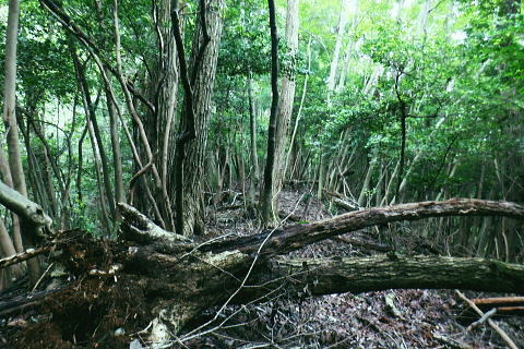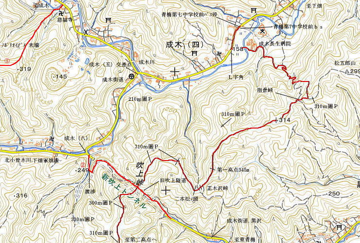 | 青梅.成木街道の旧吹上峠周辺を取り囲む里山群を綴る・・旧吹上峠Top ・・青梅周辺の里山の青梅丘陵Top 成木(四)から指倉峠.旧吹上峠2を越え.青梅丘陵を少し齧り.三方山をピストン。裏側の丘陵コース.黒仁田流域の里山を縫い黒沢(四.)とjr青梅駅 (裏コースの青梅の杜.こぶしの森)から南下する 2024年09月23日.松村 青梅第7中学校前bsから指倉峠と新.旧吹上峠越え 314m点Pからは青梅丘陵の三方山をピストン 鷹巣山から裏コース「青梅の杜.こぶしの森」から黒仁田沢の2つ目の出合 黒仁田林道二又から黒沢(三).青梅トンネルを経て梅岩寺.jr青梅沢 三方山 4年ほど前の春.高水山南尾根を詰め.東尾根を延々と東青梅を目指し.尾根末端の成木(五)にある慈福寺に降りている。 そして成木川の二俣がある成木(五)交差点から左俣.北小曽木川流域沿いの上流側へ.(八)で右に折れ.旧吹上隧道を潜り.成木街道から東青梅にでる。 その折.吹上峠の土手道から南西面の谷間遠方に.青梅丘陵に聳える三方山が見上げていた。この日は方向を変えて三度の眺め。 朝方の歩き初めは二俣尾の高みで東遠方に小さい三角峰を眺めている。そしてノボリオイゾネでは旧青梅線の鉄塔跡から北側の姿。 ここ吹上峠では磁石を充てると南西方面の丘陵に小さく見上げられていた。ほぼ半円を描き歩いて来たことになる。今回はその三方山にも立つ。 東青梅駅北口バス停.6:54青梅駅周辺の路線バス停に関しては都バス.京王.西武バスと各社の異なる路線上にあり.駅バスターミナルはない。やや複雑な形態が取られていた。 バスの乗車は初めての私. 乗る「都74」黒沢循環行は駅前から東青梅北口駅交差点にでて.旧道を西側に70mほど歩いた所にあった。 今回とその時の三方山を想い出し.往路は路線巡環バスを利用している。並木街道の新吹上トンネルを潜り.成木五丁目交差点からは 前回とは逆側の四丁目から上畑方面に回り込み.青梅第7中学校前バス停で下車した。 そしてここを起点に.過っては青梅中央アルプス(裏銀座)と呼ばれていた.旧吹上峠の北側に並ぶ旧峠(指倉峠)を先ず詰めることにした。 里山から旧吹上峠越えをし.青梅丘陵の三方山をピストン.再び裏コースから「青梅の杜」.「こぶしの森」を抜けることにする。 成木街道入口交差点 jr東青梅駅.西寄りの踏切手前の交差点.7:00路線バスは右に折れ成木街道に入る 9月21.22日に都心の気温は36℃と猛暑日。台風14号は中国に上陸した後.Uターンし21日(土)午前3時.黄海を東進した。. 午後にも前線に取り込まれて温帯低気圧に変わり.22日には本州付近を通過する見込み。 本州付近に延びる秋雨前線の活動が活発化し.東北〜九州にかけて警報級の大雨となる恐れあり。 都心では35℃で熱中アラームが連続して発令されていた。その中.21日に決意した入山を更に23日に延ばしていた。 当日朝は雨雲濃く.日の出を神田で迎えるも珍しく真っ暗闇。新宿辺りで明るみ始め武蔵境を過ぎて降雨は漸く治まった。 黒沢(二) 先に信号を左折して吹上峠へ9月26日.月秋分の日.曇.時々晴 jr御徒町5:20=5:24神田:31=6:16立川:19=6:52東青梅北口.都バス7:00=7:15青梅第七中学校前bs.日の出は神田駅5:32. 新吹上トンネル東詰 都道53号線.成木街道の黒沢(二)交差点から1kmほど.成木の吹上峠は四重に重なれた峠で.年が経つにつれ.人の流れと共に.三層の隧道が作られた。最上の古々々隧道は閉鎖され.通行不能。 中道の隧道は自転車.歩行用に改修されている。一番底の地上と繋がるのが新吹上峠トンネルで.路線バスで潜っている。 吹上峠 青梅市北部の吹上峠は江戸時代より石灰を運ぶ道として.峠路は交通の要所でした。 都として車の通行可能な隧道が造られたのも.ここが初めてだった。青梅街道は石灰を運ぶ為の街道でもある。 成木街道を通るバス路線の途中に.山越えの吹上峠があり.古いのを合わせると3つのトンネルが三段重ねで昔から1つずつ積み重なり. 現在.車両が通行しているのは1993年に新吹上トンネルが開通した都道。私は今.街道を綴り.路線バスで上流の成木方面に潜っている。 新トンネルの上部に斜めに交差するよう1953年に竣工された吹上隧道がある。今は徒歩.自転車のみの通行は可能で.廃道ではない。 以前高水山から東尾根を延々と歩み.更に成木街道を進み.この吹上隧道を潜り.東青梅にでていた。 そして前回は都道として開放されている隧道を歩み東青梅に抜けていた。又世間で言う心霊スポットにもなっていようだ。 その更に上部に重なるのが今は閉鎖された旧々吹上隧道. 東京で初めて造られた道路トンネル。その上にあるのが今日歩む吹上峠281mがある。 現在の隧道は敷地が私有地にも掛かるためと.老朽化が進み崩落の危険があり.通行止めになっている。更なる古来の歩く吹上峠越えを目指す。 成木(四) 閑散とした青梅第七中学校前bs.7:15新吹上トンネルを潜った東詰は三差路の成木(八)交差点. 五丁目交差点までの間は成木街道と下畑軍畑線が×に字に重複する形で接続している。 交差点の左前方は下畑軍畑線が綴られている