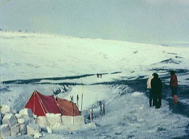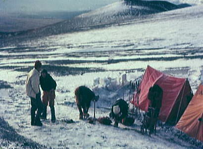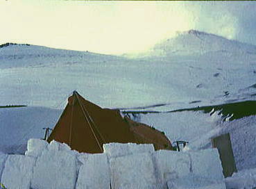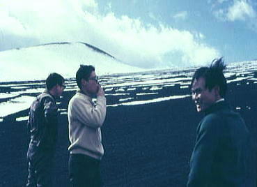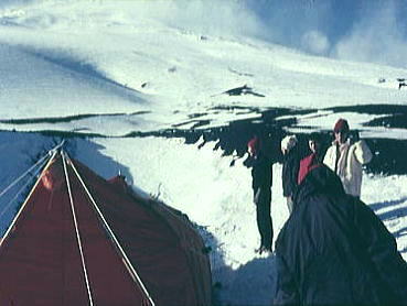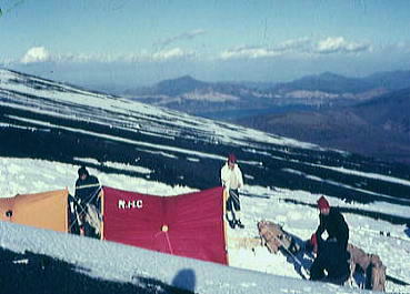 荒れた正月の富士登行U・・冬富士Top 荒れる富士御殿場口.U・・s43年(1968年)12月30〜01月02日 m富山貞夫(38年卒).新津賢.中山司(40年卒).田中正幸(41年卒).根岸哲夫(42年卒).田沼栄一.松村進(4) 冬富士U.三合目ベースキャンプ・・旋風とアタックは中退.前回の小屋で小休止 冬富士U.スキーで遊ぶ 滑落事故続出の富士 小田急行ロマンスカー車内で根岸氏と一昨年のベースキャンプ五合五勺で登行を断念. 気象条件の悪いアイスバーンのスキ 新二合目⇔三合目bc1.2.3⇔五合目⇔宝永山. 12月30日晴. 御殿場10:35=11:00新二合目:20一12:10雪線bc1 赤レンガの会合に出席した私は知らぬ間に今年の富士山行のメンバーに含まれていた。 入山は一昨年と同じ御殿場からでアラスカ遠征への願望が企画される山行にもなっていた。 晦日の早朝,新宿からロマンスカーに乗り込む。メンバーは先輩3名.新津.田中.根岸各氏に同時田沼と私。 御殿場にはもう既に富山.中山両先輩が待ち迎えられている。 早速.昼食を済まし富士に向かう。再び荒々しい広々した裾野.富士の馬鹿でかい原野。 タクシーは自衛隊駐屯地を抜け新二合目まで入っている。 もうここは森林限界になり.1時間ほど高度を稼ぎ四合目手前.雪線の窪みにベースキャンプを設けている。 入山 Bc.三合目雪線 山中湖平野からの富士山.2008.12. |