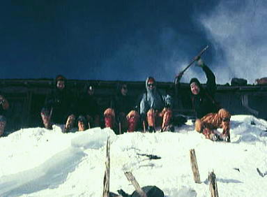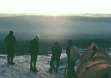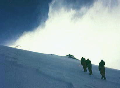 12月31日晴風強し. bc8:05⇔9:40五合目:20.一10:55.新津.除く全員 大晦日.31日の日ノ出 御殿場四合雪線上でアタック前変化に乏しい大斜面 遠く雲海を切って朝日が昇る。素晴らしい自然の夜明けを迎えている。 雑煮を流し込み.新津氏を除き全員で御殿場ルートをアタックした。 旋風 真に頭上はコバルトブルーの世界.頂はガスに包まれている。 我々6名はピッケル・アイゼンに身を固め変化に乏しい雄大な斜面を登る。 宝永直登ルートは雪面が締り四合目を過ぎると強風地帯に入り.富士特有の烈風を受けている。懐かしくもあり心地が良い。 紺碧の空に旋風を見受けると身を引き締め.前回と同じようにピッケル.アイゼンで足場を固め確保する。 旋風の流れが真近に迫り.突風が渦を巻き体に絡み巻き込むよう襲われた。そして身を固めた間から.バリバリと体があおられ風が抜けた。 足元から抜けた風は更に渦を巻き.白糸を弾きながら谷へと抜け落ちる。 望む頂はまだまだ先である。 数歩.歩るくと束の間又.旋風が現れる。その都度確保が待っていた。 五合五勺小屋前 |