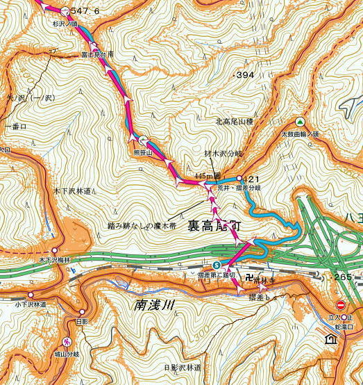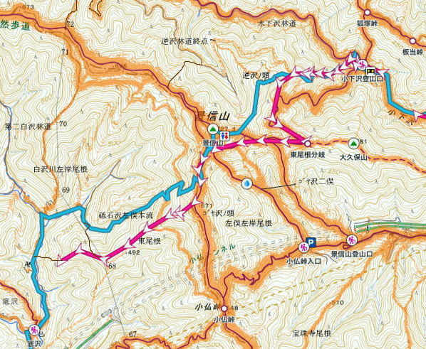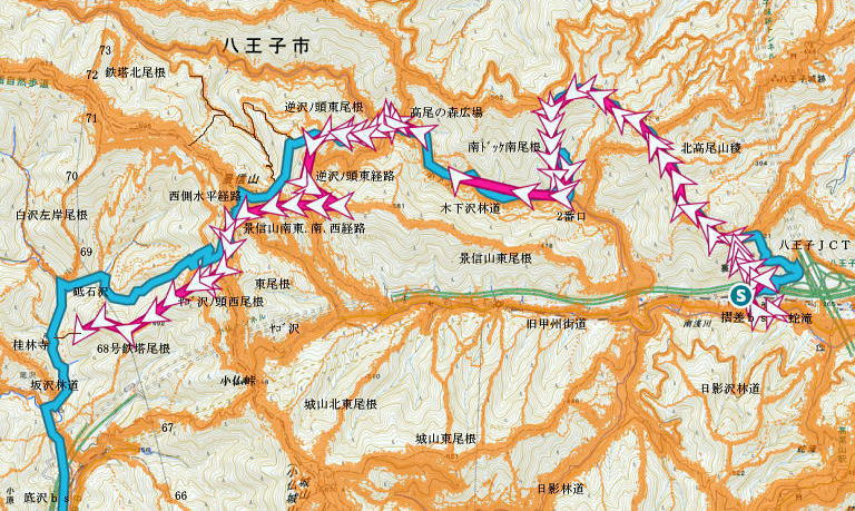 | 高みではなく景信山周辺の径路を点々と繋ぎ.摺差から底沢へ至る 北高尾山稜.材木沢分岐の先の入り.景信山南半球の径路を繋ぎ合わせ.ヤゴ沢ノ頭西尾根に回り込み白沢川へ。 摺差bsからJCT分岐と南ドッケ西肩へ 7:43〜9:23予定では取付きの青線.登山道から北高尾山稜に乗る積りでいたが.諦めて左側に小枝尾根を詰める。踏み跡のルートはない。 過っては富士見台南から西小尾根のコブを経て.矢倉沢を下り木下沢林道の一番口にでる。 それ故.今回は南ドッケ西肩から南尾根を下り.林道の二番口に出ることにした。 2021年03月10日. 北浅川川井野から初めて北高尾山稜を越え.小下沢を取り囲む景信山東尾根に回り込む. 三本松山と逆沢ノ頭 2024年04月07日. 下川井野bsから三本松山北尾根.北高尾山稜の東方.旧道.73号鉄塔基部からの巻道経路.富士見台.矢倉沢下降.木下沢林道 小下沢林道から逆ノ沢ノ頭東尾根 逆ノ沢ノ頭東径路から景信山南東.南尾根 景信山西径路から69号鉄塔西尾根 10:40〜13:48(14:13)予定では逆沢ノ頭へ直登する.更に先の東尾根を変更し.山腹径路に出てからは左に折れ.大きく右回りに径路と繋ぎ繋ぎ綴ることにした。 景信山北東側から西(逆沢ノ頭東径路).南東(東尾根)南(ヤゴ沢源流径路).南西(奥高尾縦走路).西(西側水平山腹道) 又景信山西側の水平径路取付きが不確実の為.ヤゴ沢ノ頭西尾根の径路に変更した。 下山してから地図を改めて読むと左俣本流でも.中俣の尾根でも.楽に降りられてらしい。 全行程図 2024.11.28景信山の南西斜面から相模湖北面の底沢川流域・・2024年01月31日の山行.地形図 終盤は踏破ルートが途切れてしまったが.そのまま西尾根から急山腹を下り.白沢川を渡渉し坂沢林道に出ている。径路はここまで. 全コースでハイカーとの擦れ違いは.完全な藪で入山は0.幾つもの径路を綴るも0.北高尾山稜0.木下沢林道0. 奥高尾縦走路にでて初めて5人の方と出会い..坂沢林道0.県道0.国道は相模湖東まで0人だった。 今回は何故か「山レコ」を開くと画像の前に撮影していないのに記載放棄のよし.悪しを示すものが現れた。 その結果がコースの欠損を示しているかのようにも思われた。「山レコ」と「いまここ」の山行コースの欠損及び終結点を記してみる。 「山レコ」では@として.JCT左左脇の中央高速道を抜けて20mが切れている。 Aは木下沢林道のゲートの手前50mほどの間隔. Bは奥高尾縦走路の分岐から南下して鞍部.35mほど. Cはゴヤ沢ノ頭西尾根の高度600m圏で20m. 更に38号鉄塔東尾根の高度370mでコースは終点し.途切れている。実際は白沢川を渡渉し坂沢林道から県道.国道にでてjr相模湖に至っている。 「いまここ」は@は「山レコ」と同じ地点. Aは「山レコ」のAに先.ヤゴ沢の分岐から途切れ.鞍部の手前で現れてBへ. 更にCへと進み.終点の途切れは同じだった。 摺差bsから詰め.JCT分岐と南ドッケ尾根を下降 小下沢林道から逆ノ沢ノ頭東尾根と東経路から景信山南東.南.西経路と回り込む ヤゴ沢ノ頭西尾根から69号鉄塔西尾根へ・・白沢川を渡沙し底沢川を下る 2022年02月27日. ゴ沢右岸尾根に続き.左岸尾根から武相国境尾根を西進し奥高尾へ. ヤゴ沢左岸尾根を越え.逆沢林道の680m圏北尾根から武相尾根に乗る。作業道・古道・登山道と綴り.高尾の矢ノ音を越える。 下りは貝沢川本流.貝沢林道から与瀬にでてjr相模湖駅・・山行概念図 |