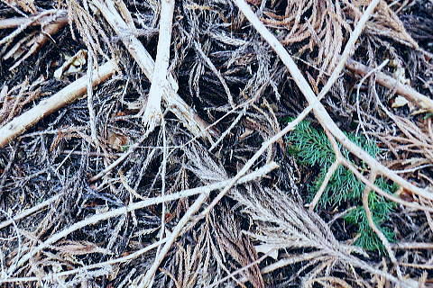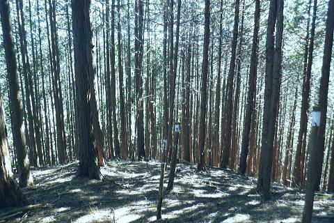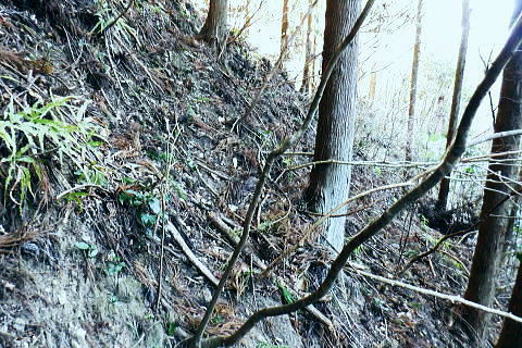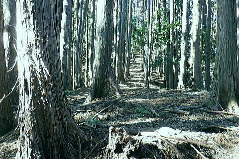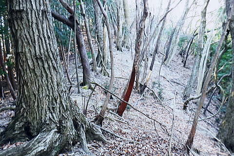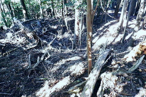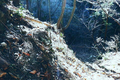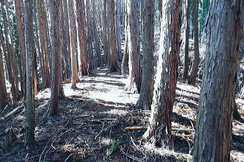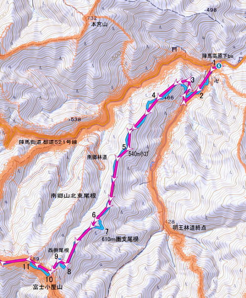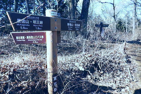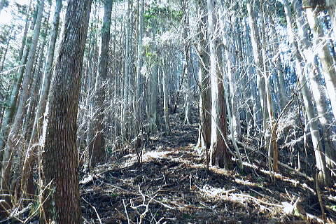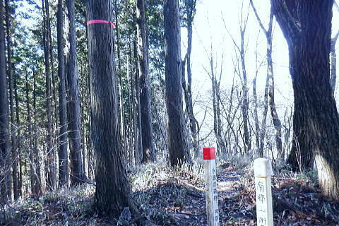 | 「倉子峠」と重なり合う.古道を導きだす為に選んだ明王林道からのコースを綴る ・・陣馬高尾山山域Top 熊倉山.生藤山南面略図 明王林道から陣馬山に立ち.一尾尾根から倉子峠・矢沢峠を越え鷹取山を抜ける。最後の旧作業道は通行止めの為迂回している。 案下川右岸の富士小屋山オキナツルシツ沢左岸尾根から陣馬山一ノ尾根を越え.590m圏北尾根から陣馬街道に下り.裏案下街道の鎌沢入口にでる。 対岸の三差路の佐野川.鎌沢入口から裏案下街道を辿り倉子峠へ。477m点藪尾根からの破路路を繋げ.小渕丘陵の鷹取山へと登り返す。 和田峠前後の旧街道.経路を歩む. 2025年02月26日.松村 上案下から富士小屋山フジコヤ沢右岸尾根 陣馬山一ノ尾根.590m圏肩.北枝尾根を下り.鎌沢入口から倉子峠 倉子峠から447m点藪尾根から破線路へと繋ぎ.矢沢峠から鷹取山登山口 鷹取山北東尾根を諦め.登山道から藤野台東公園・・jr上野原駅 2020年10月に小渕丘陵の第一弾として孫山東尾根から大日野原.第六天にでて.小渕山.岩戸山と旧ハイキングコースからjr藤野駅へ降りている。 今回は藤野台団地に降りる。国道20号線から上野原駅前通りに入り.中央高速道の南縁の新地道(作業道)から上野原駅北口の旧ターミナルに降りた。 jr高尾駅北口バスターミナル.7:17金比羅山と小仏川沿いの日影乗鞍と熊笹山 2月26日(木).快晴.気温0〜17℃.風量3〜4/b. 御徒町6:01=6:08東京.中央特快:13=7:10高尾北口.(栃美32):35=8:15陣馬高原下328m.日の出6:14.御茶ノ水. 山登りは大分遠いていた。日本海に高気圧が進み冬型の気象配置が崩れ.明日は15℃になるとか.暖かい陽差しを求め.再び真近な陣馬山へ出向く。 案下川源流右岸の富士小屋山オキサツルシ沢右岸尾根は昨年の丁度今頃.山王林道の起点から尾根の半ばでを東枝尾根を下り.堂所山西尾根から 北高尾山稜を綴り便桜沢左岸尾根から河井野へ降りている。尾根末端は私有地で使えない為.地境から登り詰めることにした。 今回の目的の1つに「倉子峠」を訪れることにある。その為..鎌沢入口を目指し.陣馬山一ノ尾根を初めて下り.北側へは地形図の波線を繋ぎ降りている。 そして裏案下街道から「倉子峠」へ。更に「矢沢峠」を目指し.小渕丘陵の鷹取山に立ち鶴川の広大な台を眺めながら一部変更し藤野台から降りている。 初沢山 jr高尾山北口のバスターミナル越えの初沢山と遠く東高尾山稜の八方台今朝2番目発の陣馬高原下行の路線バスの座席は1/3ほどのハイカーしか埋まらず.4月の陽気になると予報が出てた割に少なかった。 それでも落合小学校に通う小学生の通学は以前より増えたよう思える。先生と大勢の子供達が乗車している。 それにしても高校生の早出のクラブ活動は今だない。 富士小屋山北東尾根466mコブ @上案下.直進左は明王林道から奈良子峠.底沢峠へでる.8:23上案下328.0m.バス終点から周りを見渡すと南西の陣馬街道の登り口辺りにひときは大きなコブが見上げられた。 富士小屋山北東尾根の末端に聳える466m点肩になる。ルートはこのコブの手前の枝尾根二又のオキナツルシツ沢の左岸側の東枝尾根から取付く。 バス停奥の車道二又 右に折れれば案下街道(陣馬街道)から陣馬.和田峠へ左が明王林道方面になり.家屋の右脇の石橋にはオキナツルシツ沢が流れる。直ぐ脇の案下川へ落ちている。 ここは醍醐川に架かる小さな木橋を渡り.正面の民家の前を左に折れる。直ぐ右上に折れて墓地を抜けるコースで富士小屋山北東尾根の末端になるも 私有地で規制され取付けなかった。上部でも私有地を横切ると廃絶されている。結局民家を過ぎた先まで.オキナツルシツ沢沿いの林道を遡る。 昨年2月に案下川の源流を取り囲む右岸沿いの尾根を登り.南郷山北西尾根を詰め.本宮山北西支尾根から醍醐林道へ下りている。 今回は富士小屋山北東尾根から陣馬山を越えた後.裏陣馬街道から倉子峠を経て.最後は鷹取山を越える予定でいた。 右はオキサツルシ沢を渡り陣馬街道から和田峠直進の左は明王林道から底沢峠を越える 2年前の2月に明王林道の終点を起点に4つの小尾根を8の字に綴っている。その折は七ッ窪ノ頭にでてから富士小屋山北東尾根を下り. 東支尾根から明王林道に戻っていた。今回は民家と離れた古い作業道を大巻きしてから綴り.陣馬山を越えている。 一日の温度差が激しく.8時を過ぎればと考えていたが.やはり朝方は恐ろしい冷え込みの中.バス終点に降りていた。 それでも作業道の取り付きまでで.山に入れば手の支えが必要とし.動かすことで山陰でも気になることはなくなっている。 A.西入橋 林道に並行するオキナツルシツ沢の西入橋.8:26明王林道起点の直ぐ手前.脇にある橋から一度集落に入るが.尾根に取付く奥道がなく.先の橋から林道に戻っている。 その後.最奥の民家まで探索するも.ルートは分からなかった。 富士小屋山フジコヤ沢右岸尾根 奥高尾縦走路(高尾山〜陣馬山)高尾にでて陣馬山一ノ尾尾根を下る。オキナツルシツ沢下流の住宅地を抜けるまでは北東尾根に近づけず。 尾根末端は私有