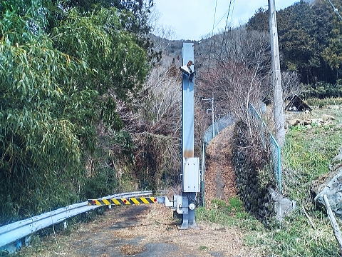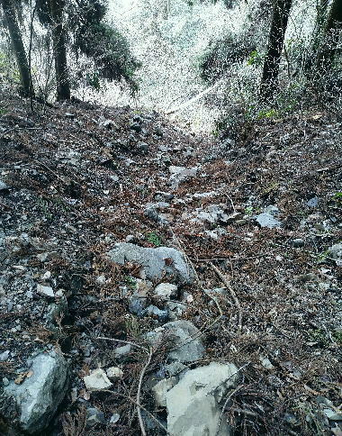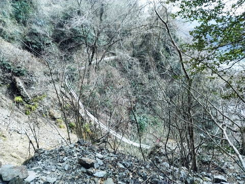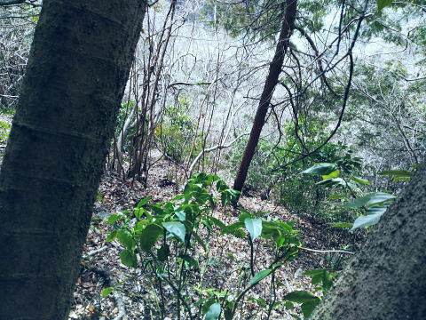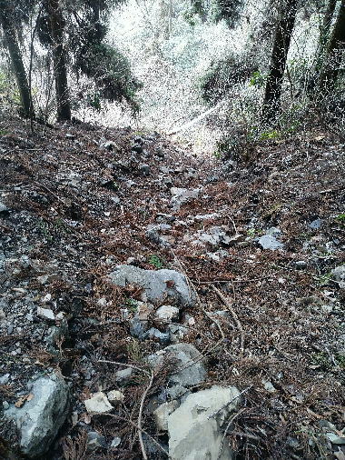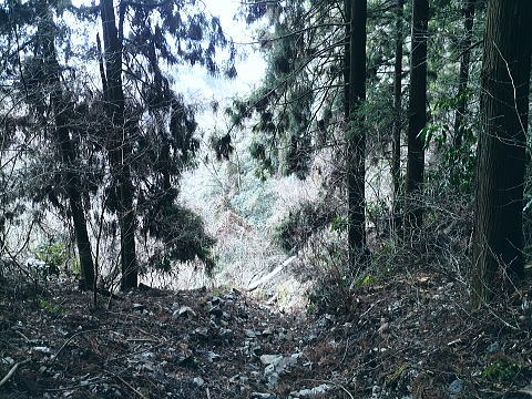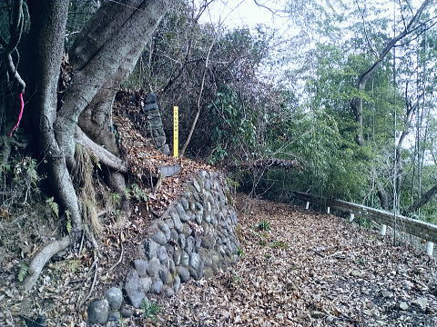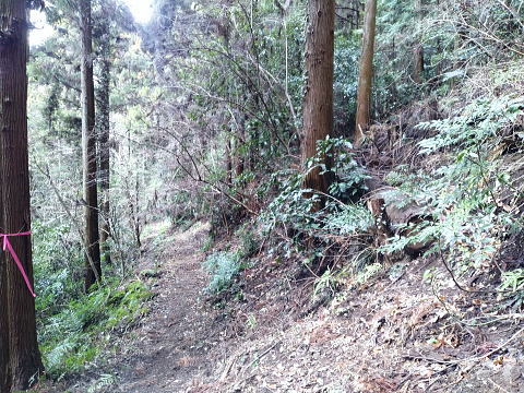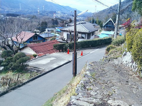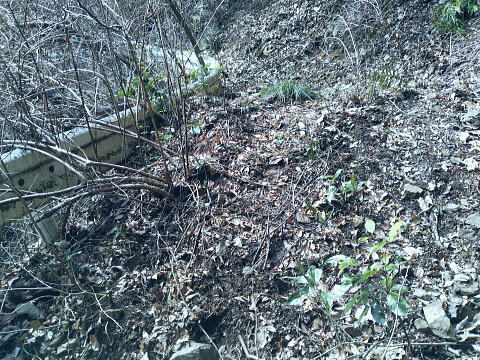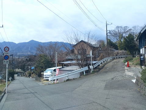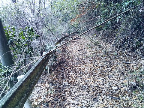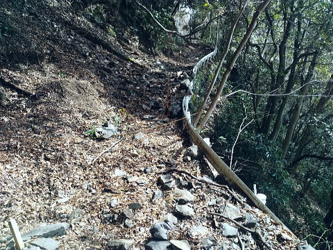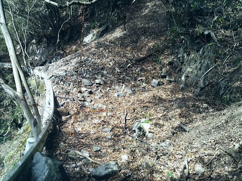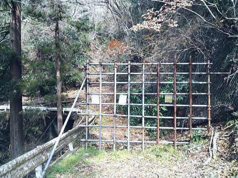 | 金比羅宮から前回の逆側.三井水源林へ中段.下段と向かい名手へ.今日の目的の津久井湖北岸の廃県道515号線に入り.中沢山南西尾根を詰める。 赤馬側の尾根の末端まで進み.中沢山の55号.56号鉄塔尾根から廃鉄塔を過ぎ.頂で八-大線52号鉄塔基部に立つ。 穴沢左岸尾根から三井禅寺より西山峠南尾根 金比羅宮から三井径路を経て名手.廃県道から55号鉄塔・・県道515線 中沢山南東尾根を詰め52号鉄塔 北高尾山稜を南北に横断し中沢川から南浅川 三井水源水平径路の分岐400m圏 前回.金比羅宮へ訪れた逆コースで名手へ下る11:08三井禅寺から金比羅宮にでて中段から更に下段の里.名手に至る.。 中段の分岐を過ぎ下段の経路へ.370m圏初春になり.もう下草が生え始める季節がやってくる。生い茂る樹葉の枝木は先の視界を閉ざしだす。始まるとその勢いは早い。 裸林はアッという間に緑に覆われる。すると根元から枝木は藪絡みが始まり.殆ど手使わずに置かれた山道は藪に覆われる。 そして暑さを増すと共に藪山の御殿が出来上がる。秩父の藪に覆われる旧道歩きも.藪を漕いでも行動は5月の半ばまでになるだろう。 長い水平道の経路.11:23 小さな石片の道標.11:29 里近く小屋の脇を通過 東光寺からの踏み跡道と思われる。封鎖されていた。11:37 県道脇上の細道から東光寺へ 柚子2個を頂いた。小さな固めの柚子は柚子湯に変身.11:42中沢山南西尾根 右上が東光寺南西尾根に建つのは相模湖を渡ってきた新多摩線55号と56号鉄塔。正面の畑を横切る斜面は旧県道にでる東光寺の参道。 東光寺 この右奥にあるのが名手神社.11:46相模川北岸の山々 右景・・東光寺からの津久井湖北面の展望 中景 左景名手の県道.迂回路の分岐 標高200m圏.11:52県道515号線と幅広い湖畔に下る里道の分岐点 県道515号線の分岐 名手では左に折れる広い車道の名手橋を渡る里道と右に直進する狭い県道515号線とを分けている。 この直ぐ先で県道は「通行止」ではなく.廃道化していた。 県道(廃道)は県道とは思えぬ狭い515号線が相模川北岸を綴り.赤馬までは廃道で.迂回路としては桂橋周りがある。 県道は更に柳馬場.宿と綴り.終点の千木良(東海自然歩道の登山口)で国道20号線と結ばれていた。 直ぐ先は栃谷坂沢林道と合わさり.底沢バス停にでている。 今回は右手の旧県道に入り.赤馬にでる手前で中沢山南西尾根を詰め.南高尾山稜に乗る積もりでいる。 手前に三井水源林に入る作業道があるものの.赤馬への湖畔道の県道を探索しながら越えることにした。県道515号線は封鎖されている。 先は突き当たる県道 石階段の参道から県道515線に降りる.手前の「サ三夜」は月待塔と云う民間信仰. 通行止のゲートと並ぶ三井の径路 JPSは使用不能.11:54南高尾山稜から前回下ってきた作業道出口と県道515号線のゲートが並ぶ.。 左側の廃県道は津久井湖北岸(赤馬〜名手間)の右端. 右隣りは昨年.南高尾山稜から藪原を降りてきた。 19号台風 県道はここ名手から赤馬までの間.は2019年の19号台風で.甚大な被害を受け.閉鎖され.今は廃県道化している。 東京近郊の西側山域(神奈川県から埼玉県)に掛けての被害が最も大きくかった。雨台風で河川の被害が膨大だった。 殆ど丹沢.奥多摩は封されて.箱根電鉄や荒川源流地帯の影響も強かった。 更に柵のゲートで塞がれている。右の隙間を回り込む.11:55 沼本ダムの下流側の津久井湖北側沿いの被害は多い。11:56ガードレールを回り込むと道は失われている。 200m圏で津久井湖の野尻側を一度見下ろす.12:00左側の下流側で名手橋を渡れば又野でる。湖畔沿いに.国道413号線が横切る。. ガードレール沿いの沢を渡る前の東側.上へ高巻く.12:04過っては車両が通行していた県道だが落石.崩落に土砂崩れが激しく.抉り落ちる谷間はガードレールが飴のよう崩れ落ちていた。 固定のトラロープ 左は荒れ放題の廃県道と高巻きの迂回地点.12:05ロープあって安心するも.見るからに心細い心境。打つ手なしの丁寧な三点確保が必要。気を抜けば確実に落ちる。止まらず谷底へ。 警察の警告板あり. 綴ってきたガードそいはここまで.12:05ロープは動かぬよう四方の支点に固定されていた。それでもロープが張られているからの安心感はない。 2つ手前の上部を撮った写真から高巻く.12:33 最上部250m圏にでてトラバース.12:33すっきり落とされた窪溝沿いは見た目のなだらかさを持っている。ただ周りのものは落とされた斜面。 緩そうに見えての急斜面 新しく見えるが.19号台風後まで残された赤帽白柱.12:38脇に立木に青いテープが付けら手ていた。この辺はあるか.無いかの浅い踏み跡がのこされている。探しつつトラバースする。 劇斜面で周りにあったものはここでも落とされている..12:43 何方かと上流側の方が安定している。12:43上流側にも固定ロープあり. 沢の高巻き上部.道が完全に流され.ガードレールが空中に浮く凄さ.被害の大きさをも.物語っている。12:46 谷間に流れ込んだ崩落の凄さ。12:50 ガード下を抉り落ちている.12:52 レールが中に浮くのも暫し.12:54固定ロープが
