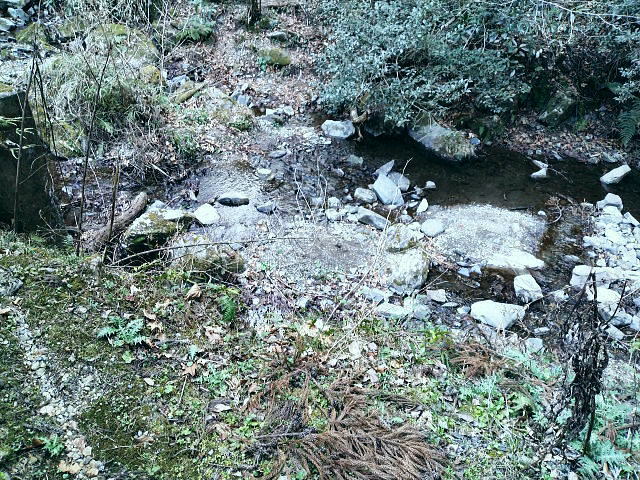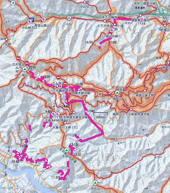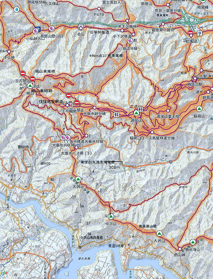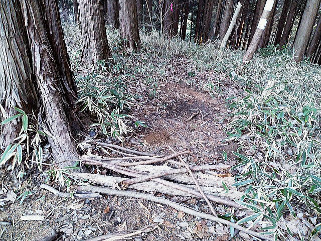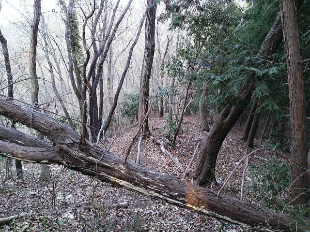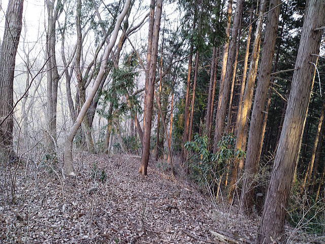 | 城山北東尾根に入り東進し446m点峰東支尾根から日影キャンプ場に下り林道終点にでる。旧甲州街道.日影バス停から小仏川沿いに西浅川へ R20号線.旧大垂水街道から津久井湖の県道515号線.赤馬へ 庚申塚.38号鉄塔を過ぎ南高尾山稜を横切り.4号鉄塔から大垂水林道の案下川支流口 あずさ霊園からR20号線.大平林道起点を経て9号鉄塔. 一丁平から新金網道.城山の東経路を抜け日影林道分岐 城山北東尾根から446m点峰南東コースから日影キャンプ場.林道終点からは小仏川沿いに旧甲州街道を綴り西浅川 小仏城山北東尾根 日影林道を右に分け作業道に入る.630mコブを越し.東京農工大同窓会記念林標識を過ぎ日影乗鞍へ. 日影乗鞍 別名.日影山.日影沢ノ頭.16:00山頂621.0mには図根「石杭一四〇」の標石があり点名は「上長房」.昭和末期の地図には三角点の記号が附いていた。山頂は植林で展望はない。 北尾根を下れば小仏川沿いの浅川神社の境内に降りられる。旧街道を下ると直ぐ小仏バス停があり.隣りがjr高尾変電所。 以前.逆沢作業道から南北に小仏へ横断する積りでいたが.運動不足の疲れがでて諦めた覚えがある。 八王子大月線高尾分岐線11号鉄塔 尾根道を挟んだ北側の分岐鉄塔.16:.04高尾分岐線10号鉄塔 南側の基部は殆ど直線状に建つ分岐南高尾山陵の大洞山 10号鉄塔基部より南面を望む.遠方に望むのは南高尾山稜の大洞山.左脇が金比羅山.だろう。あの裏側の津久井湖々畔を綴る県道515号線から越えてきた。 背陵に出てからは大垂水林道に建つ4号鉄塔を目指し.国道20号に出てからは大平林道を奥高尾縦走路に向かい登り詰めている。 今回は奥高尾縦走路を丁寧に西側に進んでいた。小仏山東径路に入るまでは初めてのコース。 学習の歩道で一丁平に出て.更の東径路の又下側の真新しい伐採地脇で.金網で張りつめた所からの展望はよいが足場は悪い。 日没を考えると時間に気にかかり.途中から東経路にでる為.藪漕ぎを少々している。後は早足気味に日影林道に出ている。 今日の工程を示すような遠望の「1つの風景」だった。 560m圏肩の南尾根 右上は日影林道へ下る作業道.16:13下った日影沢の対岸が逆沢作業道の下り口.作業道の標柱が立つ. 通行止めの横枝あり.白沢の対岸は逆沢作業道の下り口になる。 御料林三角点 446m地点の御料林三角点から東尾根を延ばす.16:27東尾根の取付き 446mコブ東尾根の取付き口.16:28日影キャンプ場の炊事場の裏に降りる. 尾根筋を直進し.左の山腹道へ.16:30東尾根上を下り.途中で左山腹を平行して下り日影キャンプ場にでる。 巻道と合流.16:33 立木に付けられた道標.16:36高尾山北尾根の西面 右奥の谷間に(いろはの森コース).16:42 キャンプ場の炊事場辺りの白沢に降りる.16:46白沢の流れ 白沢を右岸に渡渉.16:57 日影沢キャンプ場 日影沢キャンプ場.16:49いろはの森コース 取付きは蛇滝林道のゲートの裏.16:50日影沢 小仏山東尾根末端の取付き渡渉地点.16:57旧街道と接する日影林道終点 右側はカツラ林の旧遊歩道.17:01木下沢出合 小仏川に流れ込む木下沢との出合.17:03旧甲州街道の日影バス停脇を潜る木下沢と小仏川. 終えて 初めと終わり.そして道中の中程でも国道20号と繋がれていた。出だしは大垂水峠から旧国道で津久井湖々畔の赤馬へ下り.南高尾山稜を詰めて. 大垂水林道から案下川の支流沿いに国道2.にでる。そして改めて大平林道の起点から奥高尾縦走路.学習の歩道を歩み.一丁平園地へ。 城山の北東経路に入る前で真新しい伐採地縁の金網道を見付け辿っている。城山北東尾根からは日影キャンプ場に降りていた。 これらの繋ぎは県道.経路.鉄塔尾根などを利用している。それも又短いながら私にとっては楽しめる行程に一つだった。予定では更に日影沢林道の 三本杉に寄り.蛇滝への北東枝尾根を下る積りでいた。ただ日没の時間切れで諦め.小仏川沿いに旧甲州街道を歩み西浅川から下山した。 旧街道の日影バス停着.17:04次のバスの発車は40分近くある。丁度日没を迎えるが.夕暮れを迎えても冷え込みもないシャツ姿。丁度行動し易い気候で助かっていた。 路線バスの旧街道をjr高尾駅に向かい歩む。今日は入山も.下山も甲州街道と因縁ある旧道を歩み通して来た。 そう云えば繋ぎの道中も現甲州街道を歩んでいる。林道を繋ぎ.JRの鉄塔繋群をぎ.西浅川交差点からは中央本線の沿線からjr高尾駅にでた。 最後も旧甲州街道(都道516号線 )を歩き終えることになった。 旧街道の街並み 陽光は山陰に落ち.洛陽を迎える.17:21城山小仏峠 浅川相模湖線の小仏峠付近の2.7kmは浅川相模湖線の点線都道516号線と県道516号線とで繋ぎ.古くから甲州古道と云われていた。 明治21年に現在の国道20号線が南側の大垂水峠を経由するルートに付け替えられるまで東京と山梨を結ぶ幹線道路だった。 八王子側の点線県道終端は通行止めの柵の先に「ヤゴ沢作業道」が接続している。小仏峠まで徒歩で1.2km.高低差180m。 相模原市側の点線県道終端を経て「底沢バス停」まで.1時間ほど。底沢バス停から県道516号浅川相模湖線の点線
