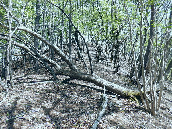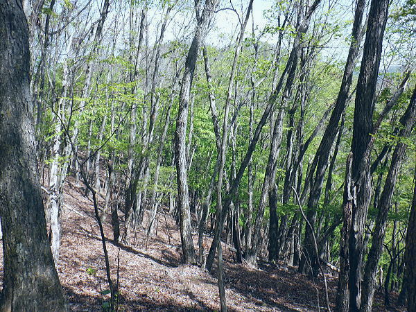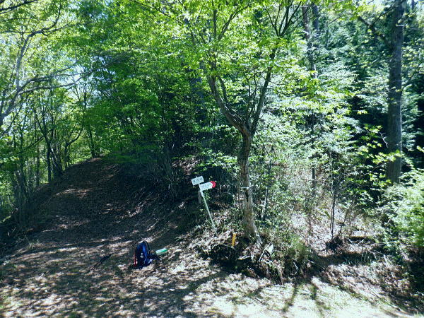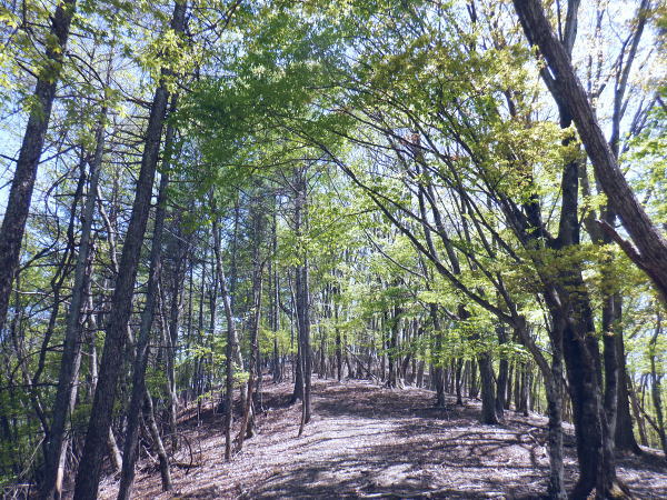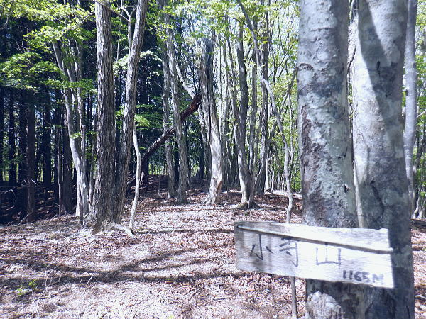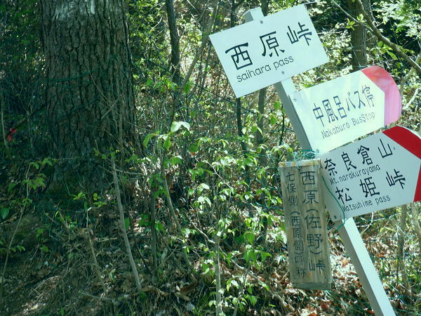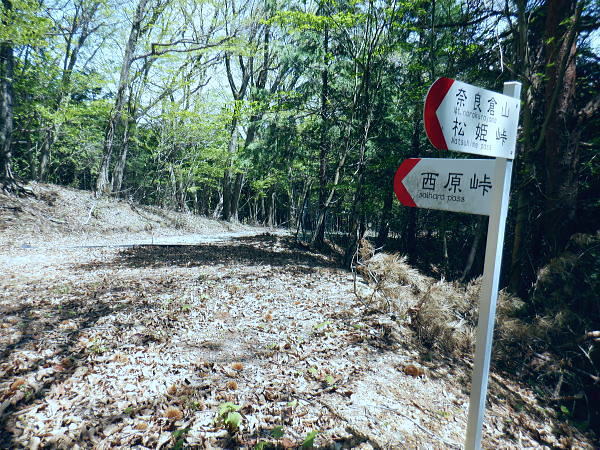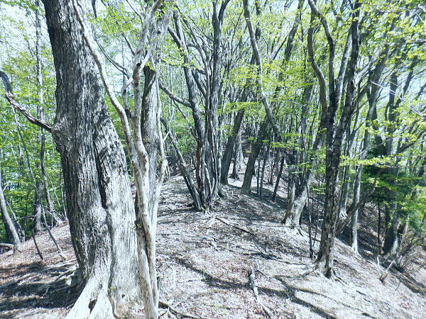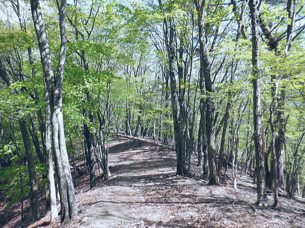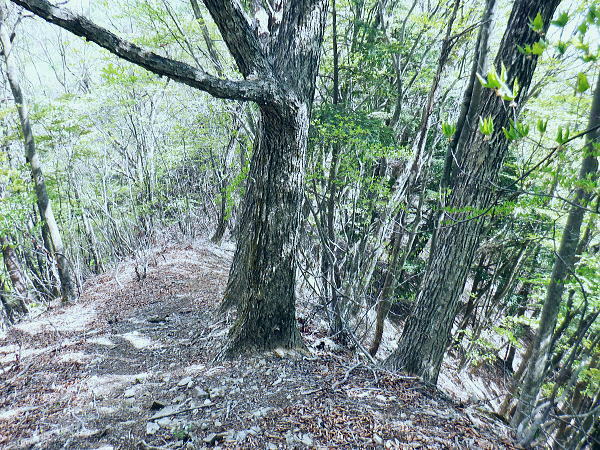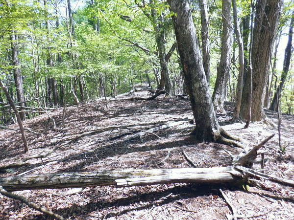西原峠 標高1040.0m.佐野峠.小佐野峠.12:47「甲斐の山山」小林経雄著によると西原峠は七保側の呼称.佐野峠は西原川の呼称. 飯尾辺りの男衆はこの峠を越えて. 大月まで日帰りで用足しに出掛けたとのこと。 先に進むに林道はここからは今日は禁物。駅まで歩むに時間にゆとりが無くなるのを恐れている。 迷い道を失う恐れあり.少し我慢すれば分岐らしき所にでて.右に折れれば尾根道にでる。 ここからは踏み跡の山歩きを楽しまなければ.私には時間が尊く.最初から敬遠している。 ここまで時間を制約した分は後半の行程の為で.この先.里に下りても最終バスに間に合いだろう。林道を分け.道標裏の山道に入る。 最初の計画では15時台のバスは到底無理になった為.猿橋まで歩む積りでいたものの諦めていたが その分.歩き疲れたら最終バスに拾って貰うほうへ軌道修正する。里道も出来るだけ歩きたい気持ちを持っている。 権現山稜と三ッ森北峰 笹尾根の大沢ノ頭からの展望・・2022.06.3/12:47当時.霞むも前回より展望は良かった。大沢ノ頭に立ち.左脇の樹間の切れ目から南面の展望. 大寺山尾名手尾根と坪山東尾根. 遠方に朧すぎるのは道志の主稜と赤鞍ケ岳か? ただ富嶽は望めず。 当時は鶴川の飯尾から南秋川の数馬へと三頭山笹尾根の東南に面した鉢指沢ノ頭東尾根に連ねる幾つもの尾根を綴る。 大沢ノ頭大茅南尾根から鉢指沢ノ頭東尾根.井戸入右岸尾根から伐採地に入り.奥多摩周遊道から旧道へ降りている。 この時の山行の第一ポイントは伐採地の山をを写した「一枚の写真」を見て.自分の目で見たいと登った山行だった。 三ッ森北峰と鋸尾根 西原峠の切り開きからの眺め.1.2:47北峰を越えての背は尾名手峠.古山名標が立つ峰.麻生山1267.5mと麻生山分岐(東峰?)で南西に延びる長尾根.駒止嶺から里は富岡へ降りている。 左下は小寺山西尾根。左脇中段の枠外に大寺山が聳える。右へ大ダルミを越えての1200m点峰.痩せ尾根を詰め北峰へ。 西原峠 分岐より尾根上の山道に入る.12:48西原峠は七保側の呼称.佐野峠は西腹側の呼称。飯能あたりの男衆はこの峠を越え.大月まで日帰りで用足しに行ったとここと。「甲斐の山山」より. 地形図の破線路が峠路を横断し.右手の尾根伝いには七保町瀬戸.中風呂へ下りている。過って宿った松姫鉱泉から翌日百蔵山を越えている。 直ぐ左脇と云うより.直進する林道の右脇に西原峠の分岐があり.道標類が連なり目立つ所。林道を進めば藪絡みの所もあるが二又にでて.右上を選べば稜にでる。 古寺山手前では背陵と林道? が合わさるようなり頂に立っている。私の空白地帯は西原峠から大寺山の間になり.以前尾名手尾根側へは降りている。 逆側の左.北側の谷沿いを阿寺沢川沿いに林道を下ると阿寺沢集落に下りられる。 又初戸からの腰掛林道とも繋がり.阿寺沢からは檜原街道のバス停「阿寺沢入口」があった。 中風呂へ分ける破線路.12:49立木に「中風呂」の道標が付けられているが真横から撮っている。支えの杭は「鹿の骨」らしい。 林道の道標.裏手から藪絡む山道へ.12::51左脇に延びる林道はここまでで分けている。藪絡みの踏み跡.作業道に入る。 改めて尾根伝いの踏み跡へ 取付きの藪ジャングルを抜ける.12::54 作業道と現れた境界見出標.12:57 枯葉は吹き飛ばされている.13:00 明るい木洩れ日の背稜を進む.13:03 切り開きは林道? 13:07西原山 茂みの低山.西原山を通過.13:12西原峠から最初の小コブと云うより高みの広場.に。「西原山」と私製の山名標が掲げられていた。 1120m圏の平尾根.13:13 背稜を綴る林道らしからぬ道.13:15地形図では北山腹の980m圏の中腹を並行して林道が綴られているが? 13:17左前方北側を綴る林道? 林道は北側山腹を離れて並行.13:20小寺山へ続く北側の林道は樹林jに覆われ.見渡すことはなかった。 小広い植林に被われた頂は小寺山1165m点 林道と合わさる山頂.13:28午後.薄日が差すもおぼろで霞み気味の大寺山と三ッ森 小寺山より南東方面.13:30小寺山1165m 北尾根に続く小広い頂.13:31 1150m圏.大寺山へ.13:32この辺で林道跡が合わさっている模様だが分らず。後は大寺山の手前で見かけたかも。確信は持てず過ぎ去っている。 頂からは背稜を歩む.13:401200圏小コブあたり 小コブを通過.13:44 1200m圏.大寺山真近.13:46小コブを越えた鞍部の北側から林道が現れる。この林道も以外と幅広く.起伏の少ない簡素な雰囲気。 最初は見下ろしていたが.林道を綴ってみると大寺山の頂.平坦な北側脇を東側に回り込む形で失われていた。 大寺山直下の倒木.3:49その南側の頂きに立つ。否や着いた感じで道標に着く。 権現山から奈良倉山に至る葛野川左岸の背稜 笹尾根.槇寄山の頂より・・2008.03.28/12:05重く霞む相模川水系の鶴川を足元に権現山稜の各々の北支尾根を眺める。 遠くに霞む富岳の手前こコブは三ノ森北峰.逆の南側に鋸尾根を落としている。 大寺山1226m 展望はない.13:51右正面が大寺山尾名手尾根と右下は権現山北尾根を挟む尾名手沢。以前初戸から腰掛林道を綴り.尾名手沢を取り囲む尾根を綴