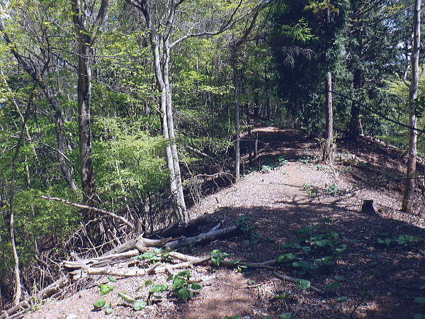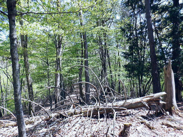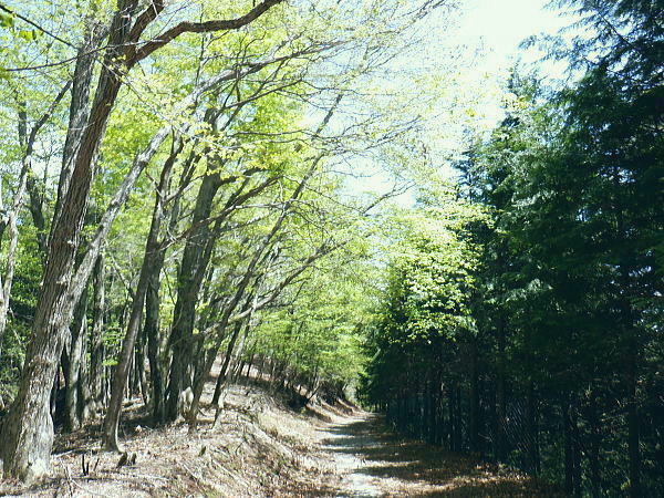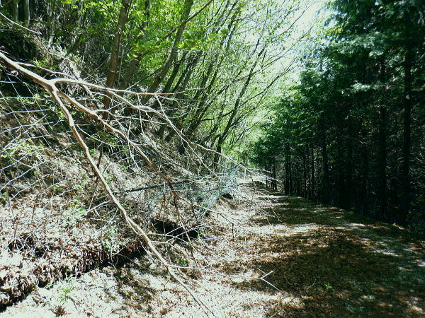 | 奈良倉山から続く山上林道を歩み.佐野峠から佐野山.坪山への尾根の分岐を過ぎると阿寺沢川への林道を分けている。 西原峠からは尾根筋の北側に回り込む林道を分け尾根伝いに入る。地図の破線では小寺山.大寺山付近まで北側に記されているようだった。 小菅鶴峠から葛野川左岸尾根.奈良倉山と佐野峠 佐野山.西原峠から小寺山.大寺山・・西原峠か林道を分け背稜へ 大寺山からは閉ざされた登山道から三ノ森北峰へ 鋸尾根を下り小姓の里 三角点佐野山1234.7m コブの左脇を回り込む佐野山の道標.12:27佐野山からの林道は背稜伝いから南側のヘチを回り込みながら西原峠に出る。林道の幅は途切れることなく広く.周りは伐採地。 山名不明(佐野峠近くの三等三角点峰)点名「竹の沢」.1234.56m 12:28 林道へ.12:29左の茂みの奥が小佐野峠 坪山の分岐.12:33 12:34尾根筋の樹林が育ち.南側の眺めはまるっきり失われている。以前は林道の右肩は季節にもよるだろうが.南側の葛野川流域の展望が素晴らしかった。 特に足元は鹿網に遮られているものの葛野川の流れを真下に見下ろしてもいた。 ・・道志.富嶽を背に葛野川中流流域の展望 林道の両脇は鹿網.12:39旧佐野峠 左に坪山への分岐尾根を分けている。手前には1170m圏コブがあり.二又に分ける北尾根を派生させている。旧登山道であり.旧道. 越えれば坪山.三等三角点標石.点名「坪谷」.標高1102.7mへと尾根が延びる尾根。 上野原のバスターミナルで頂いた「うえのはらハイキングマップ」によると「坪山は西尾根がお勧めです。これからの季節. 山頂までの登りはミツバツツジ.ヒカゲツヅジ.イワウチワ.イワカガミなど山の顔といえる花々の群生地が次々に登場。 復路は豊かな広葉や不思議な形をした木々を愛いでながら・・」とある。 後の企画では坪山を西尾根から東尾根へ下り.槙寄山南東尾根から笹尾根を横切り.南沢中間の北尾根を下るコースが未踏で残されている。 残された未踏図は数多く残され過ぎ.消化し切れず.今の自分には不安を抱かすと諦める方が多い。技術的なものもあるが一番は時間の問題。 体力面からの時間が短すぎている。最近.自分でも分る周りの方の手助けも多く感じるようなった。少なくとも後1年半は頑張られば。 その数分先が共に地形図に記されている南側からの分岐点. 確りした道で.昔は背稜との角に旧登山道へ下る立派な道標が立てられていた。 今は失われていた。又本林道を直進し南下すれば直ぐ西原峠にでられる。以前は西原峠までピストンし.佐野峠のハイキングコースの右又尾根を降っている。 末端の鶴川は渡渉した。左又尾根には橋が架かっていたのを確認していた。 旧佐野峠を過ぎると西原峠までの間は右手の葛野川左岸沿いから下流に掛けての展望は15年振りに訪れると全く見られなくなっていた。 当時.右岸.左岸の山へと歩む続けていた国道で松姫峠を越えている。 正面奥が北峰鋸尾根.1129m峰. 今年造られた真新しい鹿棚.2009.11.15/113:32坪谷方面に入る小径前で.道標は更に下ると左に林道を分け.その角に細い旧登山口があった。 食後直ぐ.10mも離れていない場所で踏み跡の取付きを見付けている。判ると判っていても,見付ければホッとするもの。 気持ちを大らかな気分でいても.あるものがないと小さな不安が付きまとう。焦りが一番怖い。・・柵の右側が植林された上部の写真.