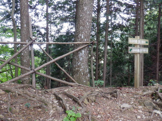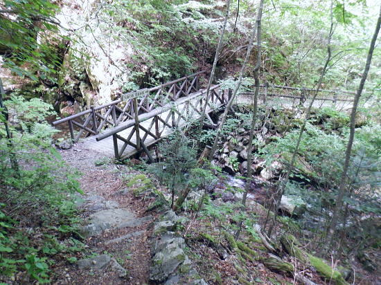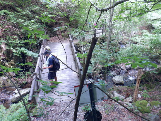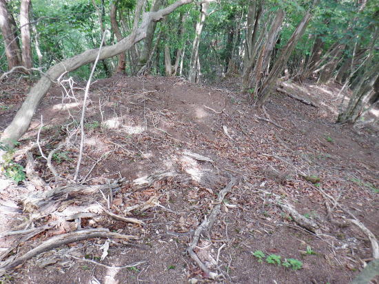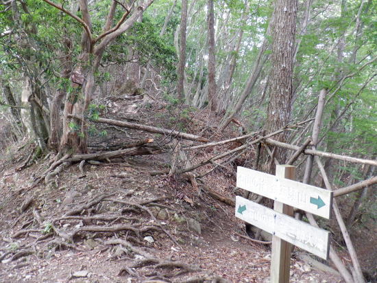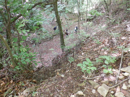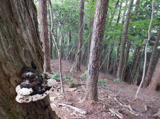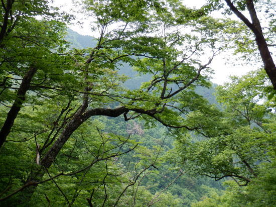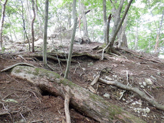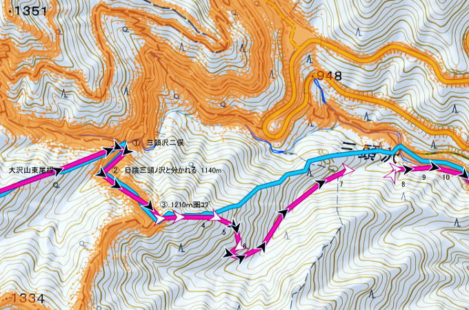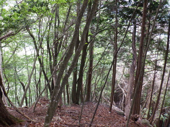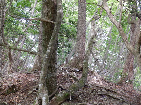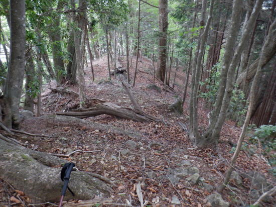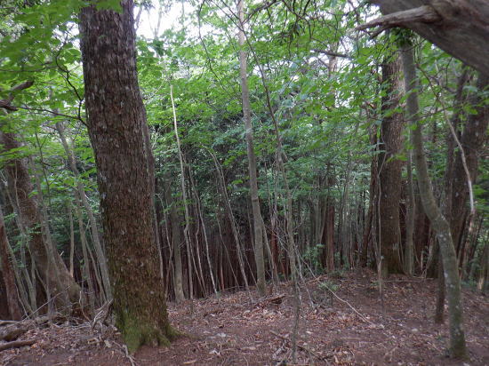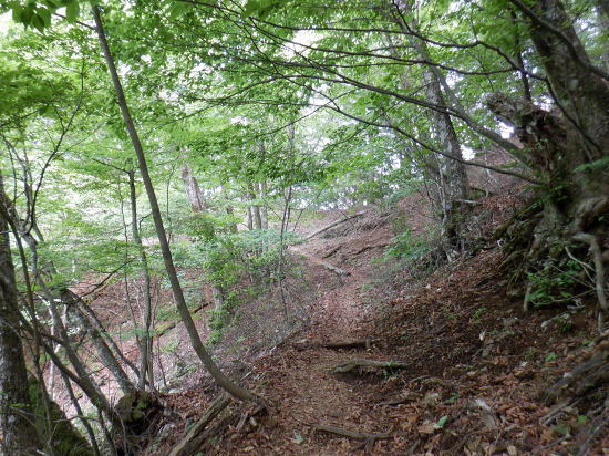 | 「石山ノ路」の1210m圏小コブ東尾根に乗り.1150m圏二又で南東の浅い小尾根を選び.六四郎沢流域の作業道に入る。 鶴峠からハイマゼ尾根.三頭山西尾根から西峰・・縦走 西峰から笹尾根の大沢ノ頭東尾根を下り末端へ 左俣を詰め中段1210m圏コブ東尾根に乗り.1150m圏で南東尾根へ 六四郎沢沿いに「深山ノ路」を横切り.右岸尾根から三頭沢遊歩道 三頭沢二俣下流右岸沿いの六四郎沢流域 三頭橋から1210m圏東尾根へ六四郎沢右岸尾根から三頭沢遊歩道にでる。コースは1210m圏東尾根の1150m圏から北東側の浅い尾根に分かれると.石堰の長い作業道に出合う。 其の儘左右に探索し沢沿いから少し.右岸尾根に乗っている。ここは思えぬ三頭沢右岸の擁壁の高みに出ていた。 ガリーを這い降り.三頭沢を左岸に渡渉し.三頭沢遊歩道にでて.①~➉へと図上を綴る。 ①大沢山東尾根(日蔭三頭ノ沢左岸尾根)の尾根末端と三頭沢二俣 左俣の「石山の路」に入り振り返る. 右俣の右上が日傭小屋ノ窪. 左上が日蔭三頭ノ沢. 右下が二俣下の三頭沢本流で直ぐ下の三頭大滝へと続く。 ①日陰三頭ノ沢 三頭橋.14:12②日陰三頭ノ沢< 日陰三頭ノ沢.1左俣の出合から左岸道を遡り.右岸の小沢との出合940m圏で石伝いに右岸の高みに入る.14:16 沢底から南側の高みの尾根へ.14:26左俣の「石山ノ路.深い山ノ路」からハチザス沢ノ頭東尾根に乗る熊倉山方面へ.今度は登り返して.中段に至る。 14:30③中段の尾根越し肩 直ぐ奥の肩が1210m圏の小コブ.14:32「深山ノ路」への通行止めの木柵のようだ。ここから「深山ノ路流域は全面的に通行止めになっている。 柵脇の道標は熊倉山を越え.笹尾根のハチザス沢ノ頭へ.背は大沢山東尾根 中段の尾根から振り返る.14:34日陰三頭ノ沢を隔てて.下ってきた大沢ノ頭東尾根を登り返している。 中段から小コブへ.14:34③1210m圏の小コブ 直ぐ脇の小コブ.14:37 小広い小コブの台地から東側へ下降.14:38砥山(戸沢ノ頭)1302m 鞘口峠~風張峠間・・2022.06.03/15:05過ってハチザス沢ノ頭東尾根の「深山ノ路」の分岐点下からの展望 2022年6月に大沢ノ頭大茅南尾根を登り.鉢指沢ノ頭東尾根から井戸入右岸尾根の伐採地に入り.奥多摩周遊道から旧道に降りている。 その折.「深山ノ路」分岐を過ぎ1050m圏の台地から撮影する。 写真の下側に横切るのが.今日途中まで下った1210m圏コブ東尾根.前面の谷間は六四郎沢になる。 右下に横切る奥多摩周遊道路は左上の標高948m点から大きくUターンして.砥山(の中腹を回り込み淺間Pへと続く。 1210m圏の小コブ 東肩から右回りで左奥へと尾根を急下降する.14:391210m圏コブ東尾根 ほぼ1本道の尾根伝いのルート.14:40この尾根は「奥多摩 尾根歩き」氏によると「名の付けられない尾根」になる。 左奥へ下り.尾根の左縁の方がガレ落ちている急斜面.14:42 尾根自体は全体的に穏やかな起伏が続く.14:43 のびのび足の延びる尾根歩き.14:49 14:46⓺尾根分岐・・ 北東に延びるのが東尾根のメーン 直進する東尾根の分岐.14:501210m圏コブ東尾根 分岐の右寄りの東面の台地広場にでている。左方が東尾根方向。 東尾根は北側のヘチ沿いを一直線に下り.「深山ノ路」から950m圏の小さな小さなコブを越え.尾根末端は三頭沢の散策を(旧登山道)にでる。 六四郎沢の右岸沿いの尾根筋で.三頭沢との出合には旧々2つの橋が架かっている。 右に少し離れた短な南西尾根に乗る.14:50 左右に大らかに窪む斜面の右方の緩やかな尾根に入る。そして南斜面に回り込み急勾配を斜下した。 下ると直ぐ右手の広い河原状の斜面が広く開かれている。左手の尾根とは対照的な地形に。 10分ほど左右どちらの斜面を選べはよいか迷う。本来は当然.左端の尾根筋を選ぶところ忘れて 鶴峠からハイマゼ尾根.三頭山西尾根から西峰・・縦走 西峰から笹尾根の大沢ノ頭東尾根を下り末端へ 左俣を詰め中段1210m圏コブ東尾根に乗り.1150m圏で南東尾根へ 六四郎沢沿いに「深山ノ路」を横切り.右岸尾根から三頭沢遊歩道 |