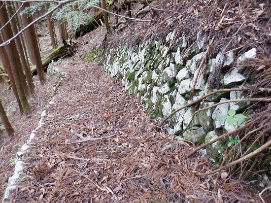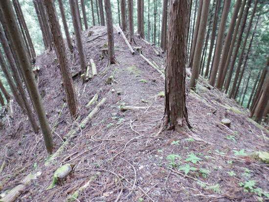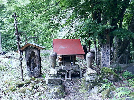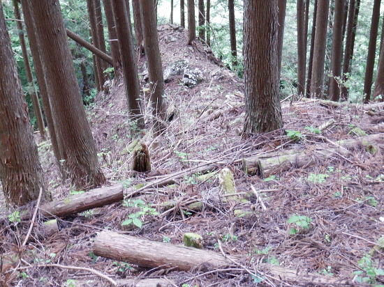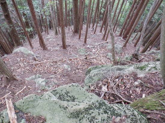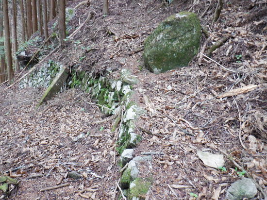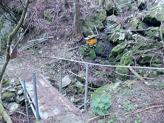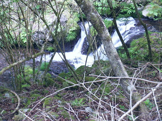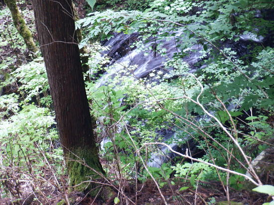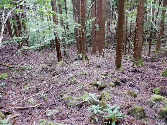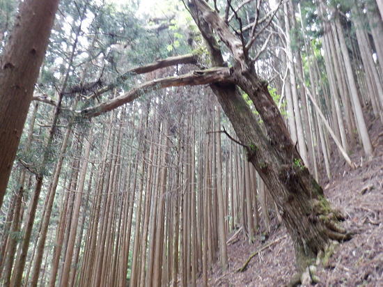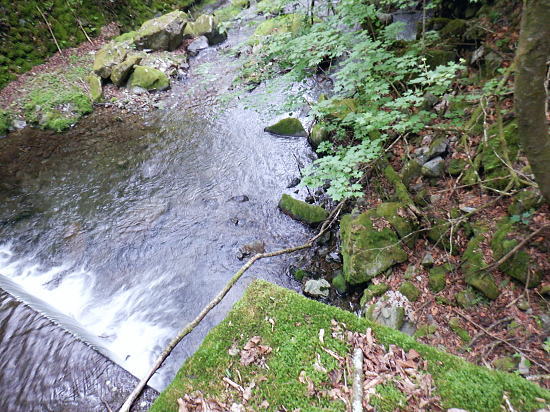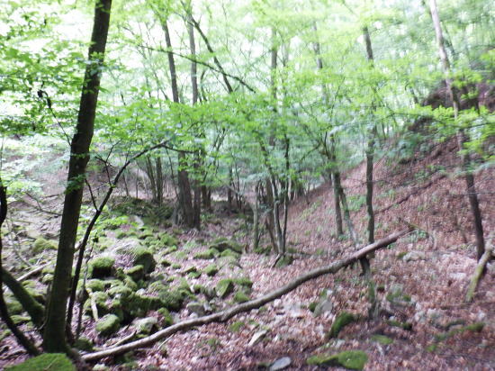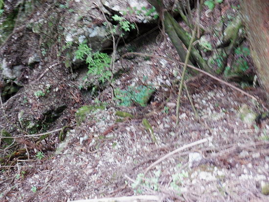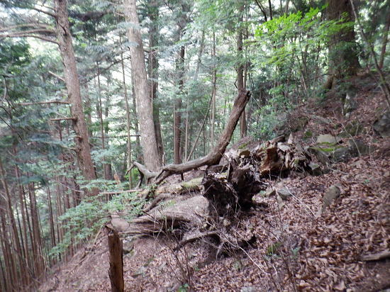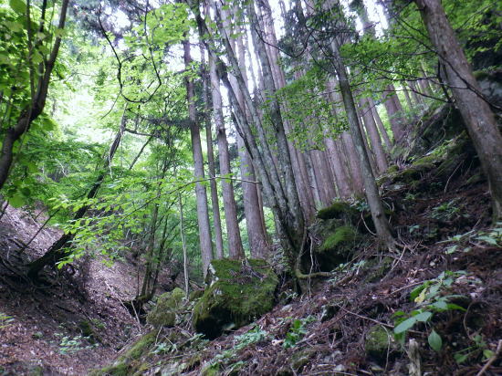 | 新たに造られた経路を横断し六四郎沢を下る。「深山の路」を横切り.四郎沢右岸尾根の末端から三頭沢を渡渉. ・・都民の森の旧登山道にでてからは三頭沢遊歩道から旧道.檜原街道と上数馬 鶴峠からハイマゼ尾根.三頭山西尾根から西峰・・縦走 西峰から笹尾根の大沢ノ頭東尾根を下り末端へ 左俣を詰め中段1210m圏コブ東尾根に乗り.南東へ1150m分岐に入る 六四郎沢沿いに「深山ノ路」を横切り.右岸尾根から三頭沢遊歩道・・数馬温泉.数馬bs・・急行路線バス 1210m圏東尾根・・下部で「深山ノ路」は尾根と沢底で横切っている。 「深山ノ路」の分岐尾根を越え.左に六四郎沢を見下ろすハチザス沢ノ頭東尾根から「深山ノ路」分岐を過ぎ・・2022年6月03/15:00撮影 「深山ノ路」 ハチザス沢ノ頭東尾根の半ば辺りで熊倉山を越え.「石山ノ路」の分岐を過ぎると「深山ノ路」に入る。 その先.1149m点コブの手前肩から北東に派生する枝尾根と分岐している。その尾根の「深山ノ路」を横切り降りる。 この尾根の末端は六四郎沢に没し.「深山ノ路」から更に1210m圏東尾根を標高950m圏で越している。「深山ノ路」は今だ全面通行止め。 ?南西尾根分岐点 尾根二又の南東尾根の取り付き.14:501500m その下の急斜面の広がりを下降.14:52D1200m圏 「え!」と思う劇斜面を下る.15:03 扇状に一線を引く斜面から右下へ.15:06 1070mm圏の「立入禁止」の板.15:09突然.目の前に真新しく石垣で築かれた立派な作業道が現れる。工事中を含めての看板か? 左岸の石垣山腹道へ.15:09左岸の伏流する沢沿いに水平の作業道が造られていた。道幅も山道と云うより.林道の造り方。 距離はどの位長いのかは見た目では分らぬほど。六四郎沢の北面をほぼ水平に繋ぐ山腹道で.まだ地図には記されていなかっつた。 左右に往復し作業道を探索する.15:12E突然立派過ぎる作業道が出現 1500m圏での水平道で河川の傾斜とは異なる.15:16最初は右.西側を歩み.歩けば歩くほど水平の為.六四郎沢の沢筋が上がってくるのを知り.苦笑いしている。 慌てて最終的には左へ水平道を取る。そして時間の計算は出来鳴きなったが六四郎沢の沢底に下るのとにした。 ?の次. 六四郎沢の沢底 六四郎沢に入り伏流した河原状を下る.15:21やや大き目の丸石に敷き絞められた苔付くゴーロ状の沢底は歩き難し.又少しずつ沢幅は狭まりだしていた。 逆に沢を遡ればハチザス沢ノ頭東尾根に聳える熊倉山1334mを源としている。 先はまだ足元を選んぶ余裕はあるが歩き難し.15:31 まだ伏流し右寄りに(南側)の河原沿いへ下る。5:31左上が「深山の路」の950m圏の小コブ辺り F六四郎沢940m圏付近 「深山ノ路)付近は流水する.15:38 傾斜は更に緩やかな左山腹に並行するよう下っている。下る先の方向を先を見失うも歩き易く快適になっている。 谷間は狭まり始め.以外にもここにきて.見上げると平凡さは失われ.深山に入った気を起こさせていた。沢沿いは少し上龍側では伏流していた。 この先は歩き易い右岸沿いに入っている。。迷いと云うより.下る方向は間違いない。自然の成り行きで右岸に回り込む。 今日一番の六四郎沢の美景 940m圏の「深山の路」付近.15:38後に思えば左岸沿いに下る方が難に感じたが三頭沢の本流を渡ることを考えると左岸の方がよかったかも。 増水時は無理だし.側壁も短いが嫌らしい所を越えてもいた。 「深山の路」の破線路 1210m圏東尾根の「深山の路」横切る北側の突き出しの950m圏小コブは通過する予定だった。私が横切るここ沢底の標高は. 940m圏を通過している。高度的には東尾根上の標高と六四郎沢の流心の高さは殆ど変わらなかった。通過して知る。 以外と長い沢沿いの石垣作業道はほぼ左右に水平で造られ偵察を繰り返した後.戻ればよいものの沢底に降りてしまっていた。 やや大き目の苔付く丸石のゴーロ帯。バランスを取りながら下るのは体力の消耗が甚だしかった。楽そうな所を選び下るも滑りがち。 右岸や左岸沿いに蛇行して下るも.傾斜が増すと共に.楽な六四郎沢の右岸沿いに入ってしまっていた。それは後から思うと不思議な連想を起こし.よかったかも。 水平道は急角度で下る沢底との落差が顕著に現れると知らずして.先への地形が異なり落差の大きさにも驚かされている。 右岸の高みに取り付くという意味の言葉でなく.脇上へ少し綴ると見る間に沢底との落差が大きく驚かされていた。距離はないが深みで見下ろされていた。 G六四郎沢右岸尾根 急に右岸の高みに乗る.15:51正面に突き出した鼻のような先で.更に右に突き出すの先端の一段低い所に降り.裏側の土壁に足場を固めながら降りている。 こんな所に踏み跡が築かれていた。一見驚き分からぬ場所によいルートが築かれていた。ここは足場をを自ら築きながら降りるルート。 900m圏.既に見下ろす高みにいた.15:52枝尾根の左側は六四郎沢寄りになり.右側は三頭沢の右岸側。 台地の肩と云うか.等高線が三頭沢本流沿いに狭まり.急激に高度を落としている。六四郎沢の出合を前にしての地形。 20分ほど前は自然豊かな樹林