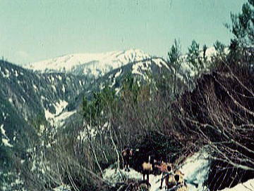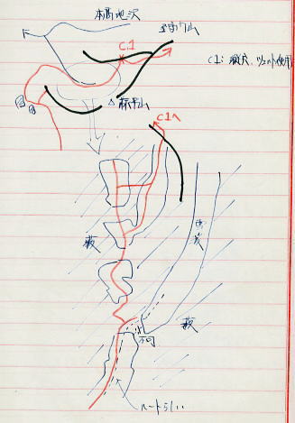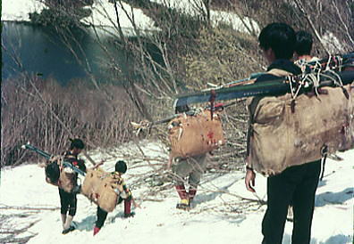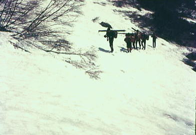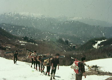 | 越後守門山.ツァーならぬ藪山登山 s44年(1969年)05月02〜06日 L斎藤sL冨田(3)m飯.島田.遠藤.中西(2)新津(40卒)松村(43卒) 只見線入広瀬駅―大沼―1040m地点 1040m地点から藤平山―1160m地点 1160m地点⇔守門山.―大白川駅=小出 守門 越後三山.中岳から北に連なる背稜は丸山岳から会津朝日岳へ延びるの尾根を分け.田子倉湖の左から巻き込む形で北上する。 更に先.六十里越に続くのが浅草岳. ここから破間川を隔てた北西対岸に聳えるのが守門山。 独峰的な山として仰がれ.背には庄内平野の広い天空が拡がっている。 守門山は浅草岳から更に八十里峠を越え.右手に県境尾根を隔て.破間川の源流を北側から囲い込むよう連なっている。 並ぶ烏帽子山を越える高峰が守門山。越後国境の分水嶺から続く越後山脈の最も北の高峰になる。 OBとなり初めてのOB総会で今年の連休山行は現役を含めた守門山ツァーが企画され.現役にリーダーを任すことにした。 入山は守門山からの西尾根.藤平山の西川上流の本高地川の枝沢を遡上する。 新緑と残雪を求め.特に頂には広大な雪原と春なお大きな雪庇を張りだし.1537m峰とは思えぬ山容を誇っていた。 リーダーは現役に任せ.新津さん私はオブザーバーの形を取った。ただ現地に入ると思いの外.積雪は少なかった。 長閑な雪豊かな尾根の手前には厳しいルートファンテングが要求されていた。 尾根筋から谷間に残雪を求め.その雪渓を詰め藪漕ぎを繰り返し.頂の尾根へと藪にツァールートを求めている。 只見線入広瀬―大沼藤―平山―青雪岳尾根1160m地点⇔守門山.―大白川 5月02日晴 上野上越線13:15=18:30小出.現役 上野.急行18:12=21:30小出.・・新津.松村.現地で合流泊 仕事を早めに切り上げ.上野駅で新津さんと合流し急行「佐度5号」に乗り込む。 心配していたストも無事解決.11年振りの連休と相い間って上野駅構内は物凄い人で入り乱れていた。 運よく座席は取れたものの食堂車に移動することさえできず.列車内は身動きする隙間さえ得られなかった。 列車は利根川の狭くなりつつある谷間を抜け.谷間一杯に夕闇が迫ると魚野の田園地帯に入り.帳の落ちる頃小出にでる。 そこには早めに発った現役諸君の顔が宿を決め待ち構えていた。 5月02日. 上野=小出h 3日. 小出h.只見線=入広瀬一大沼一1.040m地点b 4日. c1一藤平山一1160m地点c2⇔守門山. 5日. c2一只見線終点大白川=小出h3 6日. h3=池袋駅解散 国鉄只見線 5月03日快晴 小出駅.只見線:07=6:25入広瀬 始発の只見線に乗るべく早めに宿を発つ。本州で指折りの赤字路線. 只見線は既にダルマストーブに火さえないが汽笛の響きに揺られ.春まだ遅い山間の谷間を遡る。 マッチ箱のような貨車と客車の客貨混合列車.その三両の客車の一両に僕等が陣取っている。 疎らな客に列車はよく揺れた。 只見線の終着駅は今は大白川までだが.数年後には会津線只見駅までの延長工事を終え結ばれる。 越後側の只見線は魚沼の豪雪地帯を走る。客車に強力な暖房が必要な為.冬期限定で蒸気機関車「C11型SL」が復活していた。 谷間の山陰を抜けると朝靄に浮ぶ駒ケ岳.中岳の山稜が車窓から目立つ大きさで望まれた。 行先に朝陽が昇り谷間を明からめ.車内は暖かい陽差しに包まれる。そして眩い陽が僕の顔を照らしだしていた。 守門山南西部概略図 2006.06s43年編集1/5万地図 猿倉橋に立つ案内板より 入山は小出から只見線に乗り入広瀬駅 下山は終点大白川駅になる。 本高地沢→西川→破間川(あぶるまかわ)→魚野川→信濃川 守門山.浅草岳概念図 上祝沢→守門川→破間川 入広瀬一二ノ池一1040m地点 全く残雪の欠片も見当たらぬ入広瀬駅に下車した。 街並を抜けて.破間川(あぶるまかわ)支流の烏川出合を渡ると山村風景が広がる丘陵を遡る。 ![]() 5月3日.快晴 入広瀬6:25一7:10分校前:30一7:35朝食:50一二ノ池上部.偵察11:05一12:15沢.大:55一15:20(1040m地点)c1 入広瀬から望む守門山は遥かに遠いい.強い陽差しが真夏のような登山日和を示している。 入山を前にして今日もどのくらい残雪が解けようか。雪を恋し.まだ見ぬ守門山を思い.田小屋を抜ける。 入広瀬の農村を抜け疎ら過ぎる残り雪に担ぐスキーが似合わない 林道に入り朝食土筆 駅前を抜けた田園は馬鹿陽気に照らされ.スキーを背負う仲間の姿は滑稽に思われる程.暑い。 更に先へ山裾野に入り込むも.雪の残骸は欠片すら全く見られなかった。残雪を溶す陽差しだけが強く照り付けている。 汗が滴る中.シャツの袖を捲くり.時折撫ぜる風が清々しいく心地よい。 水田脇の畔に土筆が大分伸びている。よく見ると陽差しを受けた土筆は薄っすら陽炎が棚引かせている。 一本取り.皆で何かかにならぬかと土から6.7cm顔を出した土筆を摘んだ。 それが悪かった。手間ばかり掛かり.灰で悪を取るが口に入れられる品物ではなかった。 淡白とは云え味はあったものではなかった。夕飯に一品増える処か.私に云えぬ後輩達の苦情の顔が満ちていた。