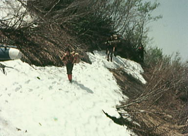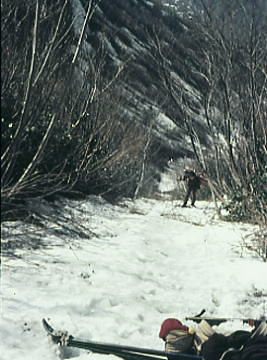 | 守門山南面 , 本高地沢の源流に突き上げる1436m(袴岳)藪山へ 新津氏と私がルートを取るようなる。 北面に入った沢沿いは更に難をひいられた。少ない残雪に沢は口を開けていた。右沢の滝を避け藪にルートを取る。 スキーを外し荷をピストンする。ここは1040mのキャンプT地点まで登山の領域になっている。 ルートの選定と以外な障害物.径はない。裾でも例年ならある筈の雪被る残雪は疎ら。起伏は藪に閉ざされ逃げるよう沢沿いを遡る。 残雪を求め沢底に下りる。これが春山.春ツァーの面白味であり特権でもあるのだが。余りにも残雪が少な過ぎている。 本来は右雪渓がC1まで続いているようだった。 谷間は滝口を開け登行不可.右岸にルートを取れるが.この荷.女子では空身でも危険きわまった。 その為左の藪にルートを取り.切れる雪渓を継ぎながら高度を稼ぐ。 例年より極端に少ない残雪に雪は割れ.滝と藪が変わって顔を出している。 心細い残雪の谷間をその間々詰める。スキー板が邪魔で暫しピストン輸送する破目になった。 只見線入広瀬駅―大沼―1040m地点 1040m地点から藤平山―1160m地点 1160m地点⇔守門山.―大白川駅=小出 |
