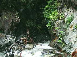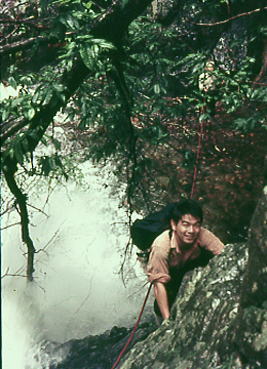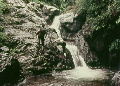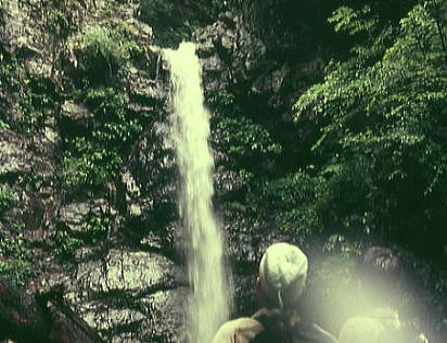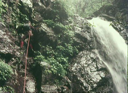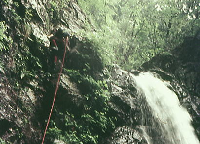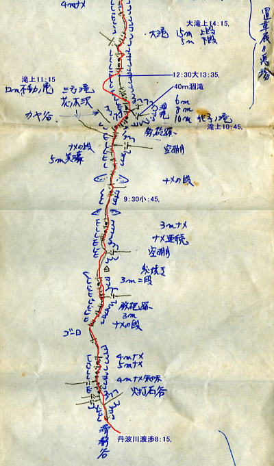| 兆子の滝 兆子ノ滝 アンザイレンし松村.見城.山田の順で滝の右岸を直登する。ホールドは硬く大きいが最後が悪い。 赤土に指を突っ込んでザイルを木に絡ませている。岩壁より濡れた赤土に悩まされていた。 高度感があり岩の隙間に赤土がはび込み.嫌けのさす滝を越えている。 ザイルを緩め一気に乗り越えた。足場が不安定になる。ザイルを潅木に絡め.次ぎに見城先輩を呼ぶ。 緊張した顔が表情を硬直させていた。さぞかし肝を冷やしたことだろう。先輩に笑い顔が戻るも顔は引きずっている。 先輩とは言えザイルさばきは初めて.度胸が居座ってもいた。その上は右岸の太い幹にザイルを絡め通し高巻く。 不動ノ滝 不動ノ滝は険悪そのものだった。 釜はハングを築き見るからに諦めざる得なかった。そして濡れた苔の付着も凄い.一瞬にして登攀意欲は失われている。 ここは一歩たりと踏み出そうとは思えなかった。攀じるべきルートが浮ばず。 滝上には大高巻きを右岸に取っている。置草履ノ悪場に入ったばかりで.これからが大変に思える。 丹波川小常木谷.一ノ瀬川大常木谷ルート略図 出合から置草履ノ悪場.不動ノ滝 源流から岩岳尾根.茅谷尾根・・滑瀞 |