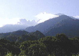 | 馬場島より ゾロメキ(白萩)発電所を右手に望むとその裏が馬場島になる。 室堂乗越に発する立山川と剣岳北方稜線に発した白萩川がここ馬場島で合流し早月川と名を変え日本海に流れ込む。 早月尾根はここを尻留めとし.顎の出るような2200mの高度差で長大な尾根を一気に剣本峰へと突き上げていた。 尾根末端の第1歩は濛々とした樹海の蒸す暑さから始まり,風もなく真夏の陽射しが照り付けていた。 径は迷うことない.確りした踏み跡が1本の尾根筋として約6kの早月尾根を綴り.一歩一歩に高度感がうかがえる。 松尾平を越し一本目.立山川は右手を急なガレを落し.高度800m程で.もう谷間は残雪で埋め尽くされている。 蒸す暑さの中.快いそよ風が時たま流れていた。 東大谷と剣御前.大日岳 |