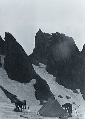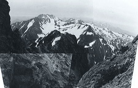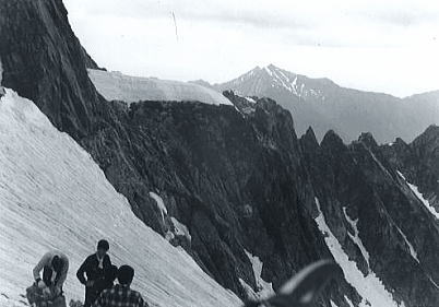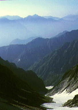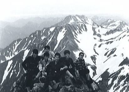| 頂稜 昨夜.万里の天の川を仰いだ為か.思ったより天気は持ちそうだった。 早速.ウグイスの鳴き声に釣られるよう出発する。ここはもう残雪に覆われ.身近に何処手の届く範囲にある。 漸く残雪の岳らしくなった。 池ノ谷の最奥には大きな岩壁が塞ぐよう被い.その間を鋭い溝のような右俣が.長次郎ノ窓まで続いている。 裏側から見る岩山の御殿. 岳々の前衛として連なる屏風の岩壁も.恐ろしいほど垂直な壁で構えている。 今日2本目で高度2600mを越す。視野は東大谷まで広がった。左尾根.三本槍の顕著な岩峰が最後の砦として構えている。 昨日の夜行疲れも取れ.足取りも軽く幾つも頂稜のコブを越し.仲間達は岳々の荘厳さを味わい始めていた。 剣頂稜 中央のカールが剣沢源流になるカニノハサミへ.剣山尾根を越え立山三山.浄土を望む. ラストの登り 剣の頂稜窪地の両岩壁を窓に赤い屋根が目に入る。平蔵の避難小屋.その下に岩峰群と残雪が長い起伏と共に臨まれた。 僕等はその雪渓.長次郎谷の左俣に入り込む。 立山の眺望 目を右に向ければ別山尾根は立山三山へと繋がれ.眺望は更に立山を越えた五色原の彼方まで延びている。 一昨年の夏合宿.立山温泉から入り立山三山を越え.内蔵ノ助平から後立に渡っている。 その折一年生の耳に虫が入るアクシデントが起こり.耳痛を訴え三山を抜けるのに4日を費やしていた。 浄土のコルで幕営していた。短い距離だが転落による食料紛失もあり.苦労させられた山越えだった。 その岳々が豊かな残雪を抱き.眺めていても飽きのこない岳を横たわらしている。 剣岳山頂 |