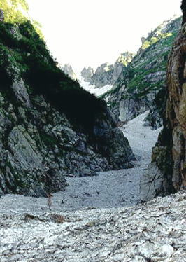 長次郎雪渓左俣下降 ![]() 長次郎雪渓最上部.仰ぐ八ッ峰 長次郎ノ窓からグリセード . |