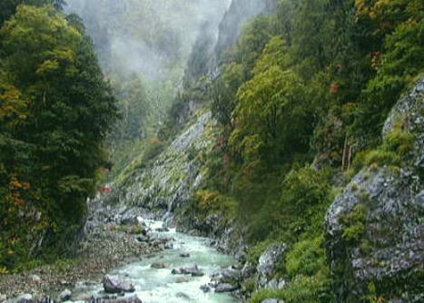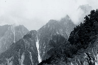 | 真砂沢出合c2. 10:10一11:20枝沢:40一12:35ハシゴ谷乗越13:00一14:00内蔵助平:25一15:15内蔵ノ助谷出合 一15:50御前沢出合c3. ハシゴ谷乗越 10時10分.真砂沢を出発,正規ルートに従いハシゴ乗越まで左岸沿いに行くが.対岸に渡るべくスノーブリッジが脆い。 空身で漸く渡れる程度だった。ザイル使用も考えたが雪渓末端まで戻り右岸へ移動させている。 初めはハシゴ谷出合まで行き剣沢を下る積りだったが.真砂から直接向かうコースを見付け枝沢へ入る。 小雨に冴える若葉が美しい。若葉溢れる色彩が私の周りを被っている。この快感は疲労回復剤にもなっていた。 7月に入ったと云うのに涼しく.盛夏のような汗を垂らし.むんむんする登行はなかった。 剣の頂稜 喉を潤し尾根にでる。階段状の歩き難い径だ。バックの右後方に剣岳が現れる。 深いガスを抜いリッジが現れ八ッ峰らしくなる。手前の壁はマイナーピークだろう。偉く高く聳え立っている。 その隣の源次郎尾根も,前剣東尾根も.雪渓に埋まるよう聳える構図だった。懐かしい風景を一瞬見ている。 剣の頂を見留めるや否や.乳白色のガスに包まれた。灰色の世界に聳え立つ峰々をも消していた。 もうガスだけで剣岳の存在すら分からなくなる。リッジや雪渓は壁のようでだった。鋭い岳だ。 御前沢出合へ 内蔵助雪渓末端内蔵助平 乗越は十字に切っていた。その間々真直ぐ進めば黒部別山にでる。 左.北側への径は今朝登り詰めようとしたハシゴ谷出合よりの古典コース。そして南は内蔵ノ助平にでる。その径を選ぶ。 内蔵助平は時々陽が差し込み明るいカール。霧が又.そのを浮き出していた。 駆け足気味に小径をドンドン下れば内蔵助の濁流に突き当たる。 濁流 丸木橋の渡りはトップが渡るまで.皆.内心転落を恐れていた。 針金と丸太のがっしりした手製の橋であるが.濡れて滑り手掛かりのない裸丸太。 1人りずつ丁寧に渡る。川幅は狭いが跨ぐ足元には凄い濁流が渦を巻き轟音と共に落ちる勢いで流れている。 見るも恐ろしい。支える手は丸太を抱くよう時間を掛け.ゆっくりゆっくり渡った。 対岸で一本取る。 ほっとした安堵に.朝沸かしてきた紅茶を飲む。ホドホドに冷え美味かった。 濁流 内蔵助谷の激流を追うよう右岸の径を歩み.黒部川下廊下に入る。 出合近く,沢幅もグンと広がり勢いは更に強く.鉄砲水の流れの如く大岩や倒木を巻き込み.桁違いの濁流となり押し寄せていた。 轟音を響かせ唸る沢 梅雨期.最後の集中豪雨.初めて見る土石流の圧巻が近ずけぬ凄まじさで渦を巻き襲ってくる。 沢幅を冥一杯に塞ぐ濁流は両岸を削り.地響きを轟かしている。風圧が耳中まで入り込み,その勢いは壁でも崩してまいそうな勢いだ。 驚異と恐怖を抱かせる自然の営みに.僕は鳥肌を立て唖然と見詰めていた。 内蔵助谷出合.もうダムサイトも近い。 黒部川下廊下.径端で野イチゴを見付けた。可愛い小さな実.見ている内に口へ運んでいた。 甘酸っぱい香りが口の中に膨らみ後に少し渋みが残る。 黒部川下廊下 |