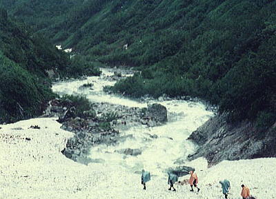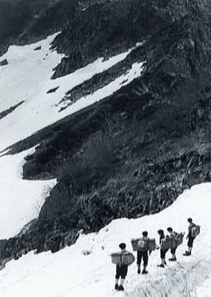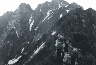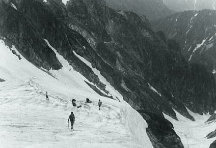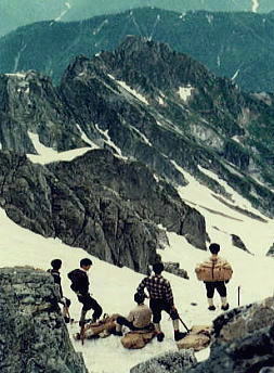 | 熊岩.食後のテント撤収 14:32熊岩二股仮c2. 17:40―19:00剣沢真砂沢出合c2 消灯 テントで日記を付けながら明日の行動を考えていた。 ペンを走らしている時.北陸放送17時.天気予報が耳に入る。 低気圧の影響で九州から中国地方は雨.その前線が北上し北陸を被うとのこと, そして今日夜半.富山地方では平野部で20〜30mm.山間部100mm前後の豪雨に見舞われる。 実際.剣岳で我々は前線の接近を見てきた。そして表日本は梅雨明けとなる。 皆,かなりの疲労が目に見えているがより安全な所へシュラフを飛び出し撤収させた。 ヘッドライトを頼りにグリで下る。雨の中.硬く凍ったスノーカップの雪渓を綴り真砂沢出合に向う。 2年生には酷な行動となる。滑落の恐怖を越え.ほっとしたものの寝床を叩かれ,雨の撤収と。 これから闇夜の設営も待っている。 s41年08月.剣岳真砂沢出合Bc 真砂沢出合―御前沢c3 長次郎谷出合7月05日雨. 真砂沢出合c―内蔵ノ助平―黒部川御前沢出合c 真砂沢Cs 明け方.集中豪雨はピークに達し連日の行動で体力の消耗が激しく.黒部下廊下を断念する。 起床を8時と遅らせた。 起床が8時だと出発は10時になる。これから仙人池に向うには少し遅過ぎる。 内蔵ノ助平経由でダム下に幕営し.翌日ゆっくり下山することにした。 雨降る中.全員がポンチョを被り.ハシゴ谷乗越を越える。 |
